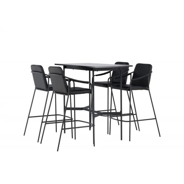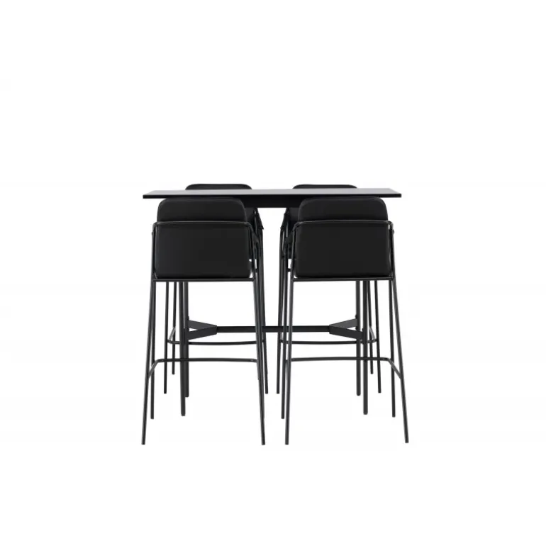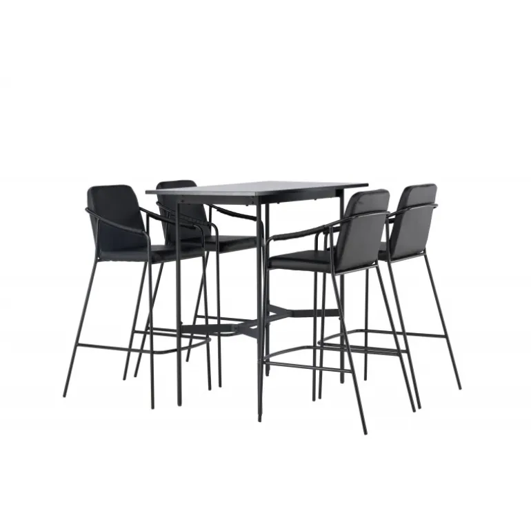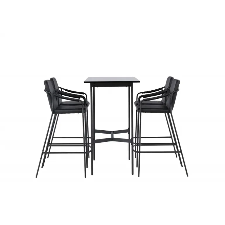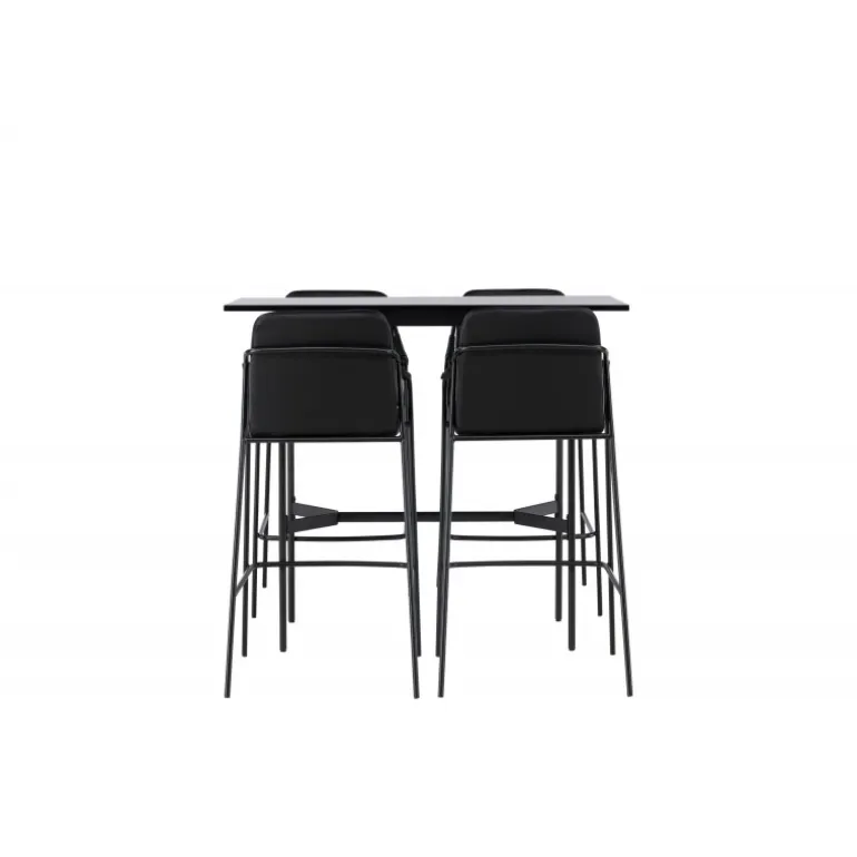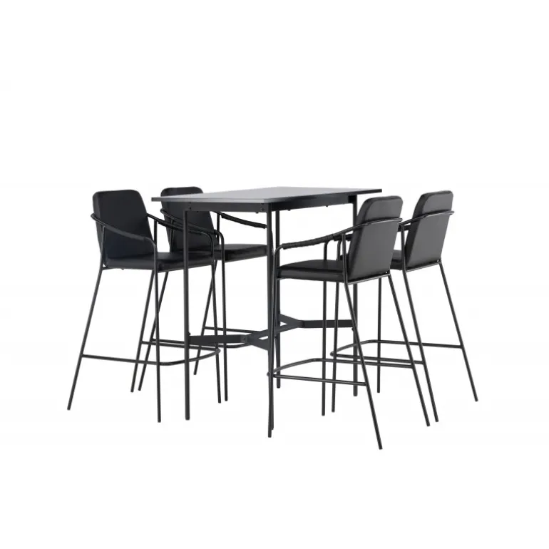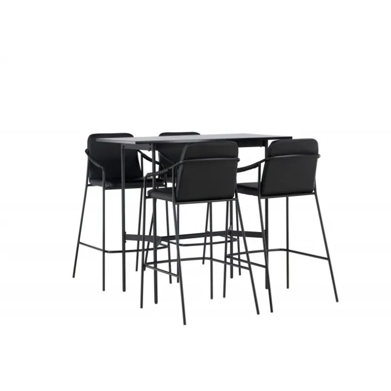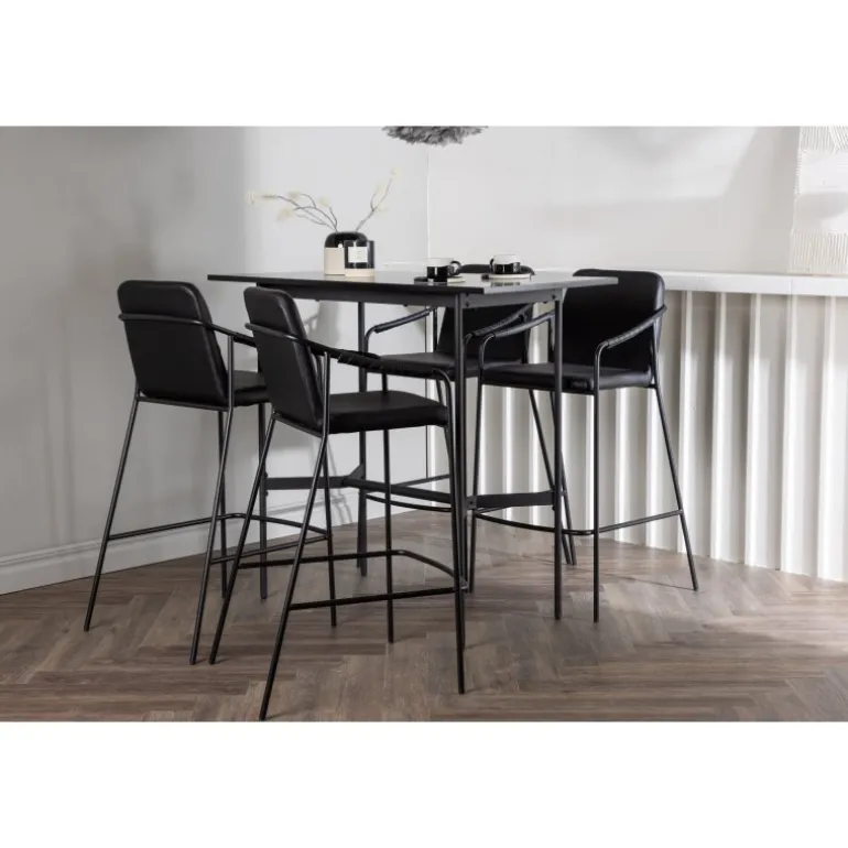 En kombination skabt til hinanden! Den minimalistiske barbord Rax har en tynd bordplade i sort MDF og smalle bordben med integreret fodstøtte i sort metal. Her sammen med sorte barstole fra serien Tvist. Stolen har en polstret sæde og fuldt polstret design i sort PU med minimalistiske stoleben og integrerede armlæn i sort stål. Det industrielle look er fremragende både i køkkenet og i stuen! Bordmål: 120x60cm.