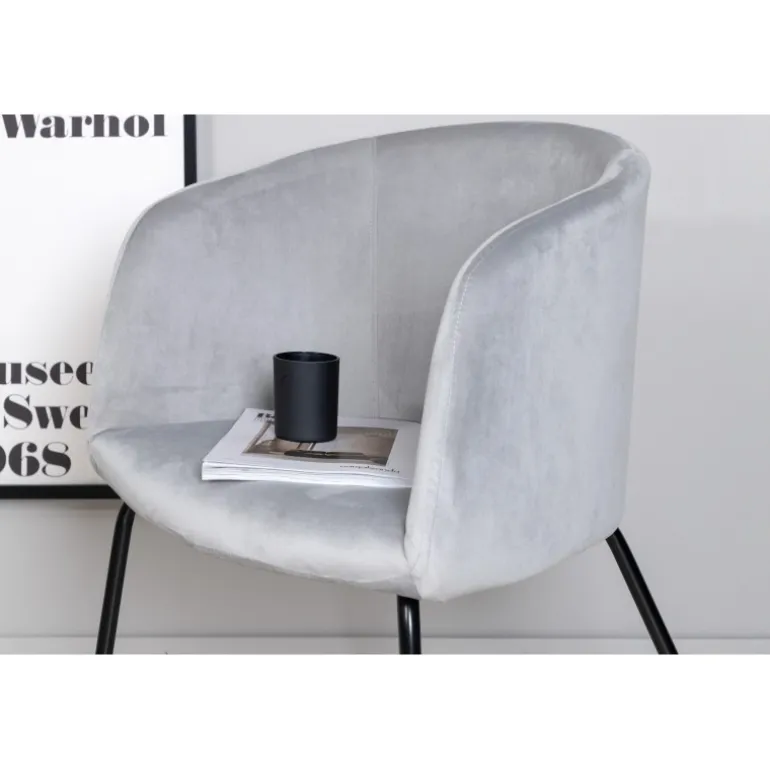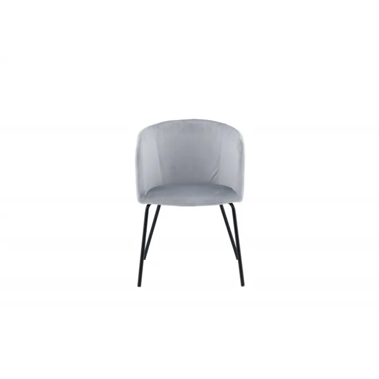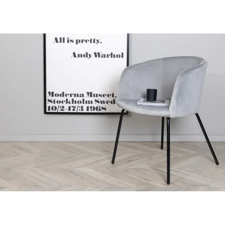 En tidløs favorit i moderne design – Berit imponerer med sit gennemtænkte design og behagelige grå farve! Denne spisebordsstol har et fuldt polstret design med en blidt afrundet ryg og sæde i velourstof og polyester lærred, samt slanke stoleben i sort jern – garanteret at være både stilfuld og komfortabel. Skab et indbydende og hyggeligt look og nyd dejlige øjeblikke omkring spisebordet sammen! Nogle samling kræves. Plejeinstruktioner: Velour har tendens til at udvikle aftryk, når bunken ligger ned. Aftrykkene kan give stoffet et slidt udseende, hvilket er helt normalt for denne type materiale. Afhængigt af hvordan lyset falder, kan stoffet skifte i flere forskellige nuancer.