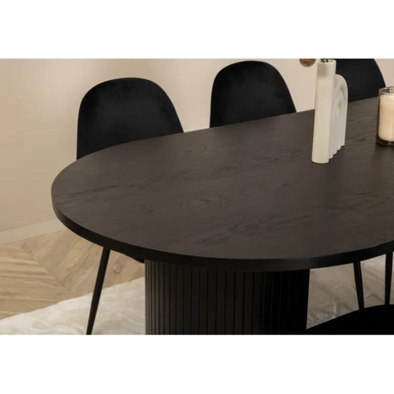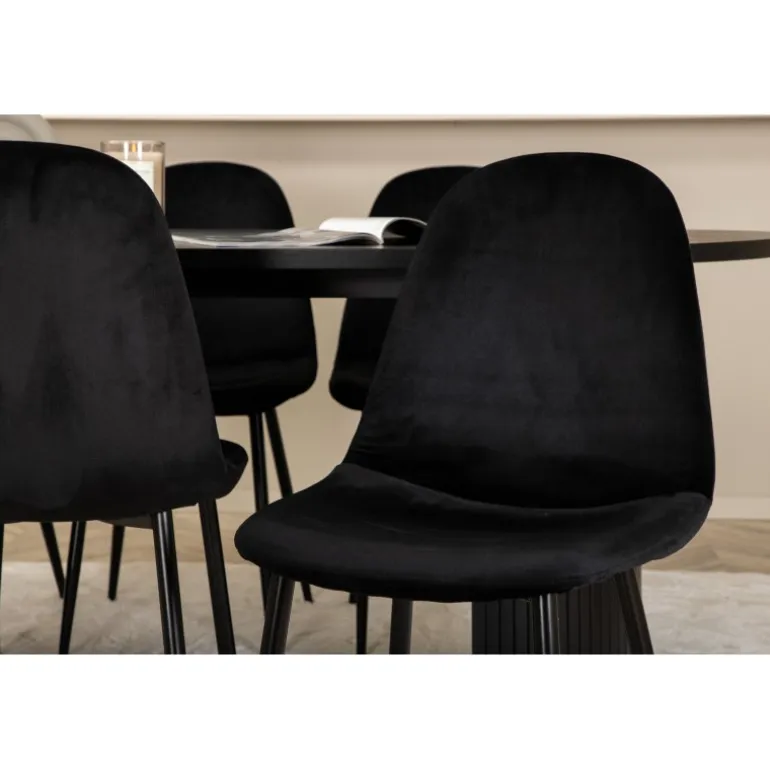 Oplev fællesskabet med stil – moderne, holdbart og iøjnefaldende! Vores ovale spisebord Bianca i gennemført sort farve har et trendy design med en MDF bordplade og en robust ramme i ribbed design, der giver et stabilt indtryk. Borddimensioner: Længde: 200cm, Bredde: 90cm, Højde: 75cm. Her i en lækker kombination af 6 Polar spisebordsstole med sorte metalben og sæder i sort fløjl, der giver en flot glans. Stoledimensioner: Højde: 87cm, sædehøjde: 45,5cm, bredde: 44cm, dybde: 53cm. Lad dette smukt matchede spisebordssæt med en moderne følelse blive et naturligt samlingspunkt i dit hjem.