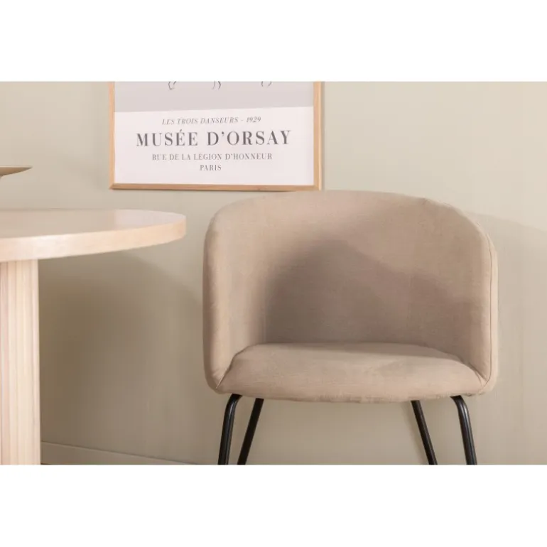 - Komfortable Stole: Blødt sæde i beige polyesterlinned og smalle sorte stoleben i jern.