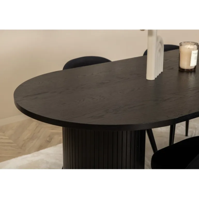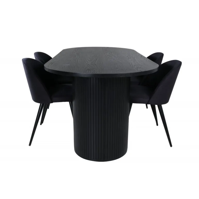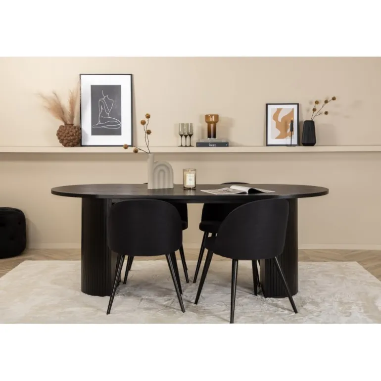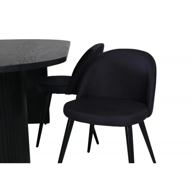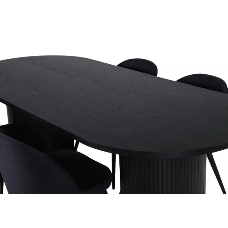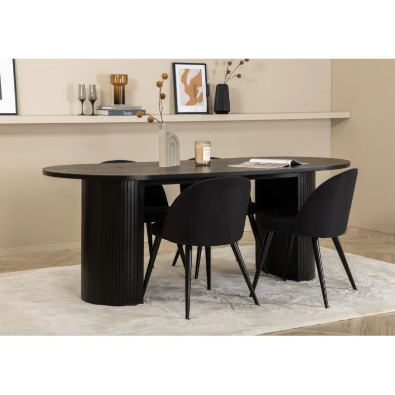 Sid behageligt og skab en moderne blikfang, der imponerer! Vores ovale spisestuebord Bianca i gennemgående sort farve har et trendy design med en MDF bordplade og en robust ramme i ribbet design, der giver et stabilt indtryk. Bordets dimensioner: Længde: 200 cm, Bredde: 90 cm, Højde: 75 cm. Matcher med 4 velour spisestole med sorte ben i metal og sæder i polyester. Stolens dimensioner: Højde: 76,5 cm, sædehøjde: 46,5 cm, bredde: 50 cm, dybde: 57 cm. Du behøver ikke at gå på kompromis mellem stil og komfort!
