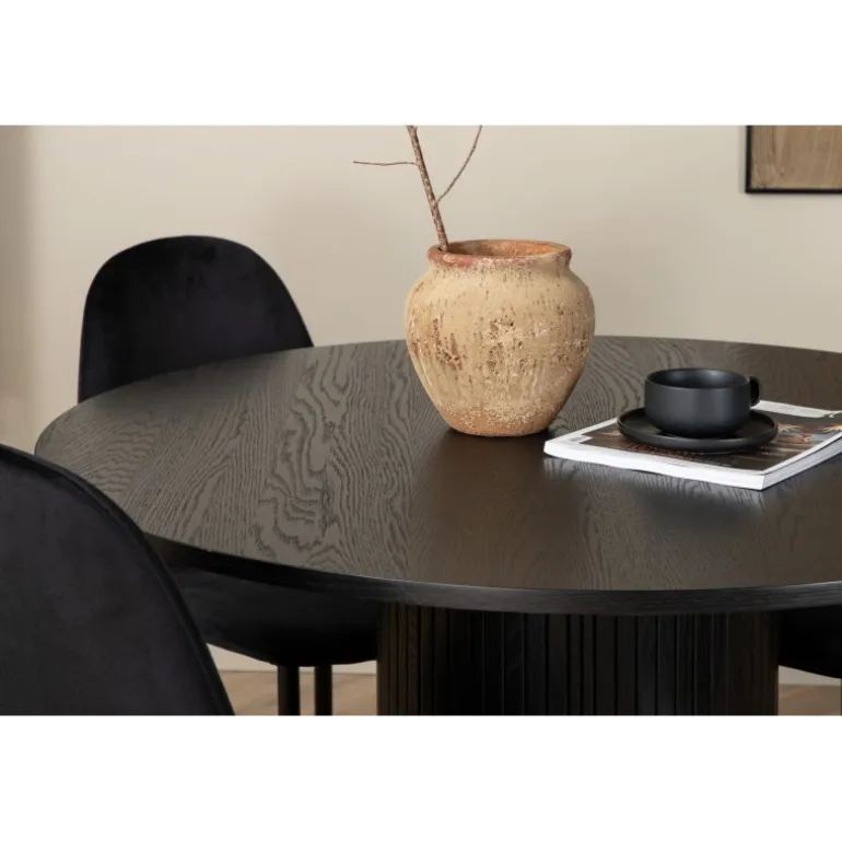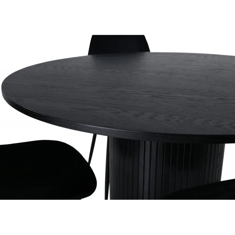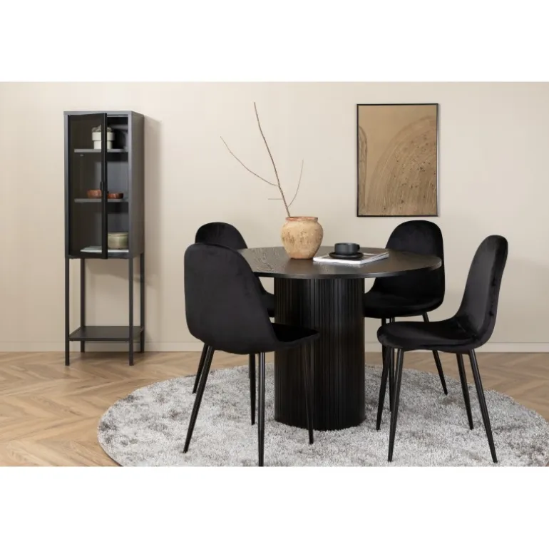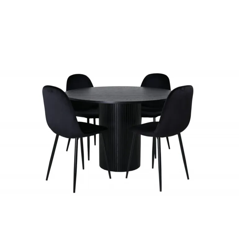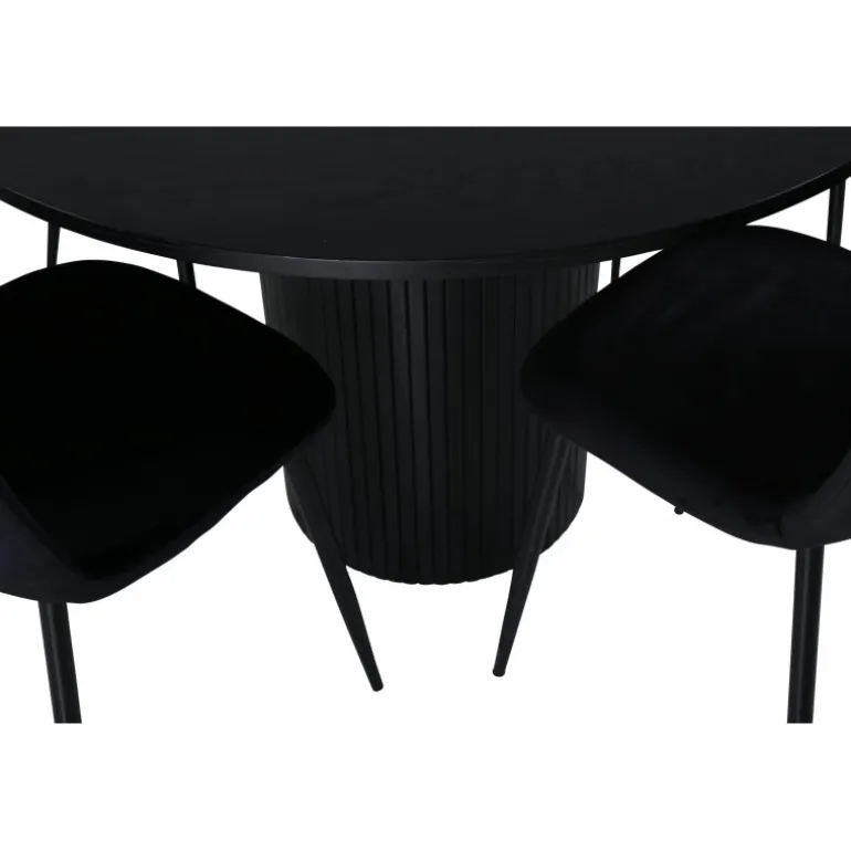 Stilfuldt og elegant – et sort spisebordssæt er let at matche og går aldrig af mode! Omkring vores runde spisebord Bianca skaber du en vidunderlig fællesskabsfølelse, hvor ingen risikerer at sidde på kanten. Bordpladen er lavet af MDF og har en cylinderformet ramme i solidt design og ribbet mønster. Den gennemgående sorte farve er lige så tidløs som den er stilfuld og nem at matche med anden indretning. Bordets diameter: 110 cm, højde: 74 cm. Det kombineres godt med 4 Polar spisestuestole i sort velourstof, som giver en fin glans og metalbensdesign. Stolens dimensioner: Højde: 88 cm, sædehøjde: 41,5 cm, bredde: 42,5 cm, dybde: 53,3 cm.
