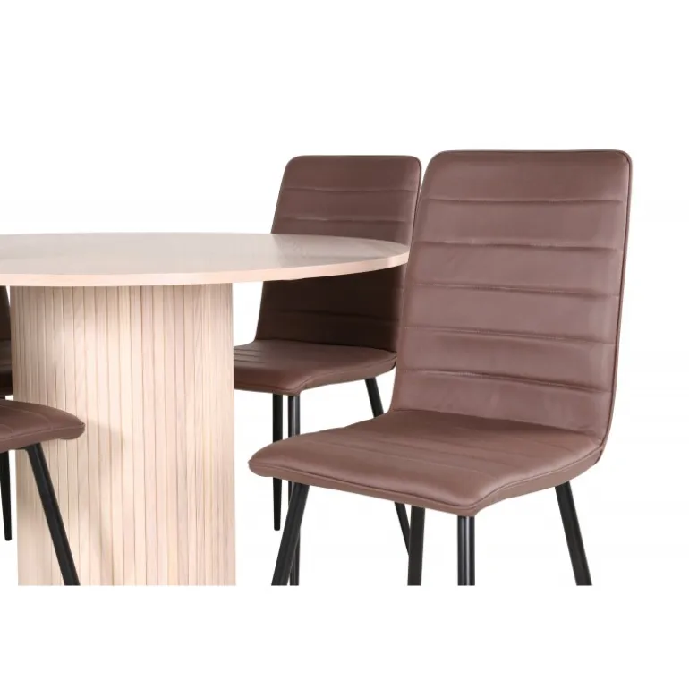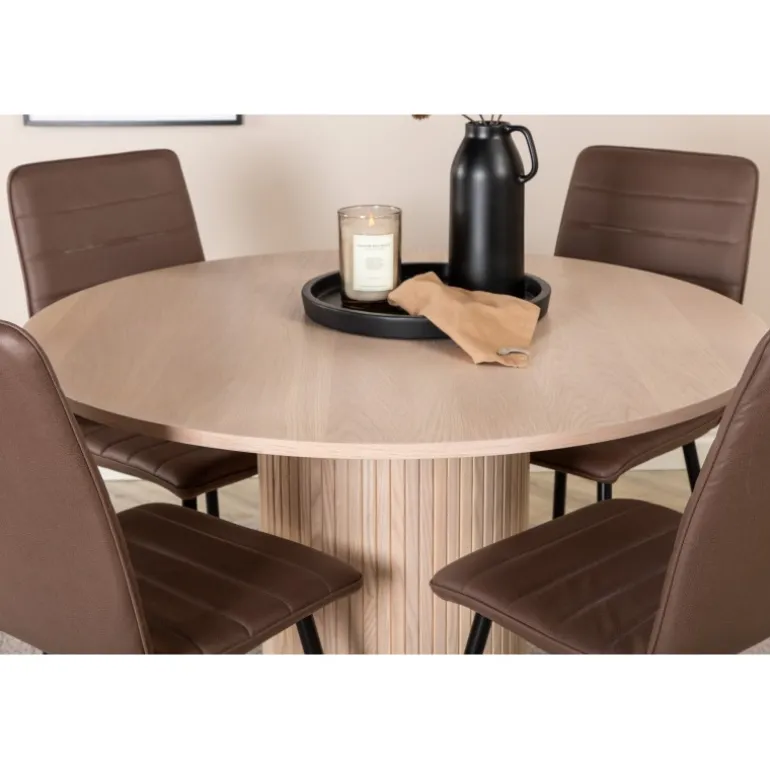 Indret stuen moderne og hyggelig med et charmerende rundt spisebordssæt! Rundt om vores Bianca spisebord skaber du et fantastisk fællesskab, hvor ingen risikerer at sidde på kanten. Bordpladen er lavet af MDF og har en cylinderformet ramme i robust design og ribbet mønster. Den konsekvent malede hvide farve er både tidløs og stilfuld, og er let at matche med anden indretning. Her i en lækker kombination med 4 spisestole fra Windu Luxury-serien. Sædet er i brun mikrofiber og stolebenene i sort jern. Skab en indbydende blikfang i hjemmets hjerte!