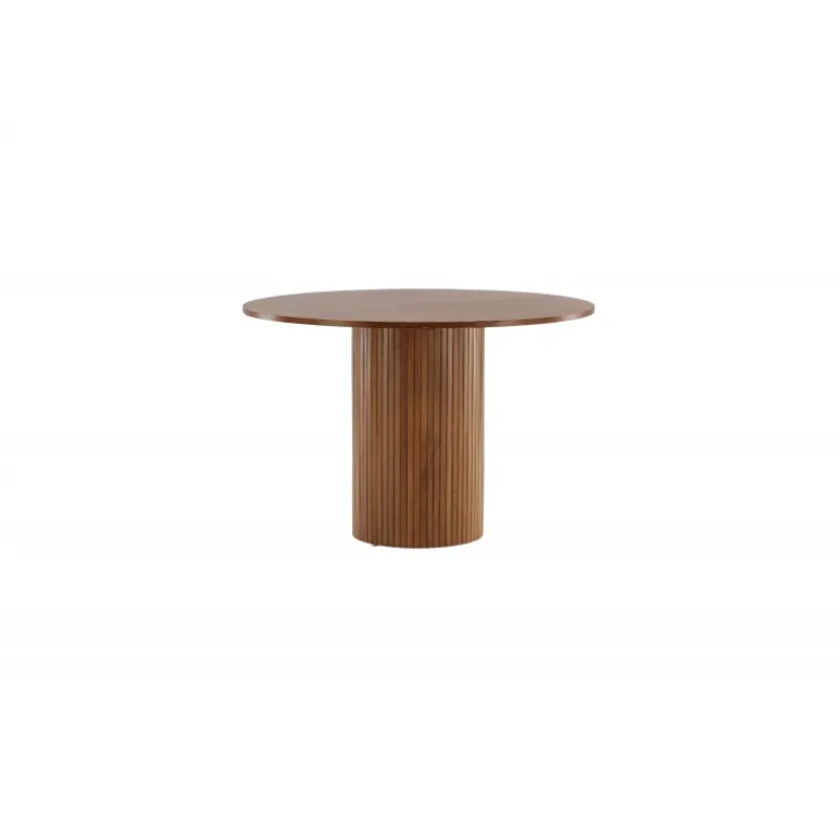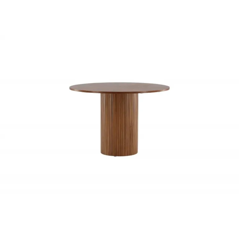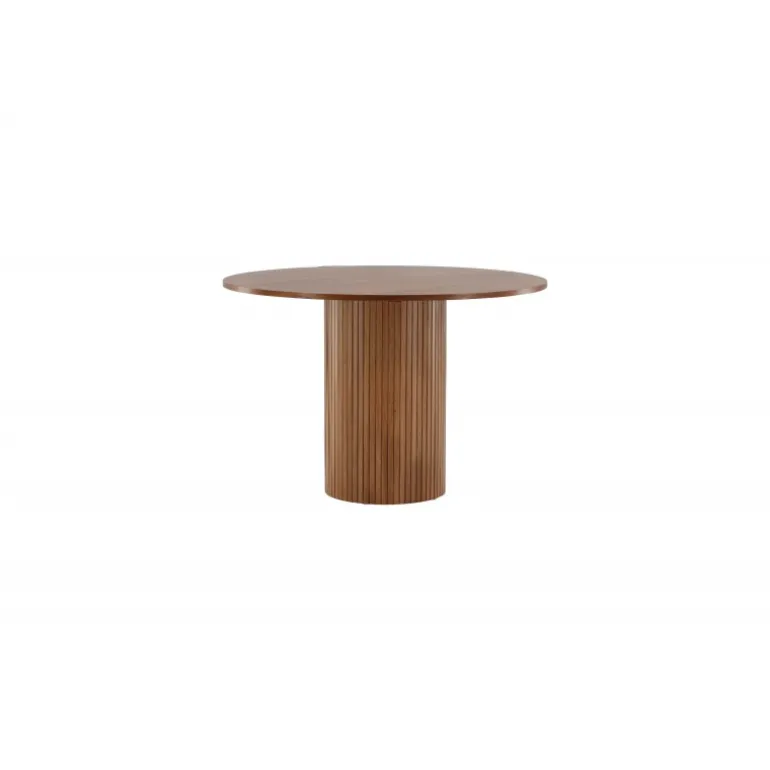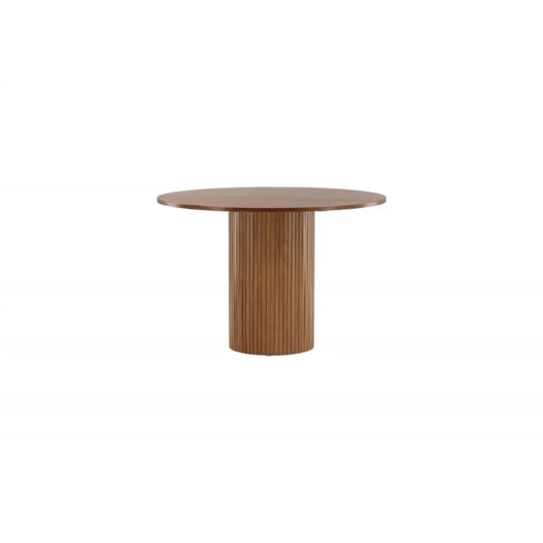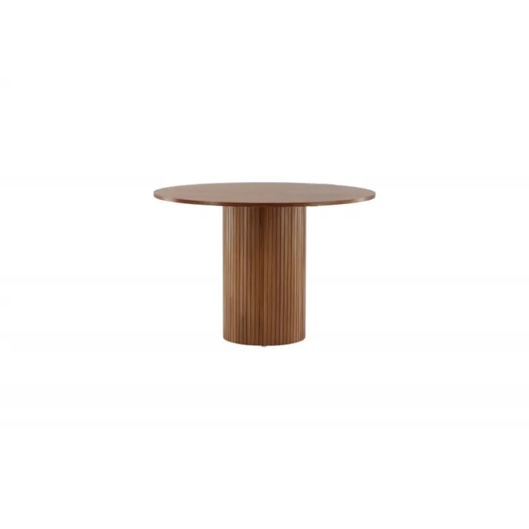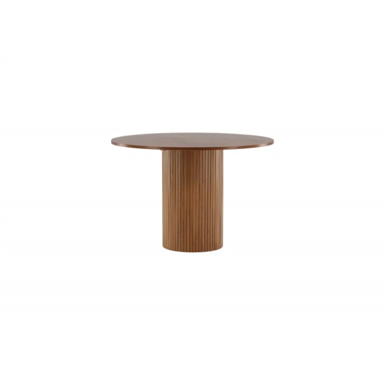 Skab en fantastisk atmosfære med vores runde spisebord Bianca i et moderigtigt design! Rundt spisebordpladen er lavet af MDF og har en cylinderformet ramme i robust konstruktion og ribbet design. Den trendy valnøddefarve er både tidløs og stilfuld og let at matche med anden indretning. Forbedr din boligindretning og gør måltiderne til dagens højdepunkt! Plejevejledning: MDF-skiver, der er malede eller lakerede, er følsomme overfor ridser og skader. Vær derfor forsigtig med overfladerne for at undgå dette. Overflader malet med lak med farvepigment eller maling har en pigmentering, der giver en ikke-dækkende, gennemsigtig overflade.