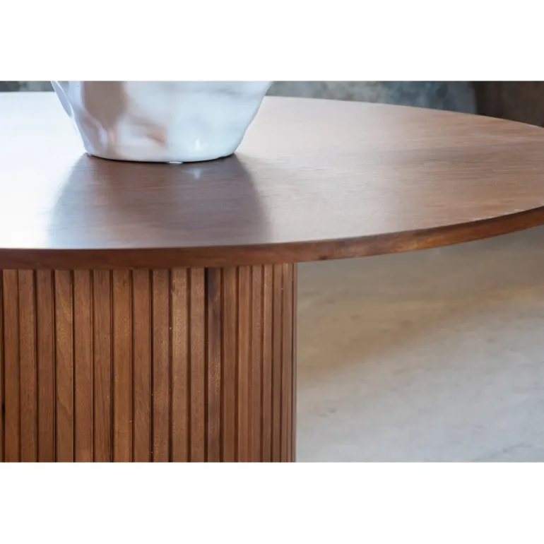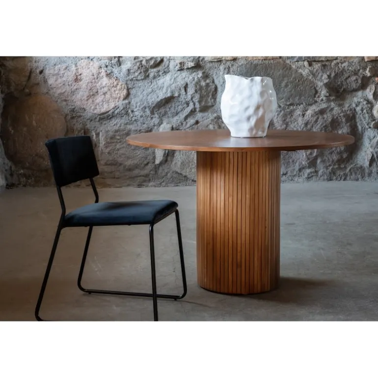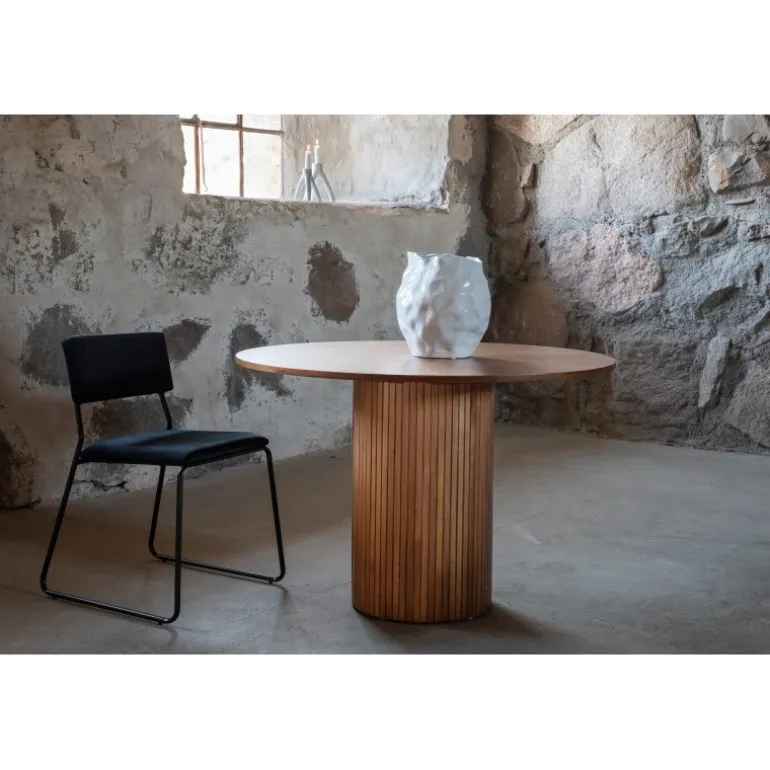 - Design: Rundt bord med cylinderformet ramme og ribbet design.