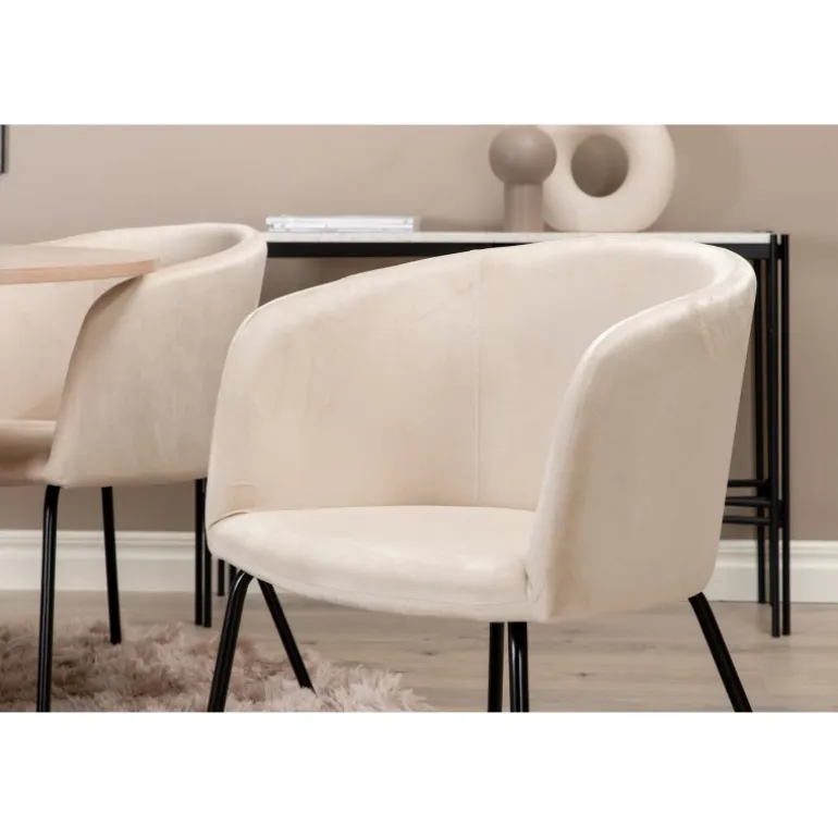 - Luksuriøse Stole: Berit stole med beige sæde i blødt velourstof og smalle ben i jern.