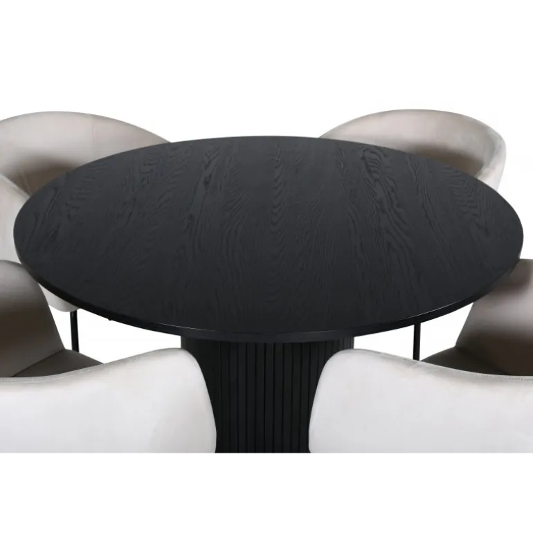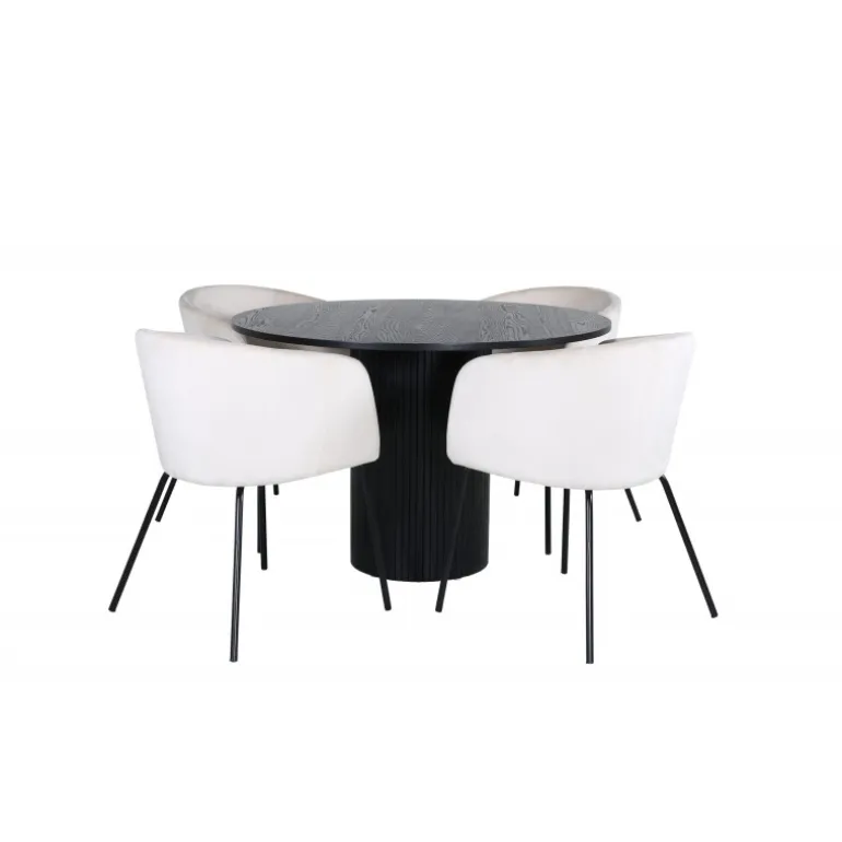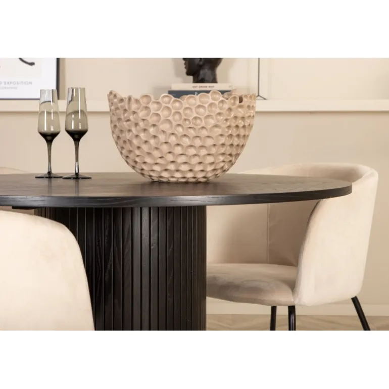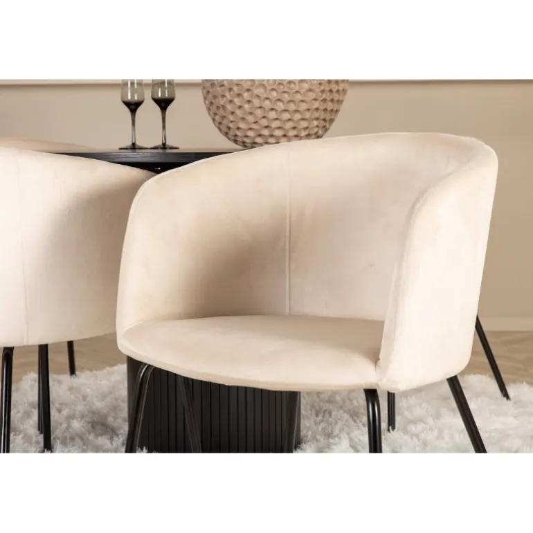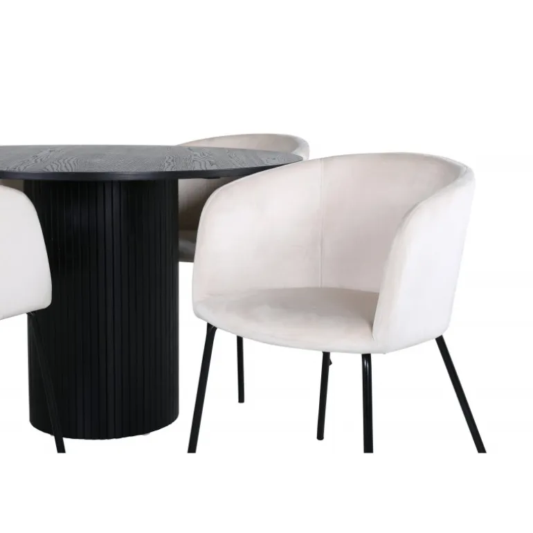 Moderne, stilfuldt og pompøst – skab et luksuriøst blikfang i hjemmets hjerte! Vores runde spisestuebord Bianca i gennemgående sort farve har et trendy design med en MDF bordplade og en robust ramme i ribbet design, der giver et solidt indtryk. Her i perfekt kombination med 4 Berit spisestuestole i luksuriøst design. Stolen har et pompøst design i beige fløjl og stolebenene er stilfuldt smalle i sort jern. Indret inviterende og skab et stilfuldt look i dit hjem!