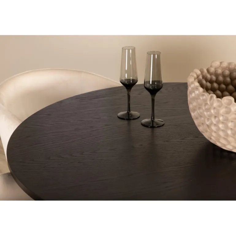 - Luksuriøse stole: Berit spisestuestole i beige fløjl med sorte jernben giver et pompøst og elegant udtryk.