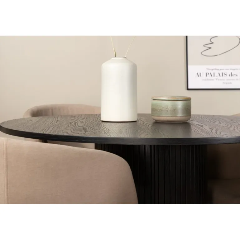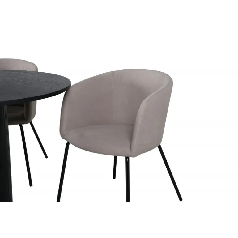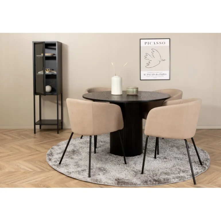 Indret din stue charmerende og indbydende med et rundt Spisebordssæt! Med vores runde spisebord Bianca skaber du en vidunderlig fællesskabsfølelse, hvor ingen risikerer at sidde på kanten. Bordpladen er lavet af MDF og har en cylinderformet ramme i robust design og ribbet udformning. Den gennemgående sorte farve er både tidløs og stilfuld og nem at matche med anden indretning. Bordets diameter: 110 cm, højde: 74 cm. Kombineres godt med 4 Berit spisebordsstole i luksuriøst design. Sædet er pompøst i beige polyester linned, og stolens ben er slanke i sort jern. Stolens dimensioner: Højde: 78 cm, sædehøjde: 49 cm, bredde: 55 cm, dybde: 55 cm.