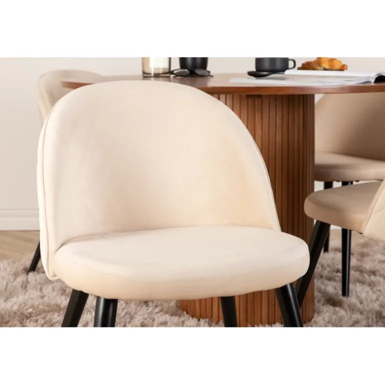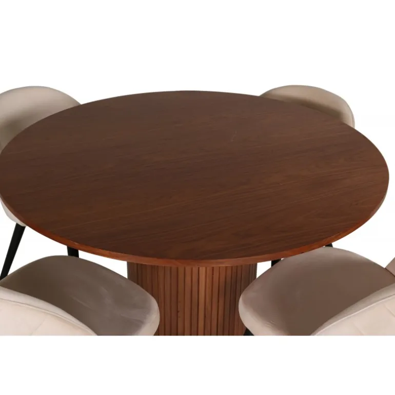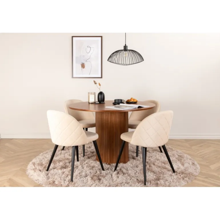Skab en indbydende blikfang i hjemmets hjerte! Vores runde spisebord, Bianca, i trendy valnødfarver passer perfekt i både stuen og det rummelige køkken. Bordpladen er lavet af valnødfarvet MDF med finér, og kroppen er robust i valnød samt sort træ og MDF i et ribbet design, der giver et stabilt indtryk. Her sammen med 4 af vores populære spisebordsstole Velvet Stitches, som bidrager til en flot helhed i stuen. Stolens ben er let udspredte i sort jern, og de beige fløjlsæder giver en flot glans til rummet. Nyd behagelige måltider!