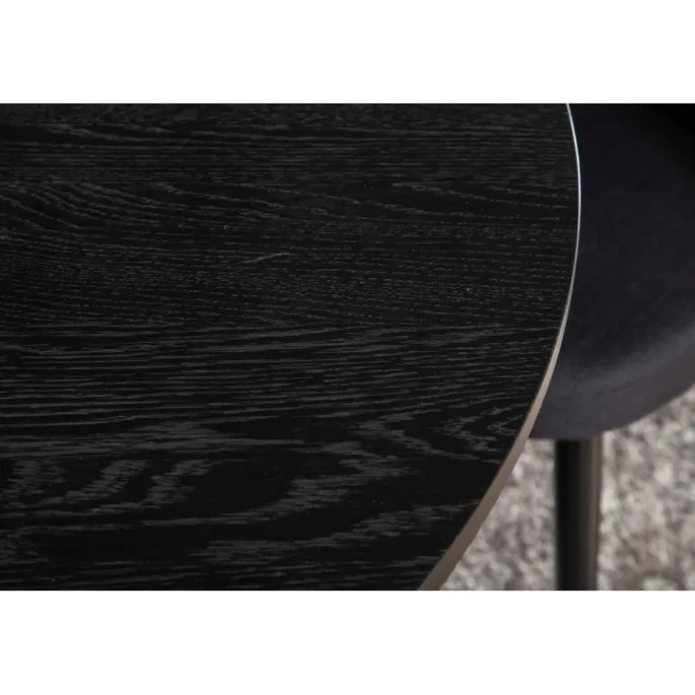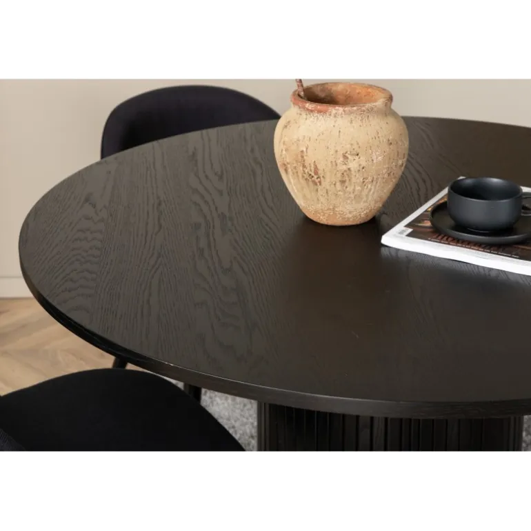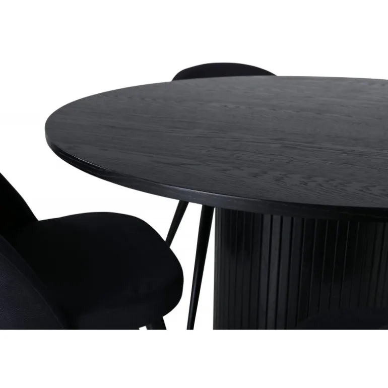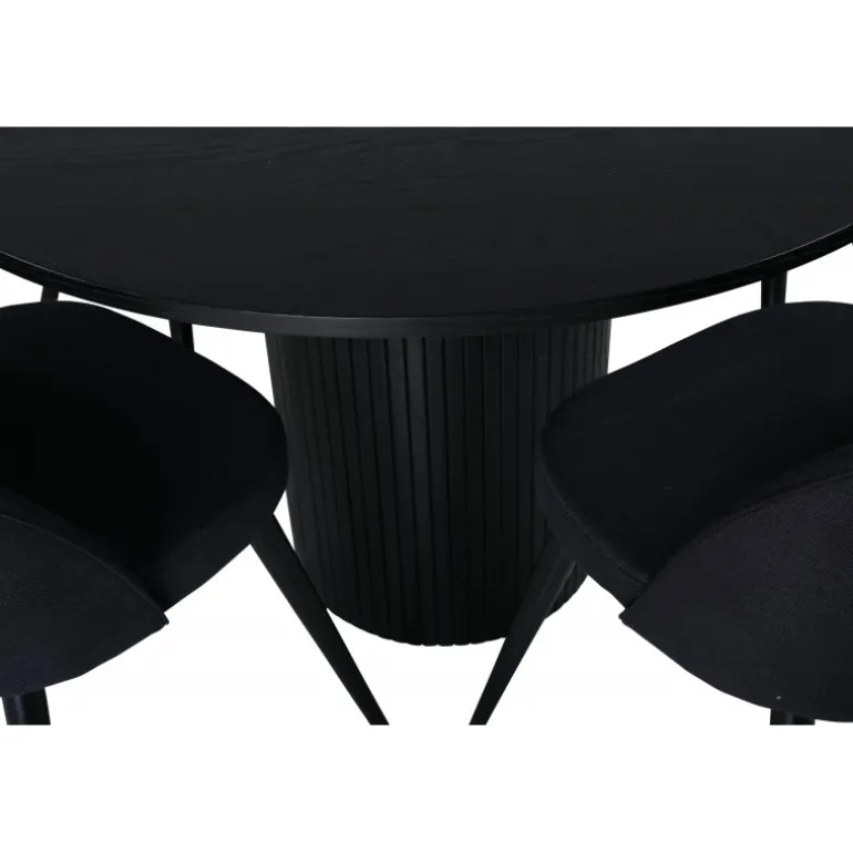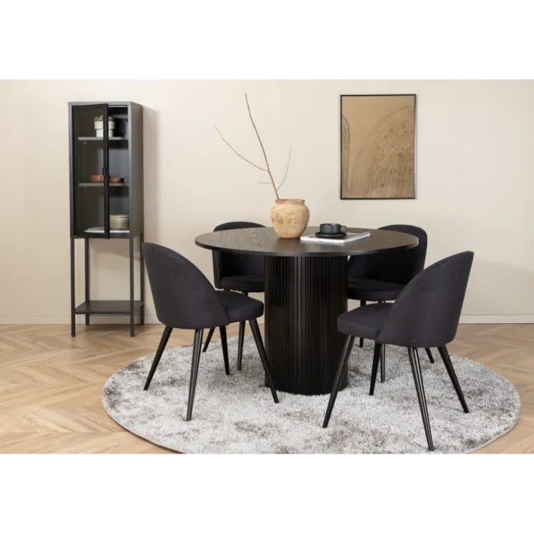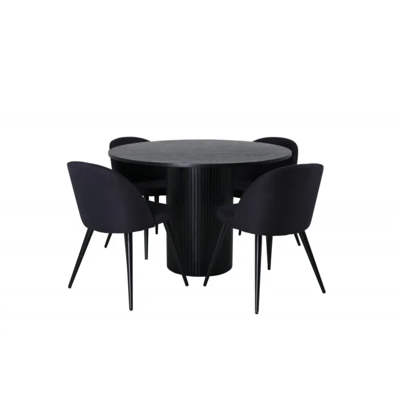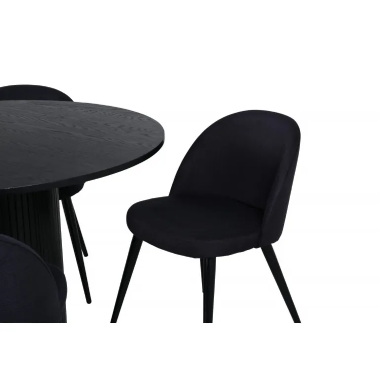 En lækkert matchende Spisebordssæt i moderne design – hvad mere kan man ønske sig? Omkring vores runde spisebord Bianca skaber du et vidunderligt fællesskab, hvor ingen risikerer at sidde på kanten. Bordpladen er lavet af MDF og har en cylinderformet ramme i robust design og ribbet design. Den konsekvent sorte farve er lige så tidløs som stilfuld og nem at matche med anden indretning. Bordets diameter: 110 cm, højde: 74 cm. Kombineres perfekt med 4 fløjls spisestuestole med flared ben i sort metal og sæder i polyester. Stolens dimensioner: højde: 76,5 cm, sædehøjde: 46,5 cm, bredde: 50 cm, dybde: 57 cm. Du behøver ikke at gå på kompromis mellem stil og komfort!
