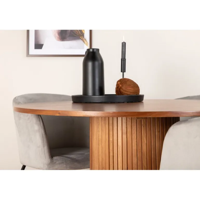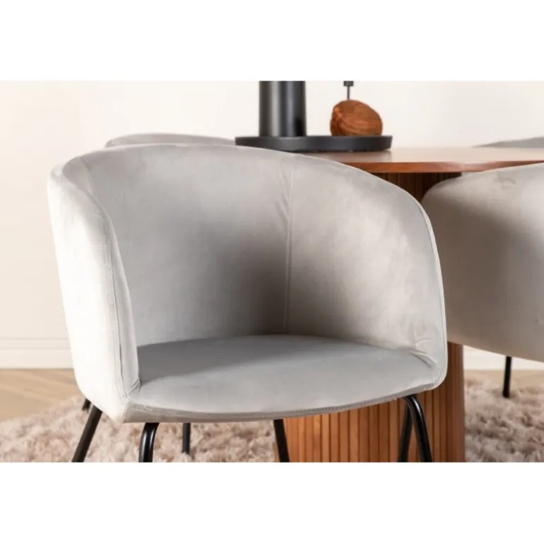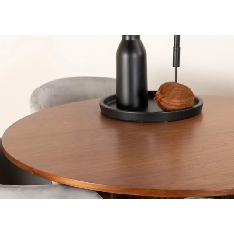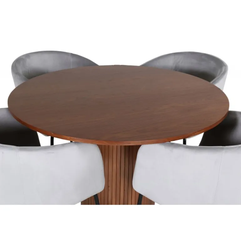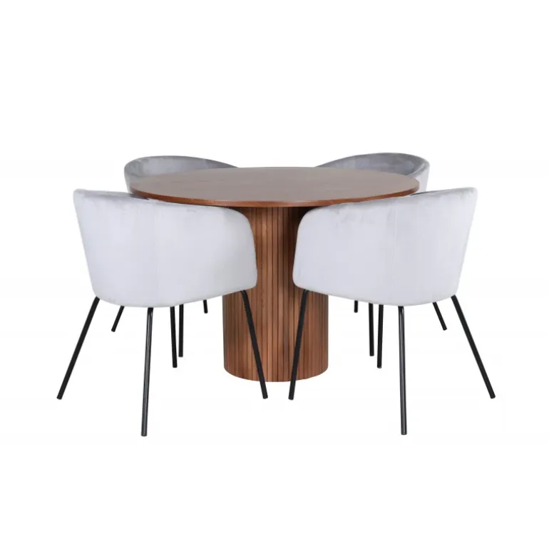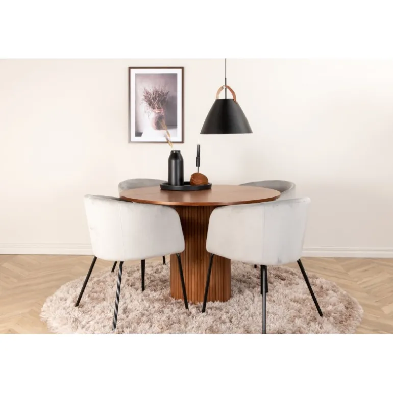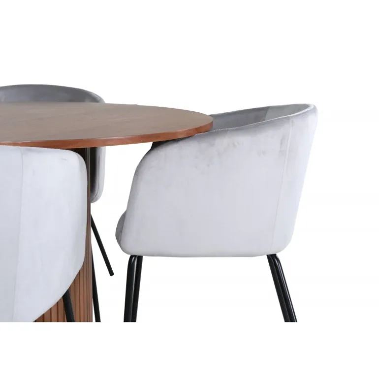 Tilføj et moderne touch til din boligindretning med vores Bianca rund Spisebordssæt. Dette stilfulde og elegante sæt passer perfekt både i stuen og det rummelige køkken. Bordpladen er lavet af MDF med valnøddefinér, og stellet kombinerer valnød og sort træ samt MDF i et ribbet design, der giver et solidt indtryk. Sættet inkluderer også 4 Berit spisebordsstole i et luksuriøst design. Sædet er blødt i lysegrå fløjl, og stolens ben er stilfuldt smalle i sort jern. Skab en indbydende blikfang i hjemmets hjerte!