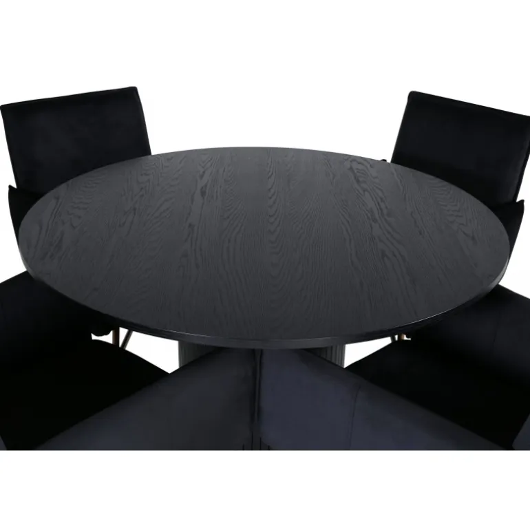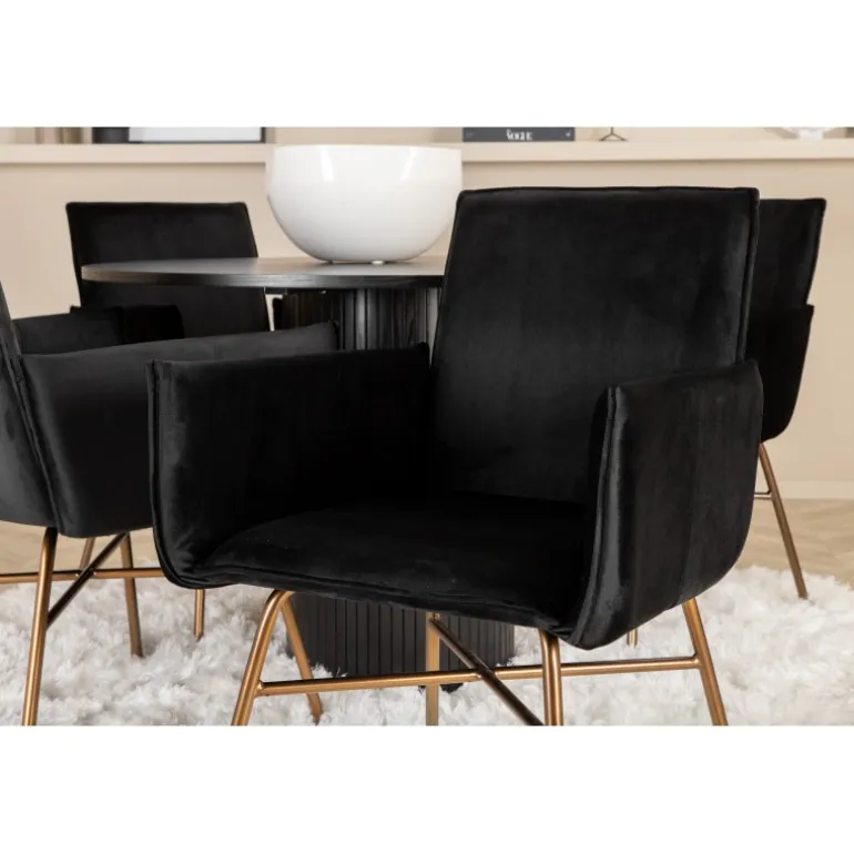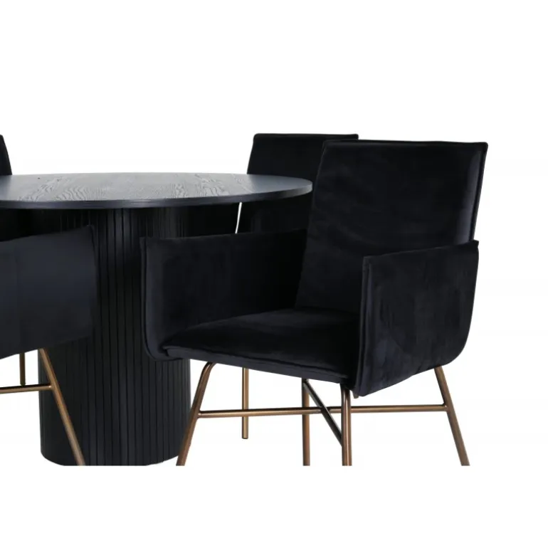 Skab et luksuriøst blikfang med et Spisebordssæt, der udstråler elegance og komfort! Vores runde spisebord Bianca i konsekvent sort farve har et trendy design med en MDF bordplade og en robust ramme i ribbet design, der giver et stabilt indtryk. Her i perfekt kombination med 4 Petra spisebordsstole i slankt design. Stolebenene er stilfuldt smalle i kobberfarvet jern, og sædet i sort fløjl, som giver en flot glans. Kom hjem til en indbydende atmosfære og behageligt spisemiljø!
