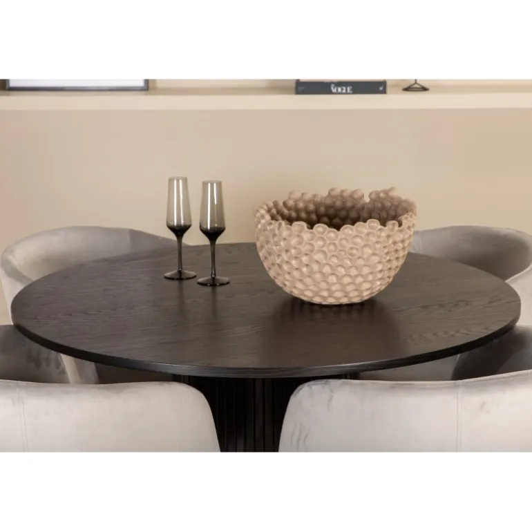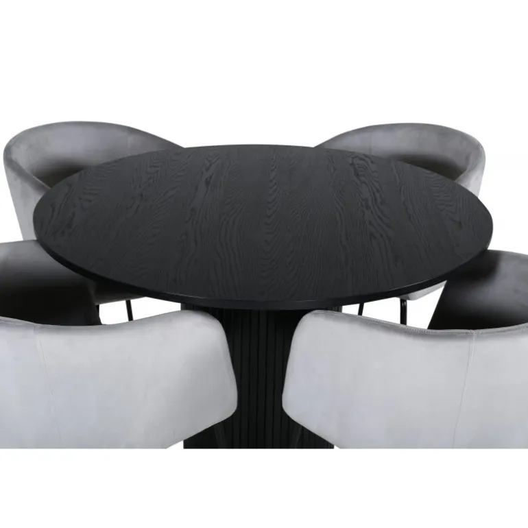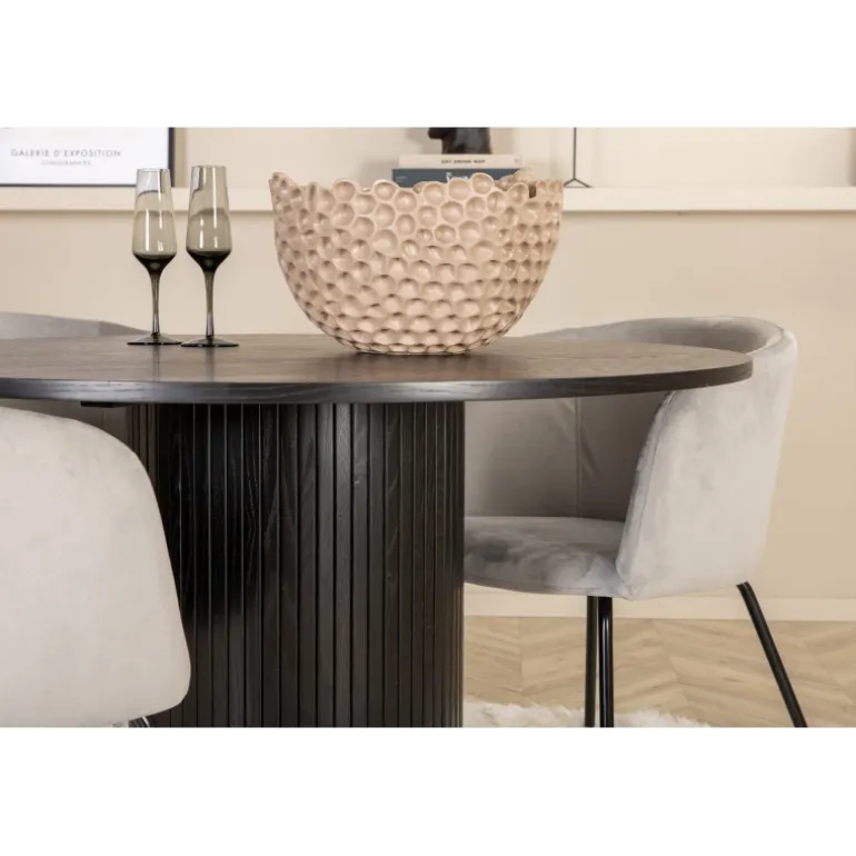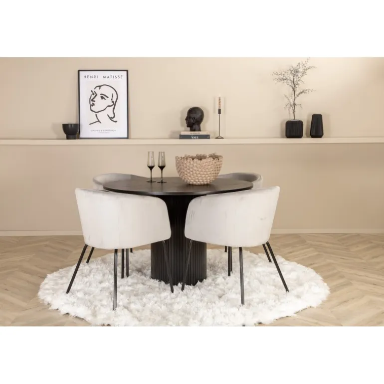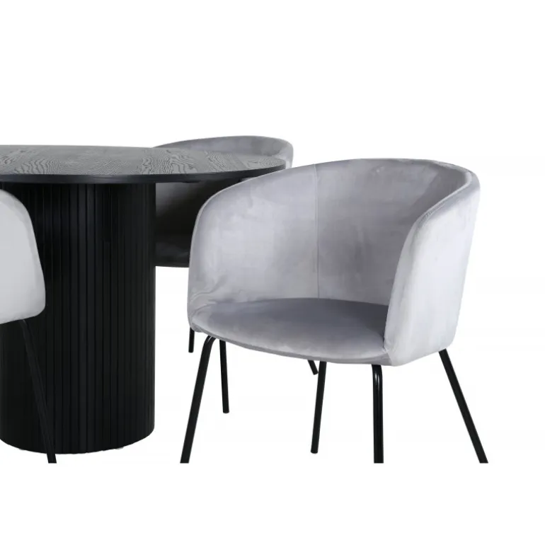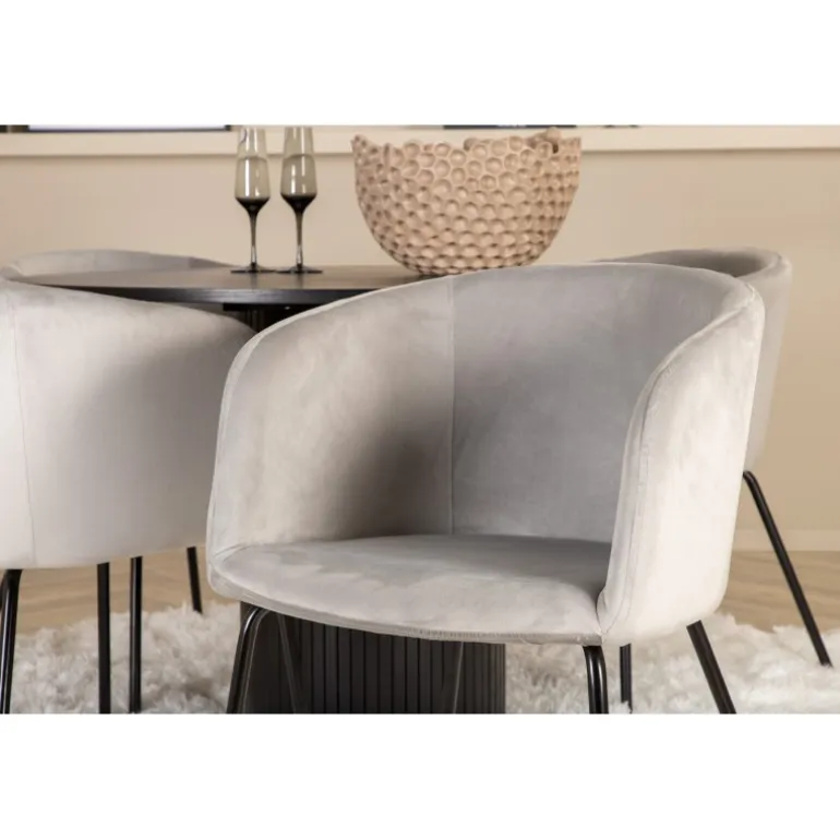 Moderne, stilfuldt og pompøst – skab en luksuriøs blikfang i hjertet af dit hjem! Vores runde spisebord Bianca i gennemgående sort farve har et trendy design med en MDF-bordplade og en robust ramme i rillet design, der giver et stabilt indtryk. Her i perfekt kombination med 4 Berit spisestole i luksuriøst design. Stolen har et pompøst design i smagfuld grå velour og stolbenene er stilfuldt smalle i sort jern. Indret indbydende og skab et stilfuldt look i dit hjem!