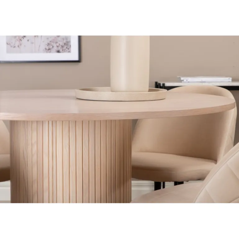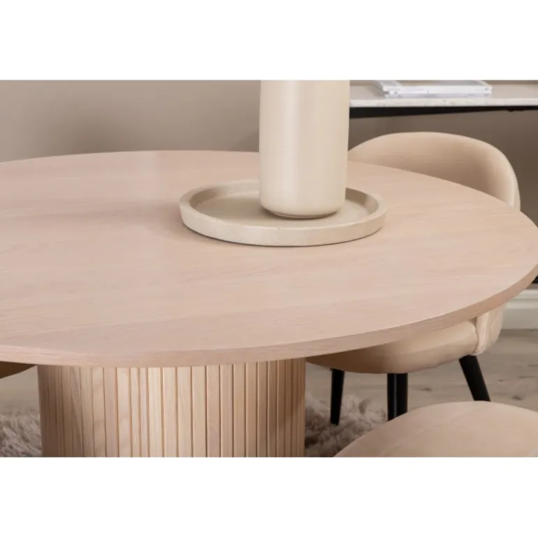 Oplev en perfekt kombination af stil og komfort med Bianca Rundt Spisestuesæt. Saml familie og venner omkring det runde spisebord, hvor ingen risikerer at sidde på kanten. Bordpladen er lavet af MDF med en cylinderformet ramme i et robust og ribbet design. Den gennemgående hvidvaskede farve er både tidløs og elegant, hvilket gør den nem at matche med anden indretning. Bordets diameter er 110 cm og højden er 74 cm. Sættet inkluderer også 4 behagelige spisestuestole fra Velvet-serien. Stolens ben er let flarede og lavet af jern, mens sædet er i blødt beige velourstof. Stolens dimensioner er: Højde: 76,5 cm, Sædehøjde: 46,5 cm, Bredde: 50 cm, Dybde: 57 cm. Lad hjemmets hjerte præges af din nye iøjnefaldende spisestuegruppe.