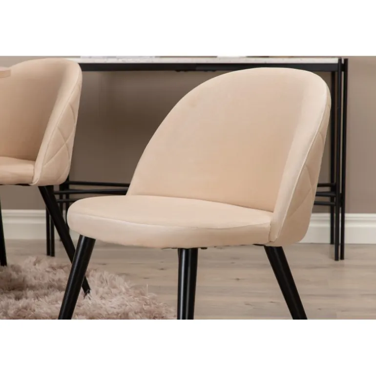 - Velvet spisestuestole: Sæt med 4 stole i blødt beige velourstof og jernben.