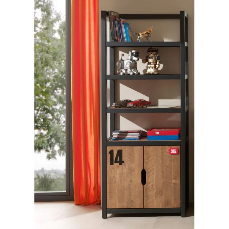 - Robust reol i massivt fyr med sort metal for et industrielt look