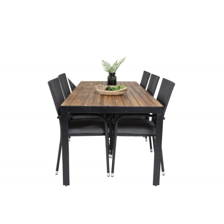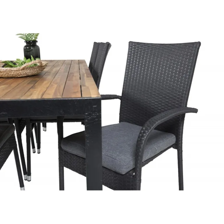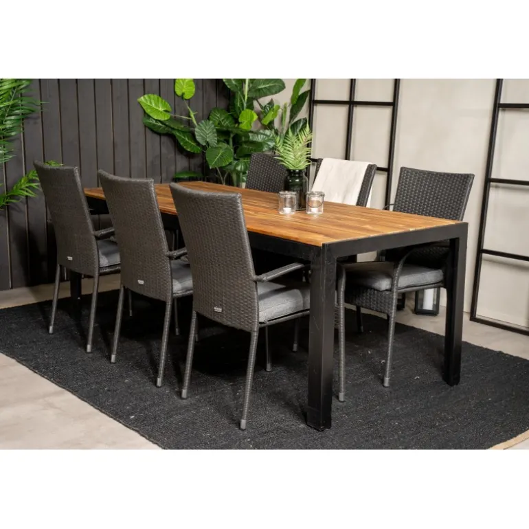 Kombinationen af forskellige farver og materialer skaber ofte enestående resultater. Med vores spisebord Bois og vores spisebordsstole Anna får du en kombination, der er moderne, hyggelig og tidløs! Dette udendørs Loungesæt – Havemøbelsæt er fremstillet af akacietræ, aluminium, rattan og stål, hvilket sikrer både holdbarhed og stil. Bordpladen i akacie tilføjer et naturligt touch, mens stolene i rattan og stål giver et moderne twist. Perfekt til enhver have eller terrasse, hvor du ønsker at skabe en indbydende atmosfære.