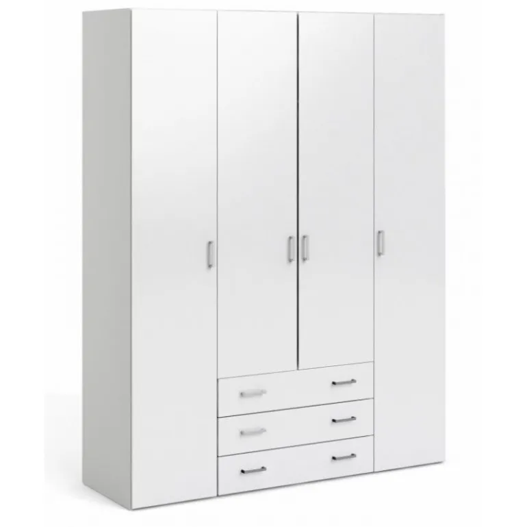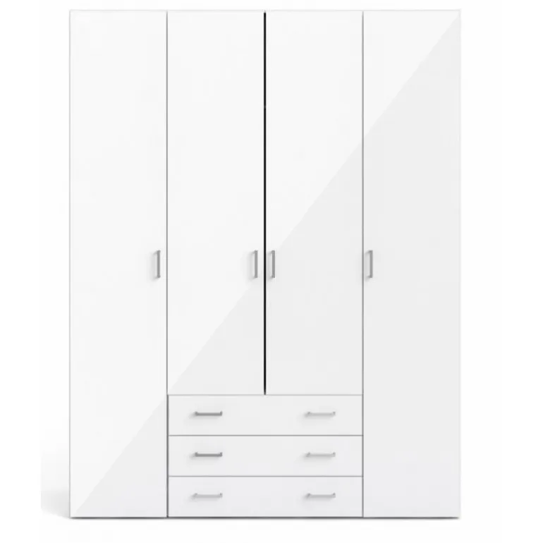 Stort Bolmen garderobeskab i hvid med låger i hvidhøjglans. 3 skuffer, 1 lang bøjlestang, 8 korte hylder & 1 lang hylde. Enkelt og stilrent klædeskab med masser af opbevaringsplads der vil passe ind i alle indretninger.