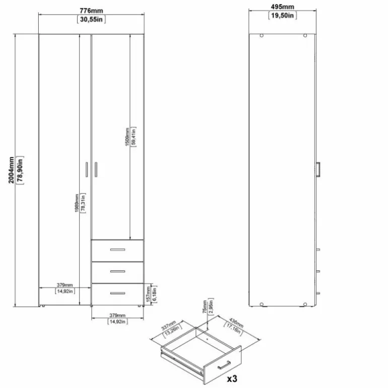 Enkelt og stilrent Bolmen garderobeskab i egstruktur med 3 skuffer, 1 bøjlestang & 4 hylder. Med dette klædeskab får du masser af opbevaringsplads til en fair pris.