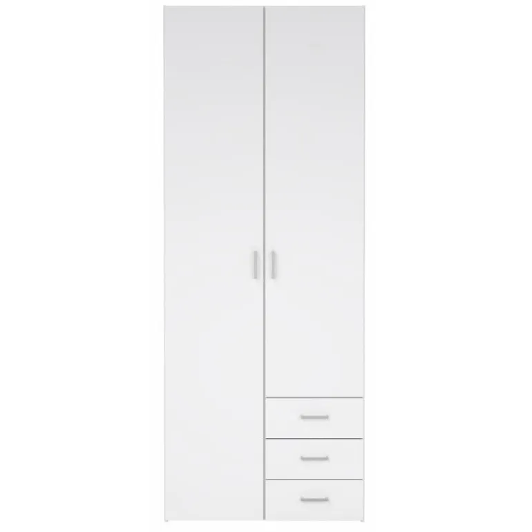 Bolmen garderobeskab med hvide højglanslåger med 3 skuffer, 1 bøjlestang & 4 hylder.