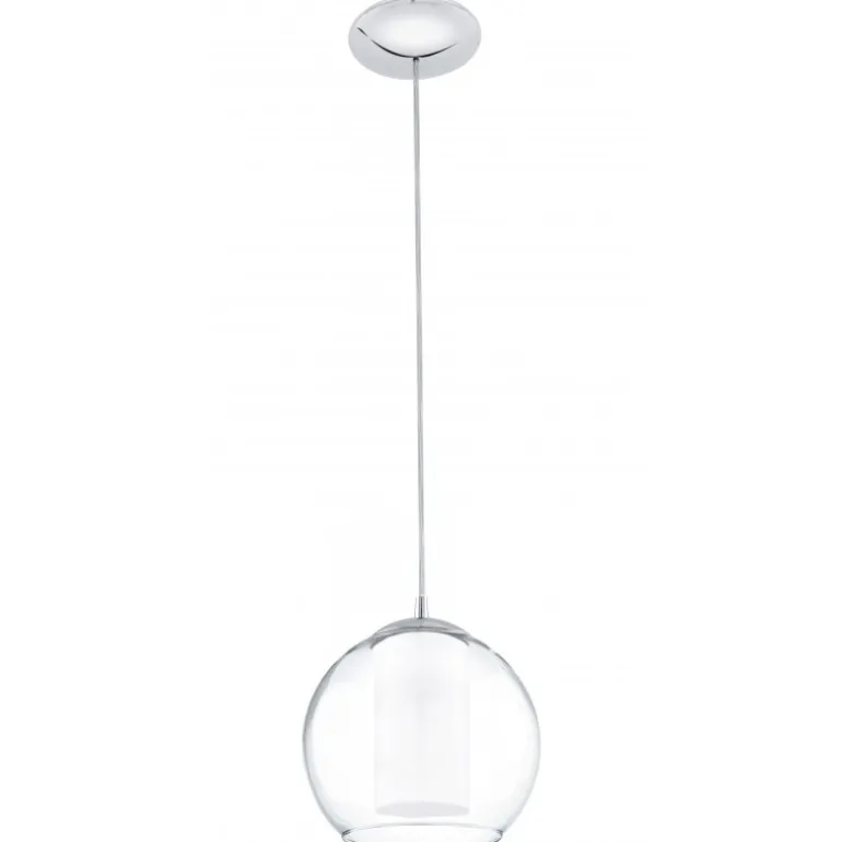 Elegant pendel med dobbelt glasskærm: Yderst en klar kugleformet glasskærm og inderst en cylinderformet satineret skærm, der bidrager til, at der sker en jævn fordeling af lyset fra lampen. En meget smuk lampe til det moderne hjem.