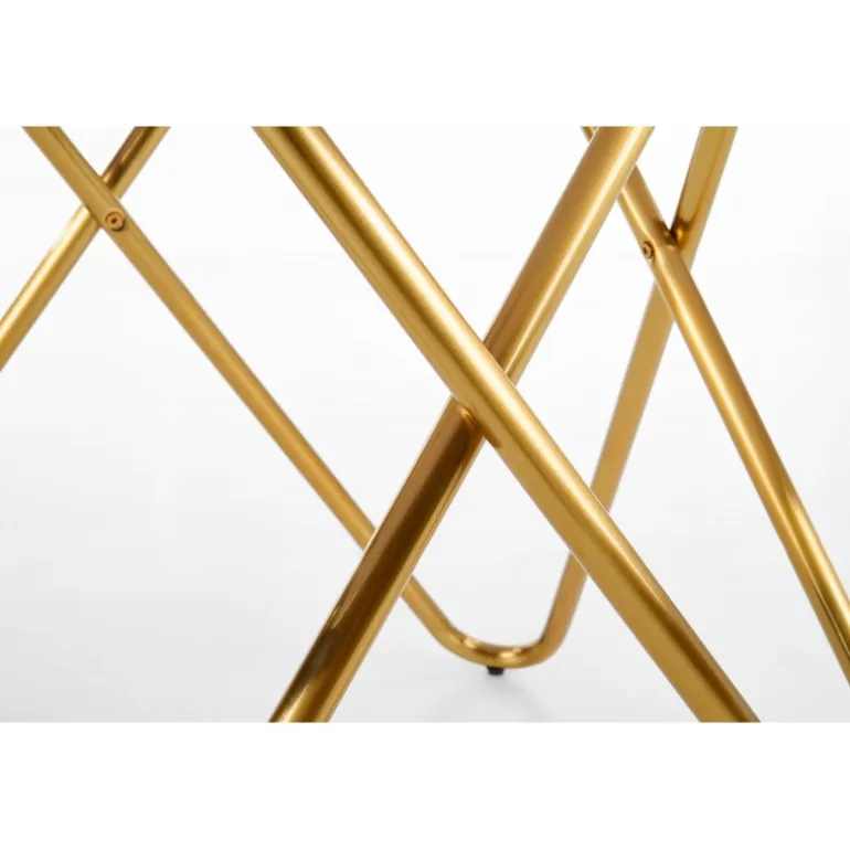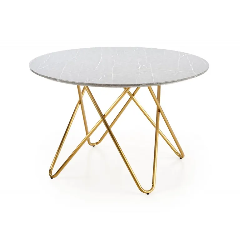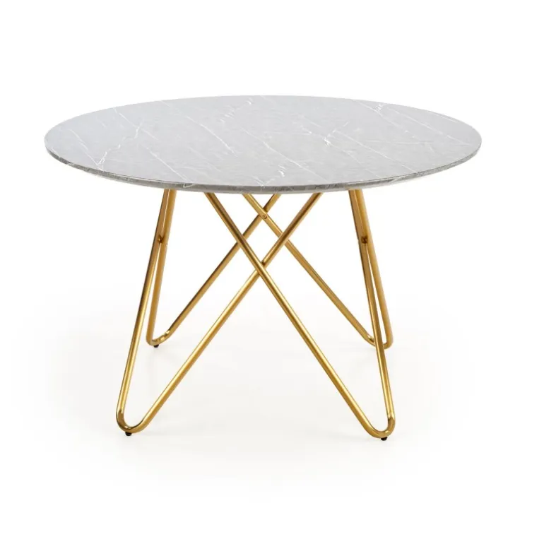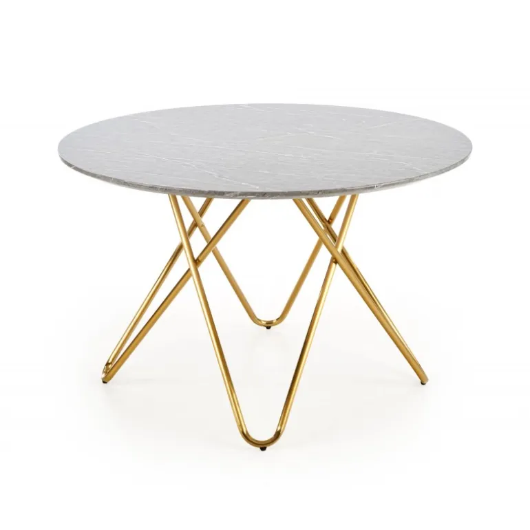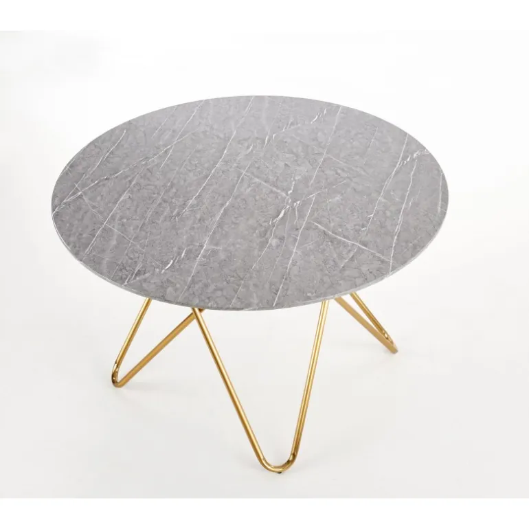 - Moderne design: Kombination af grå marmortop og gyldne ben.