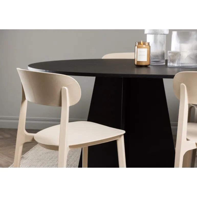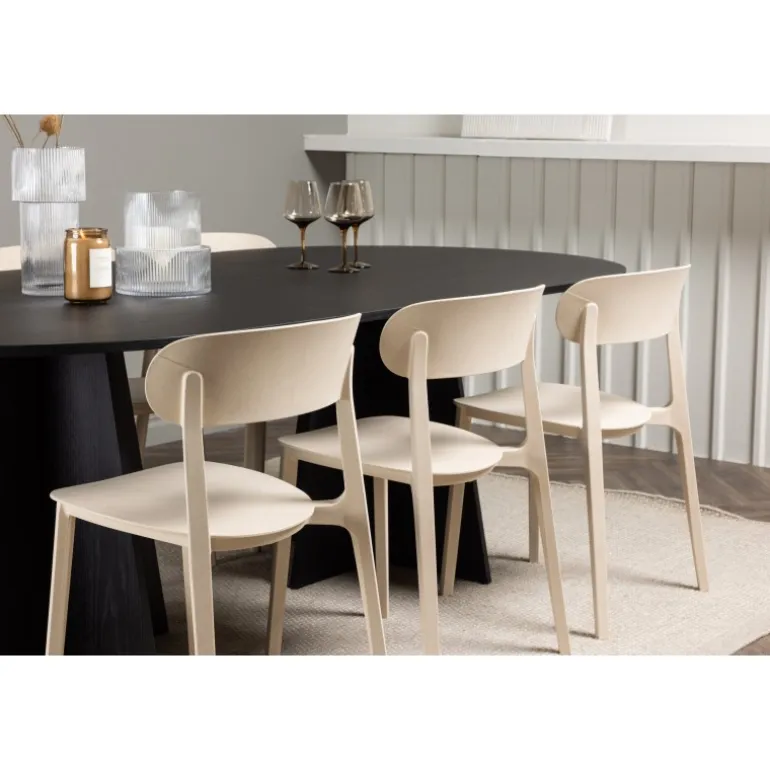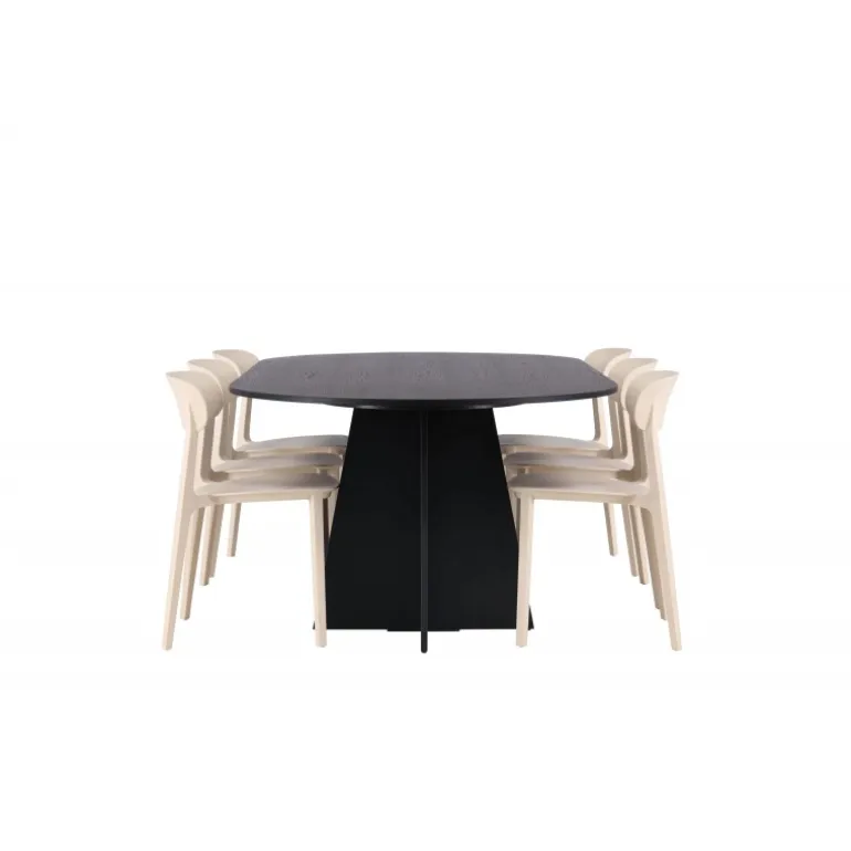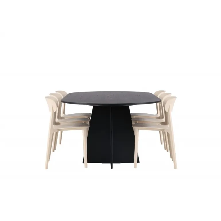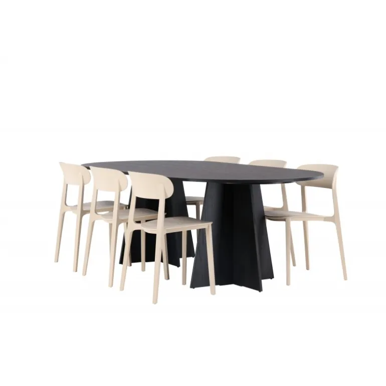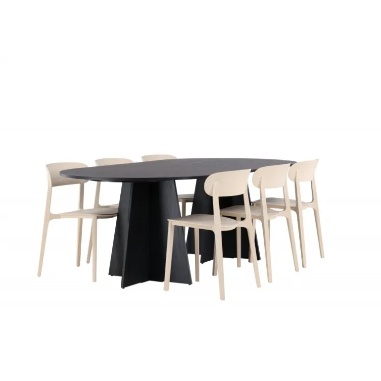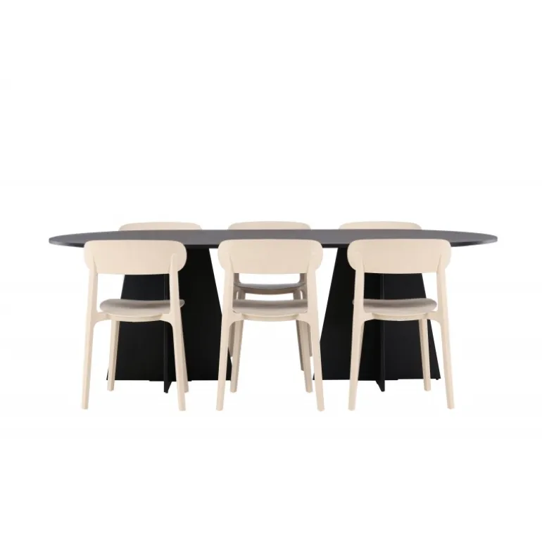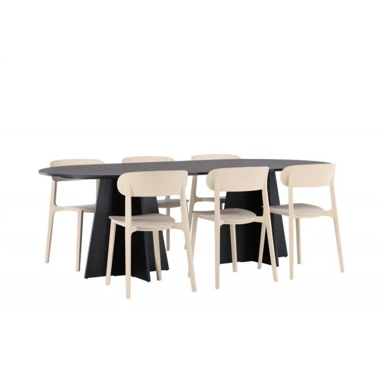 En skøn farvekombination i bæredygtigt træ! Vores ovale spisebord Bootcut har et unikt design med en oval bordplade i sort MDF med finer og en karakteristisk ramme med to kegleformede ben i åben design. Her i en slank kombination med træstole fra Åstol-serien. Stolen er konsekvent lavet i en smagfuld lyspoleret farve i trækombinat med et luftigt design og nordiske lige former. Indret stuen hjemligt! Bordmål: 230x115cm.