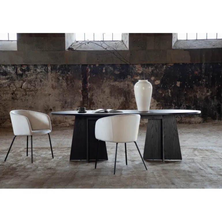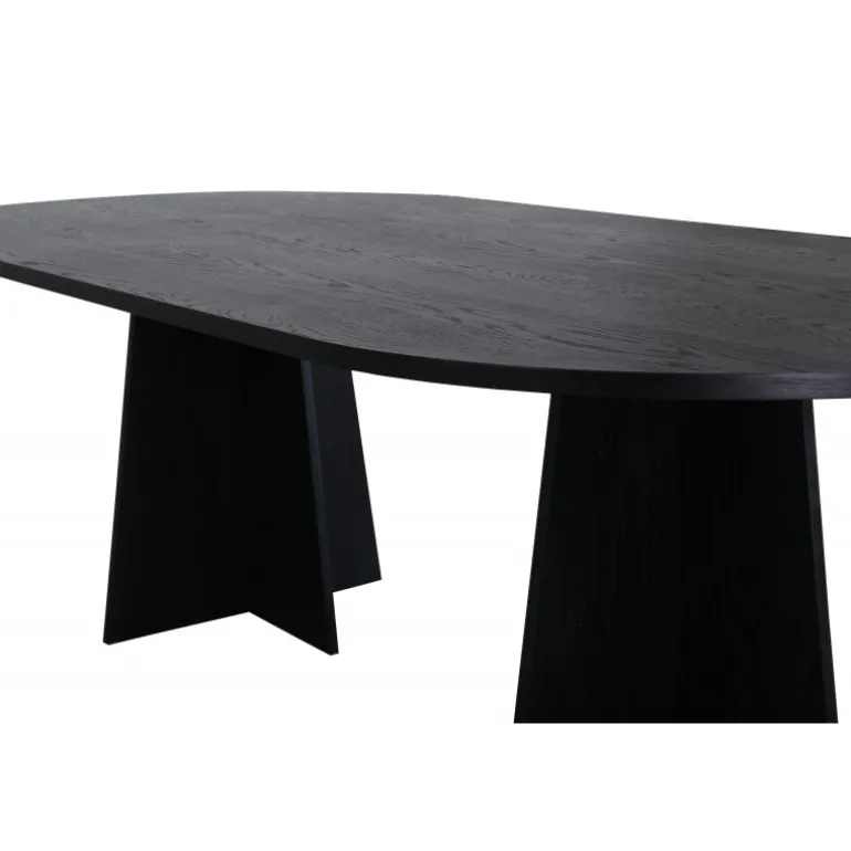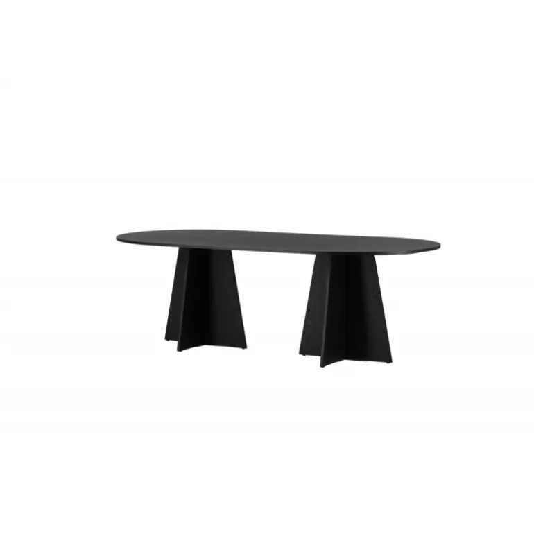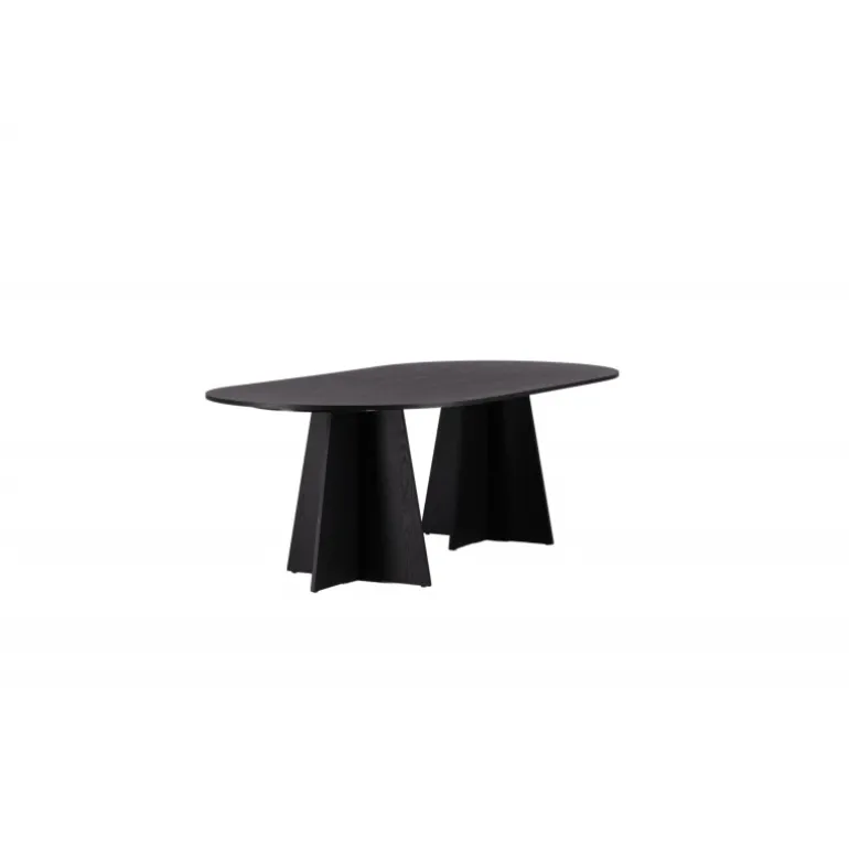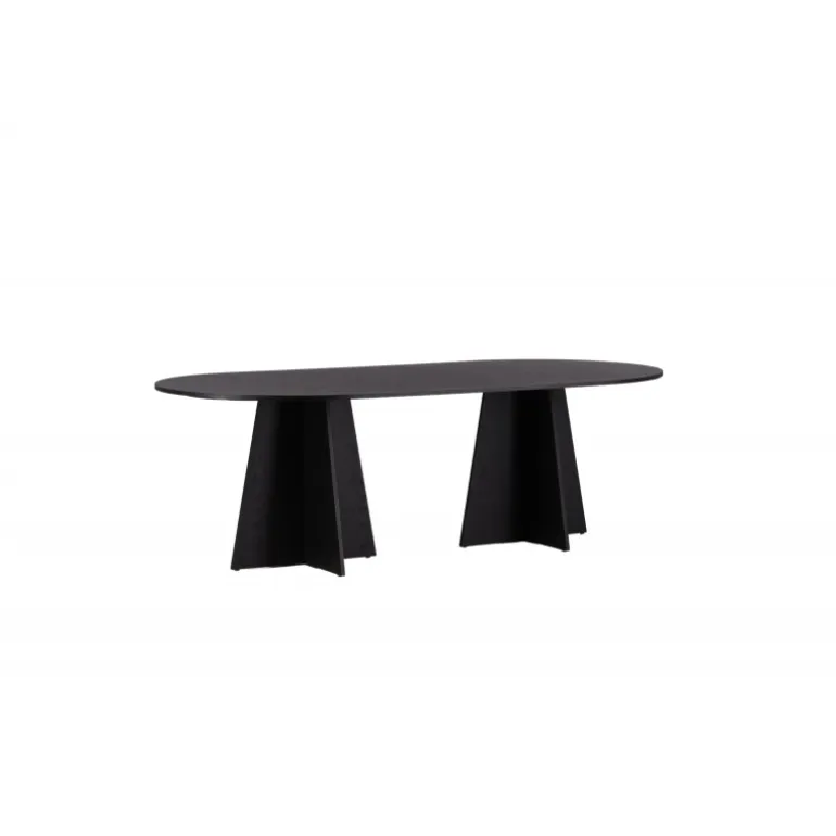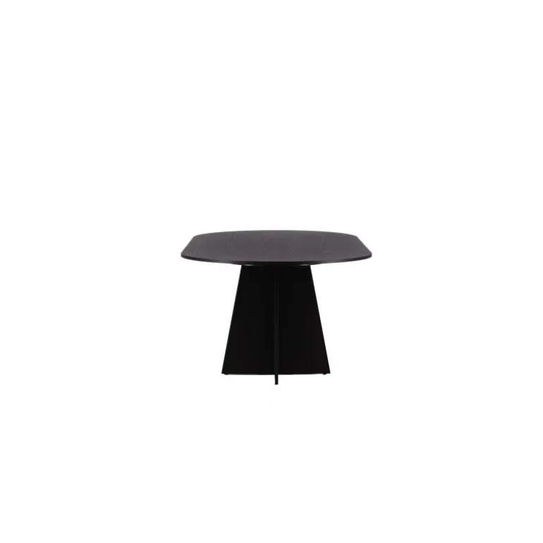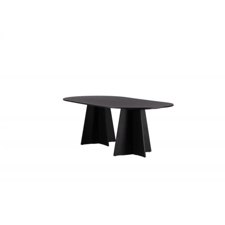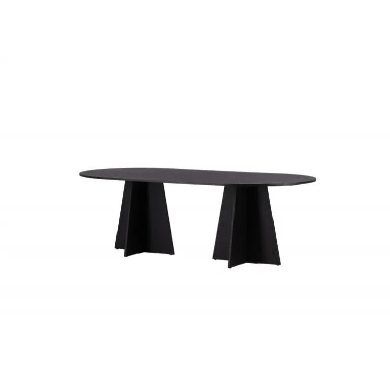 Indret dit hjem med et spisebord, der imponerer! Bootcut har et unikt design med en oval bordplade i sort MDF med finer og et særligt stel med to kegleformede ben i åben design. Den tynde bordplade skaber et minimalistisk indtryk og er en smagfuld kontrast til det mere robuste stel. Kombiner med et par komfortable spisebordsstole, og du får en komplet Spisebordssæt, der holder over tid!