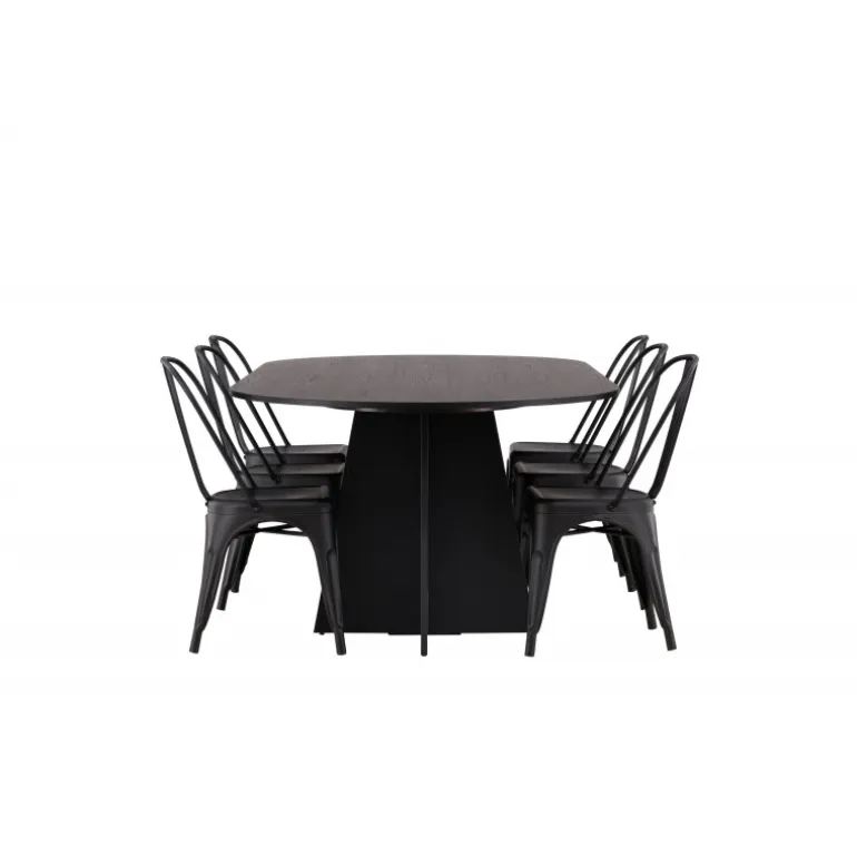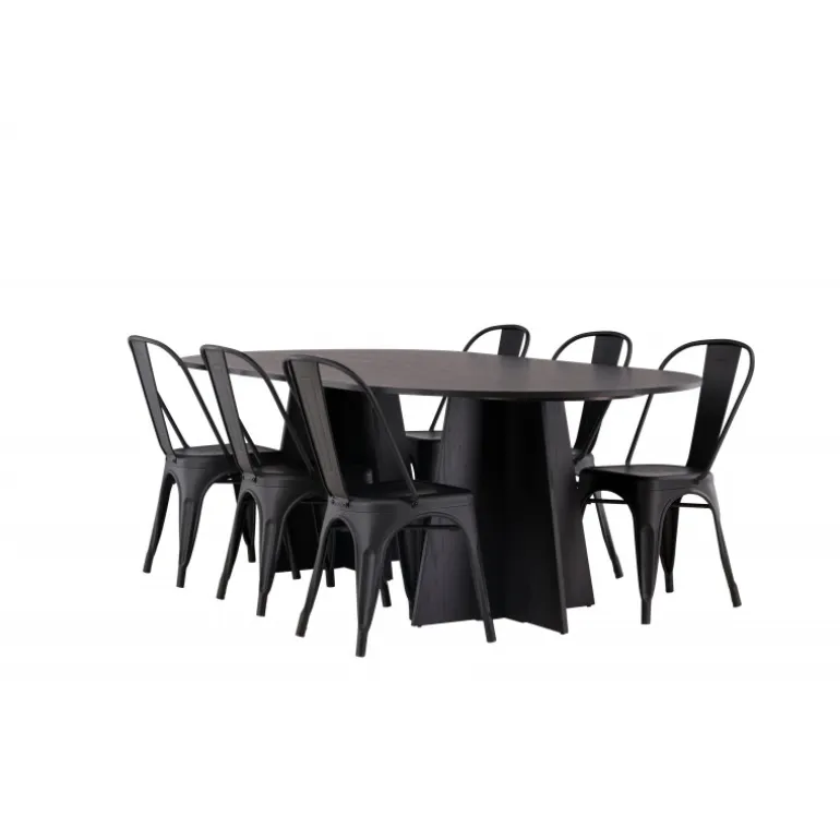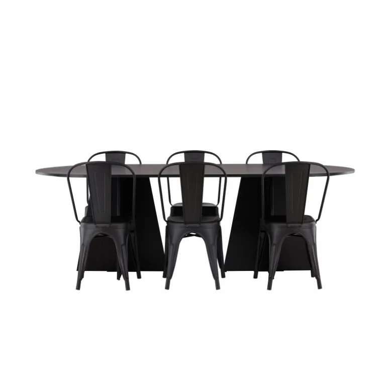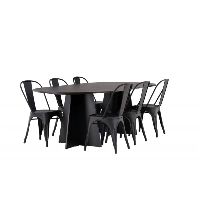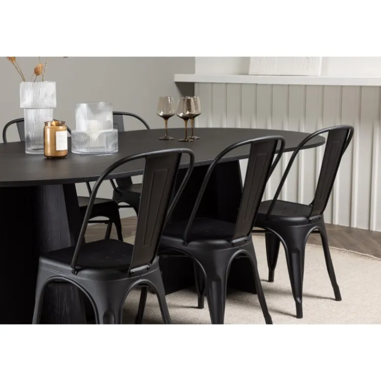 Magnifik og praktisk! Vores ovale spisebord Bootcut har et unikt design med en oval bordplade i sort MDF med finer og en karakteristisk ramme med to kegleformede ben i åben design. Her, sammen med vores sorte spiseborde fra Tempe-serien. Stolen har let udadvendte ben, der glider smukt sammen med sæde og ryglæn i et stilfuldt design, lavet af sort metal hele vejen igennem. En Spisebordssæt, der står tidens prøve og er nem at holde frisk! Bordmål: 230x115cm.