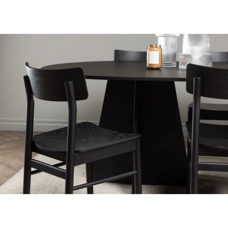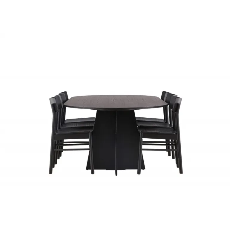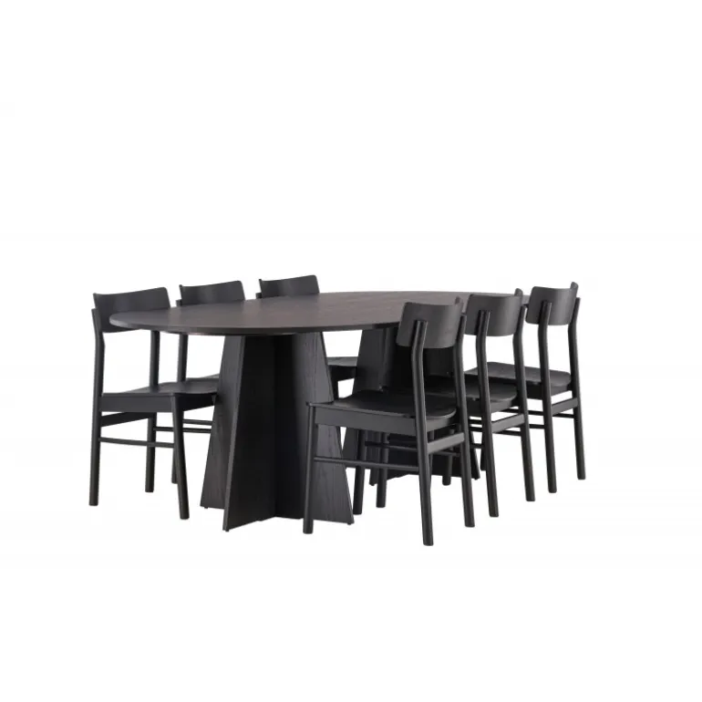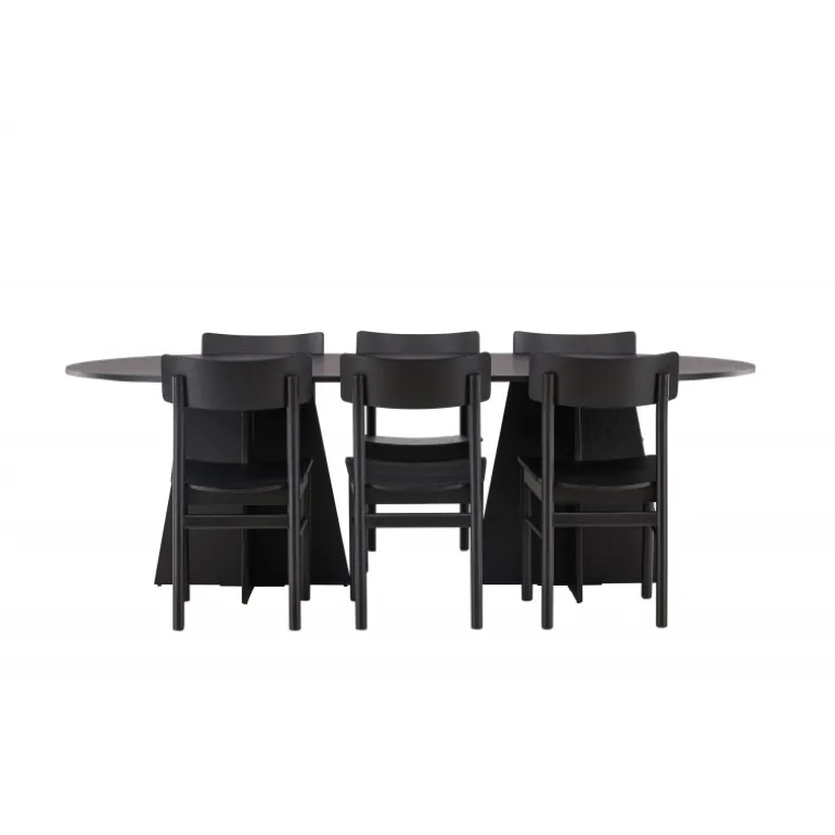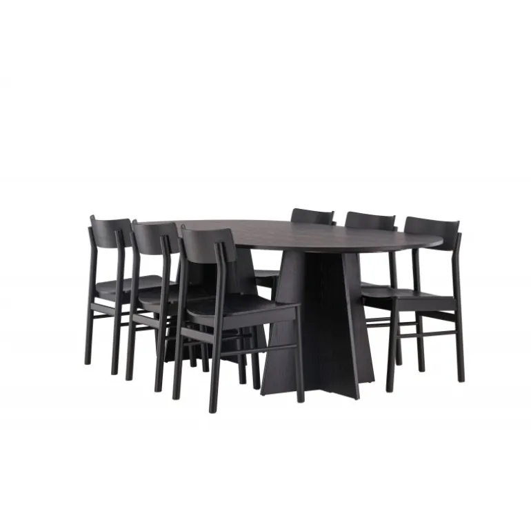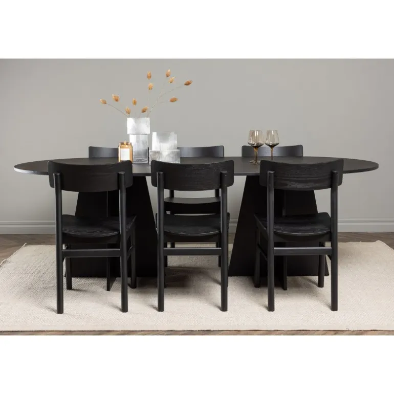 Oplev vores elegante Spisebordssæt med bootcut-bordet og Montros-stolene – den perfekte kombination af stil og funktionalitet til dit køkken eller spisestue. Bootcut-bordet har en oval form og måler 230×115 centimeter. Fremstillet af MDF-materiale, tilbyder det en robust og pålidelig base for alle dine måltider. Bordets sorte farve tilføjer et elegant og moderne touch til din indretning. Montros-stolene er lavet af birketræ og giver en komfortabel siddeoplevelse omkring bordet. Deres sorte farve og enkle, elegante design komplementerer perfekt bootcut-bordet, hvilket skaber en sammenhængende og stilfuld æstetik for hele Spisebordssættet. Uanset om det er en stille familiemiddag eller en festlig sammenkomst med venner, er vores Spisebordssæt med bootcut-bordet og Montros-stolene det perfekte valg til at skabe en indbydende og stilfuld atmosfære i dit hjem.