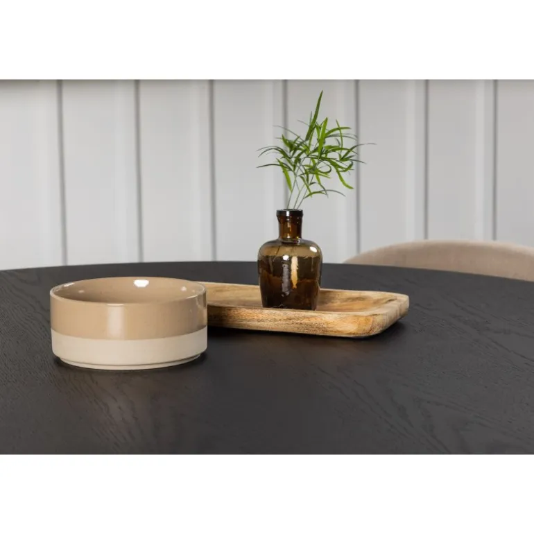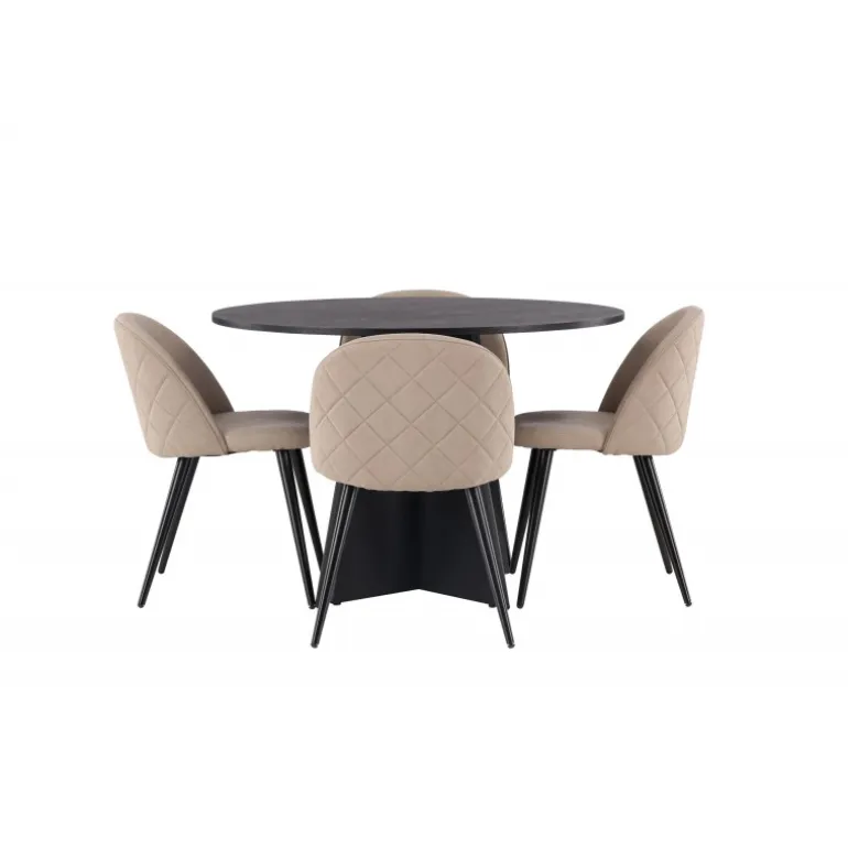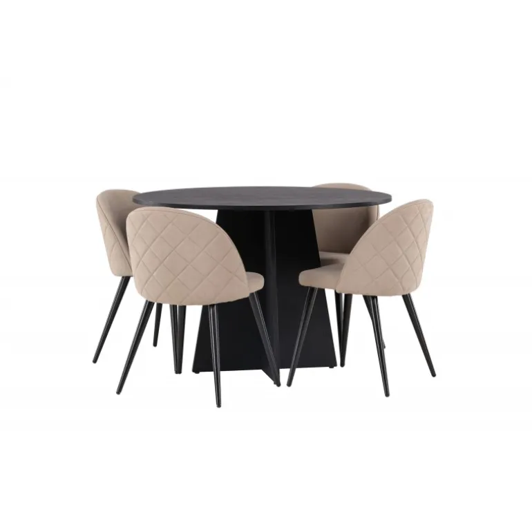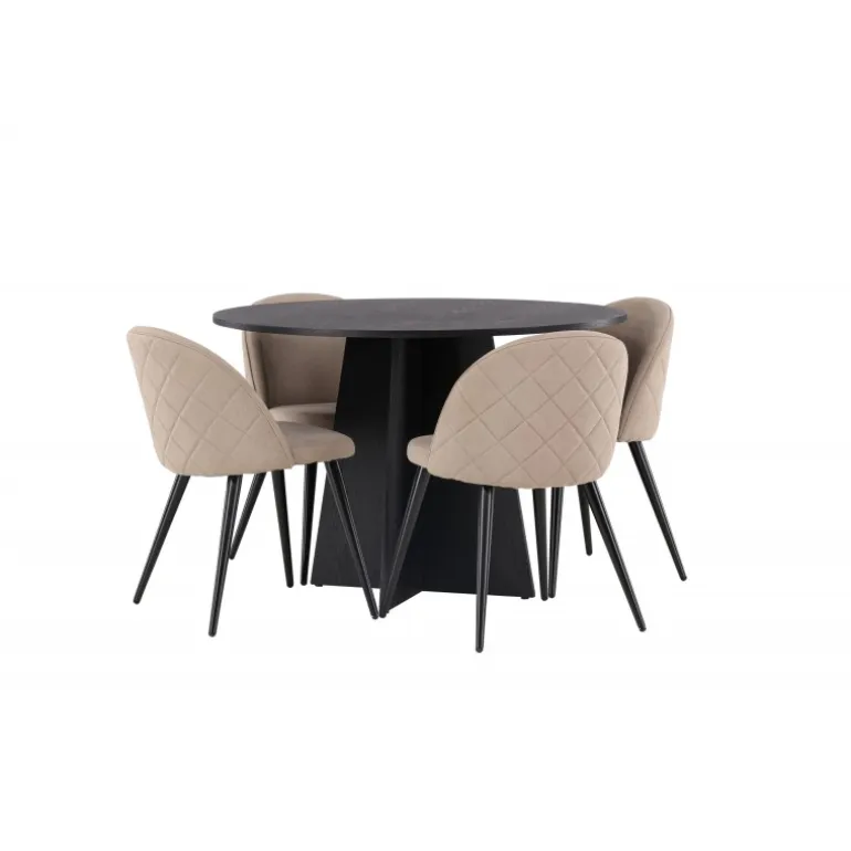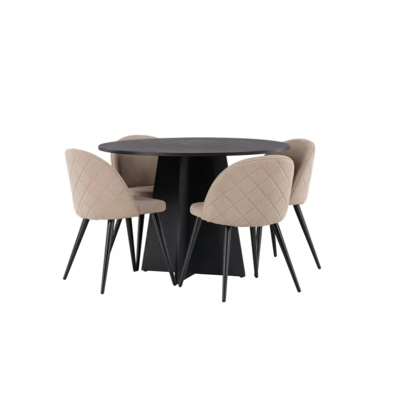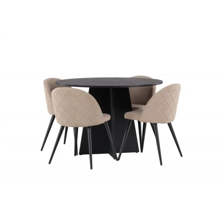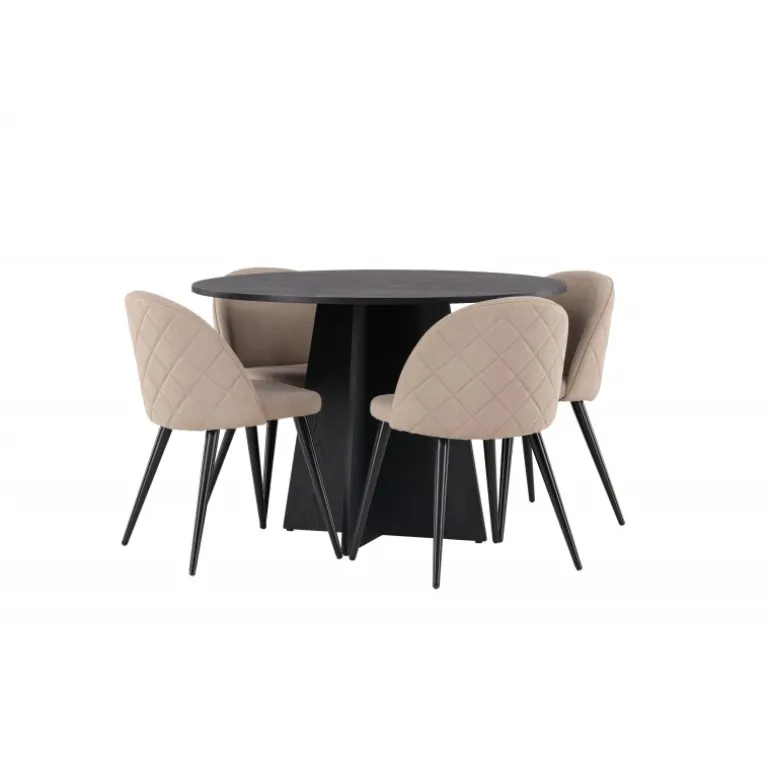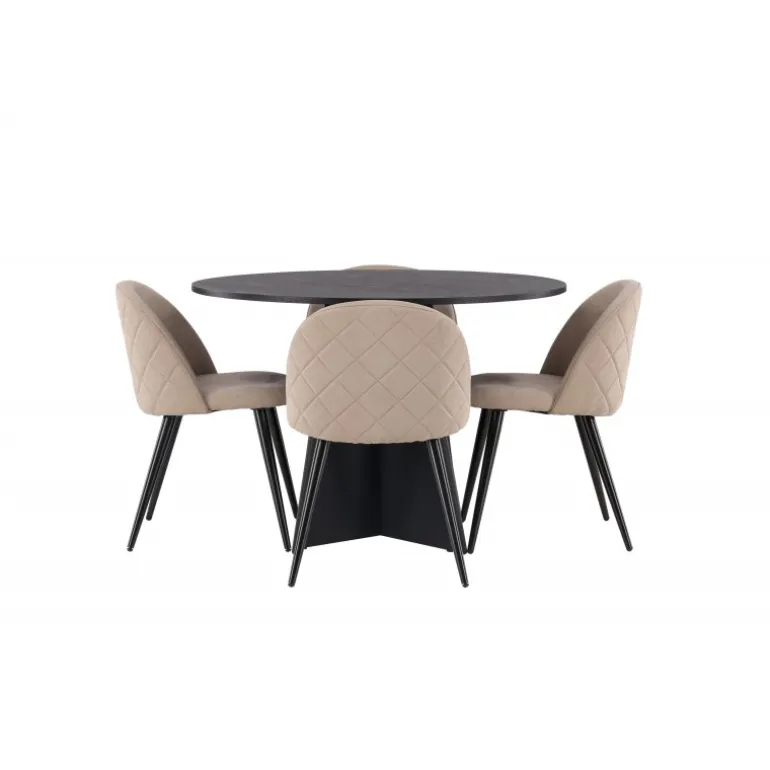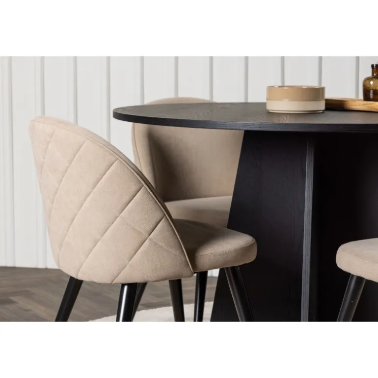 Skab et blikfang, der imponerer! Det runde spisebord Bootcut i en konsekvent sort farve har en bordplade i MDF med finer og en designrig ramme, der giver et dejligt indtryk til helheden. Her i en trend-sikker kombination med spisebordsstole fra Velvet Stitches-serien. Stolens ryg er afrundet og ligesom sædet, er det blødt polstret i beige fløjl og polyesterlinned med dekorative syninger og skakmønstre på bagsiden. Benene er let udadgående i sort jern og giver et stabilt indtryk. Her får du en smagfuld kombination af stil og bekvemmelighed! Bordets dimensioner: 110 cm.