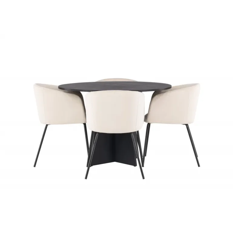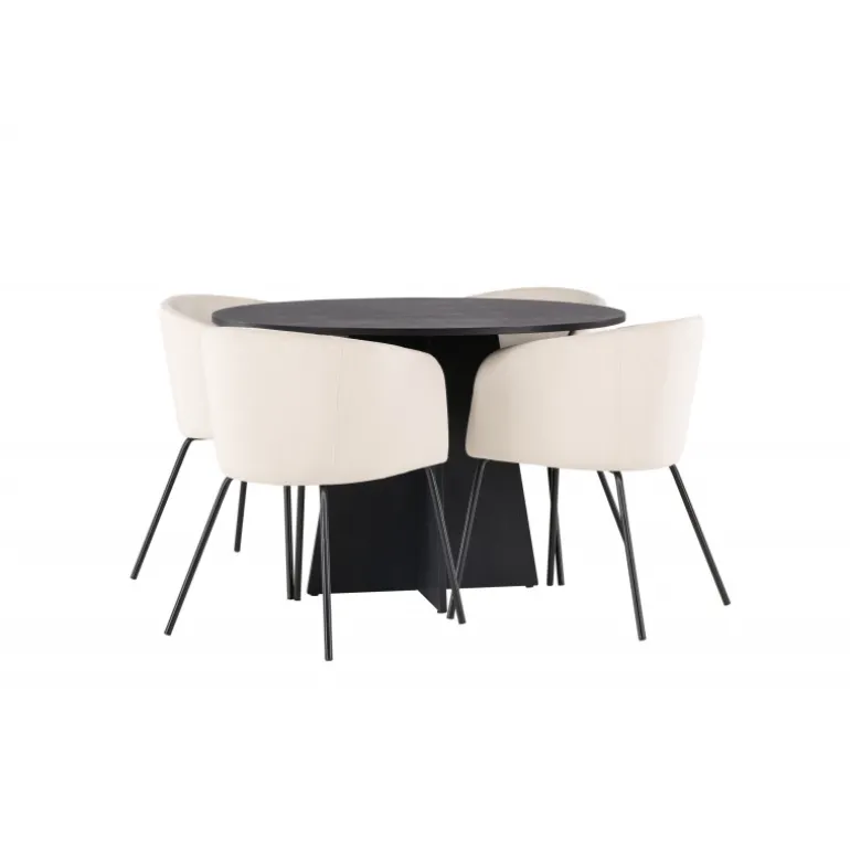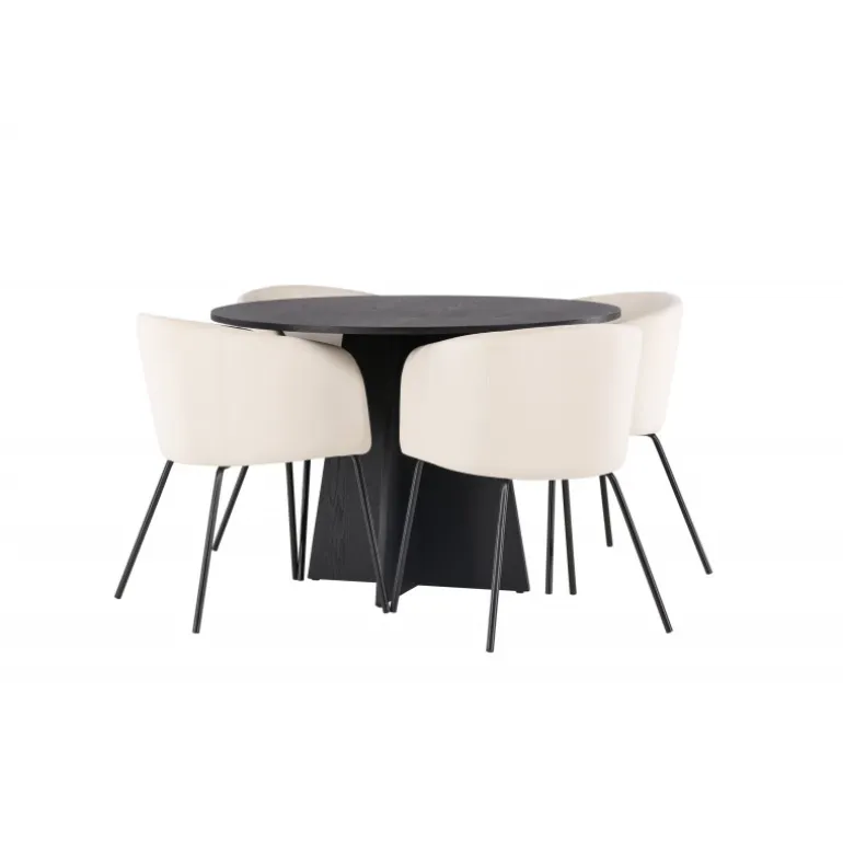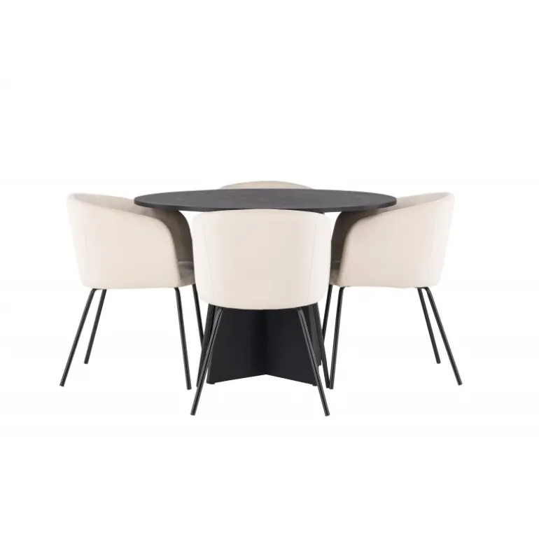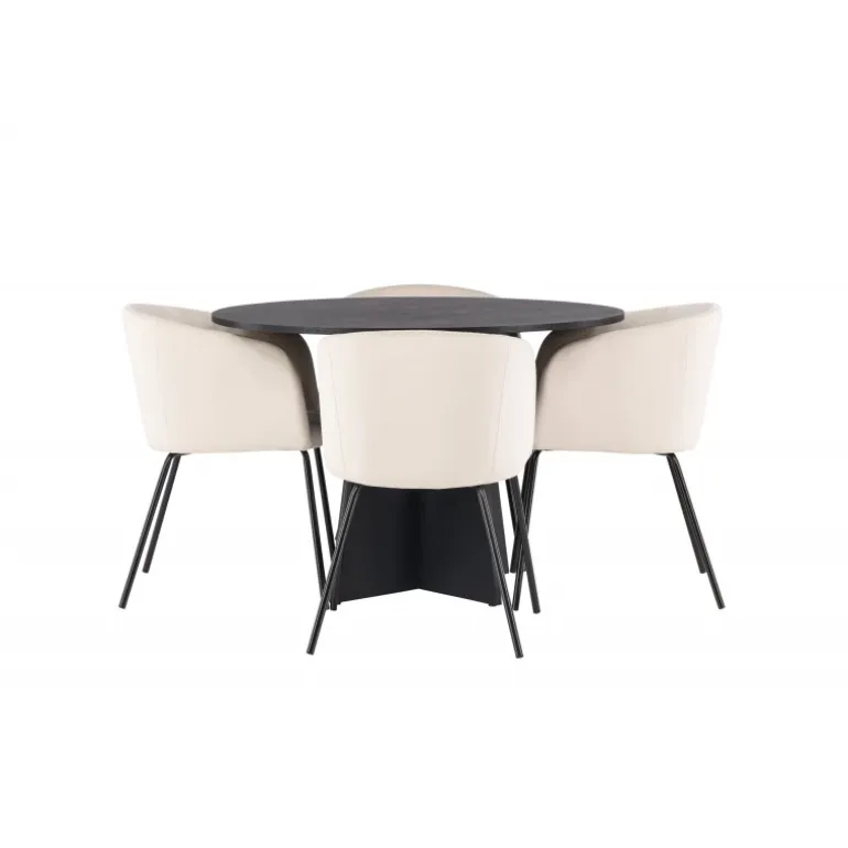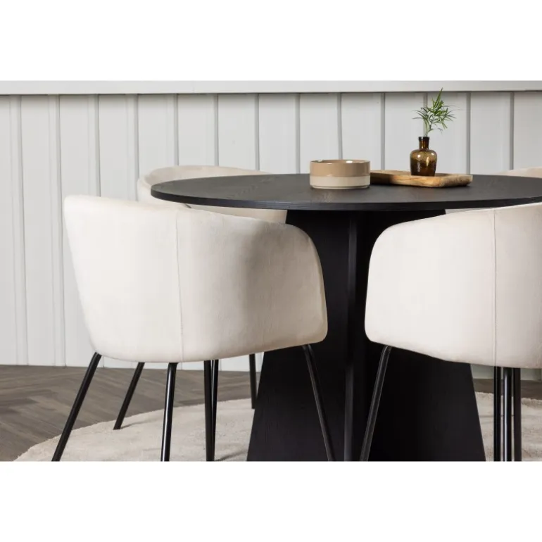 En moderne farvekombination! Det runde spisebord Bootcut i gennemgående sort farve har en bordplade i MDF med finer og en designrig ramme, der giver et skønt indtryk til det samlede billede. Her sammen med vores storslåede spisestuestole Berit. Stolen har et fuldt polstret design med en let afrundet ryg og sæde i velourstof og smalle ben i sort jern. Sid komfortabelt og indret stuen festligt! Bordets dimensioner: 110 cm.