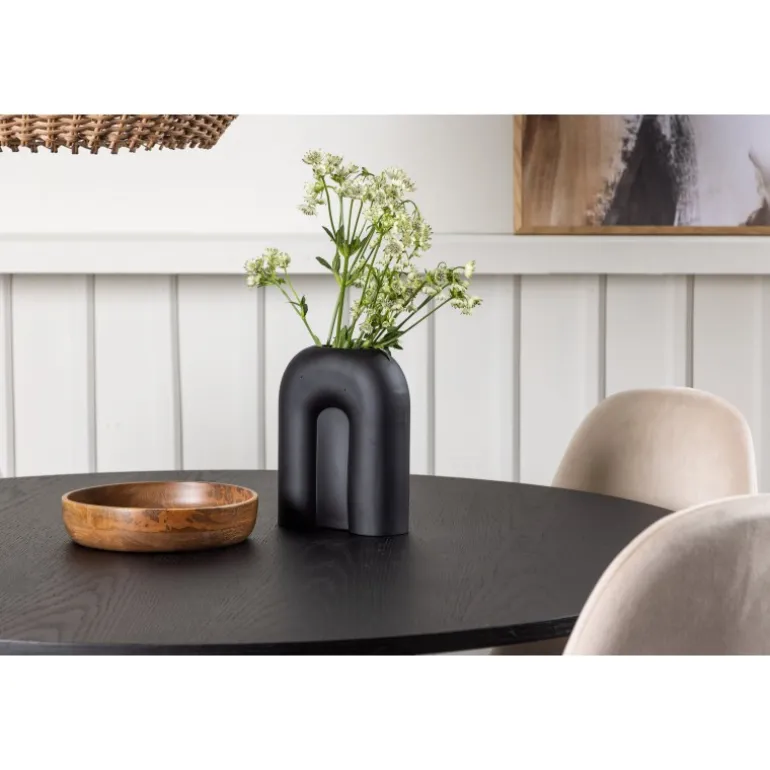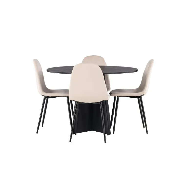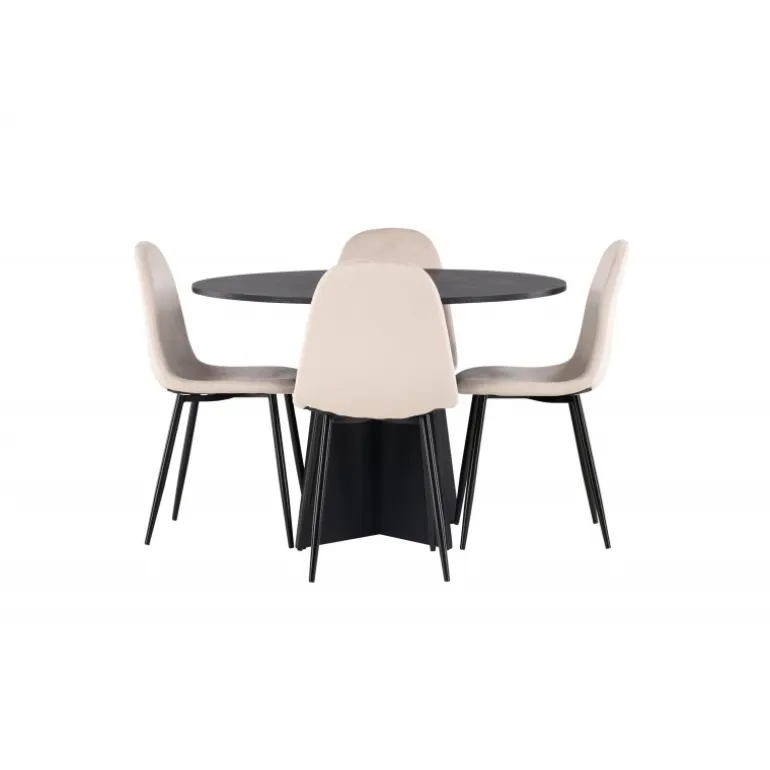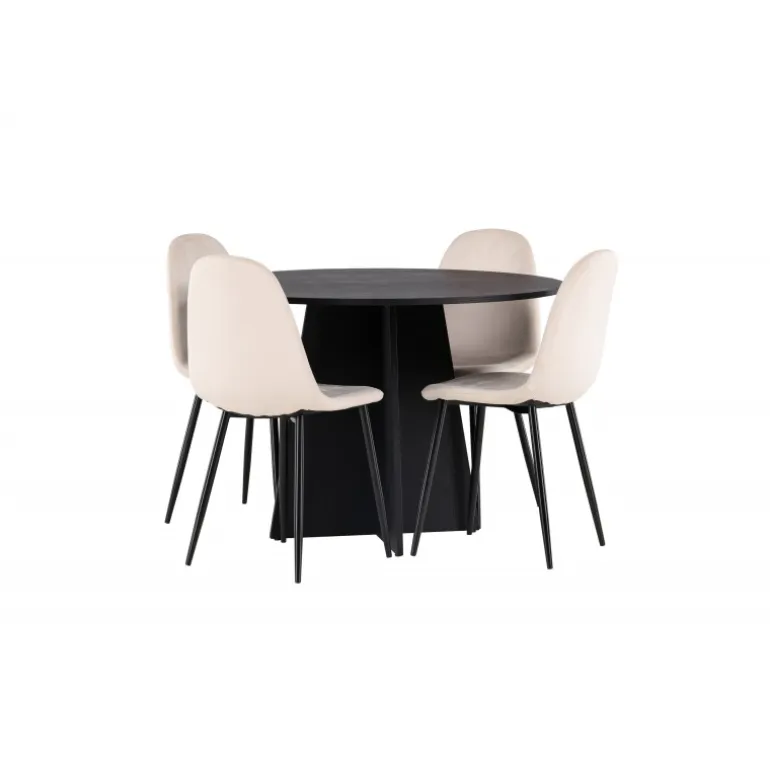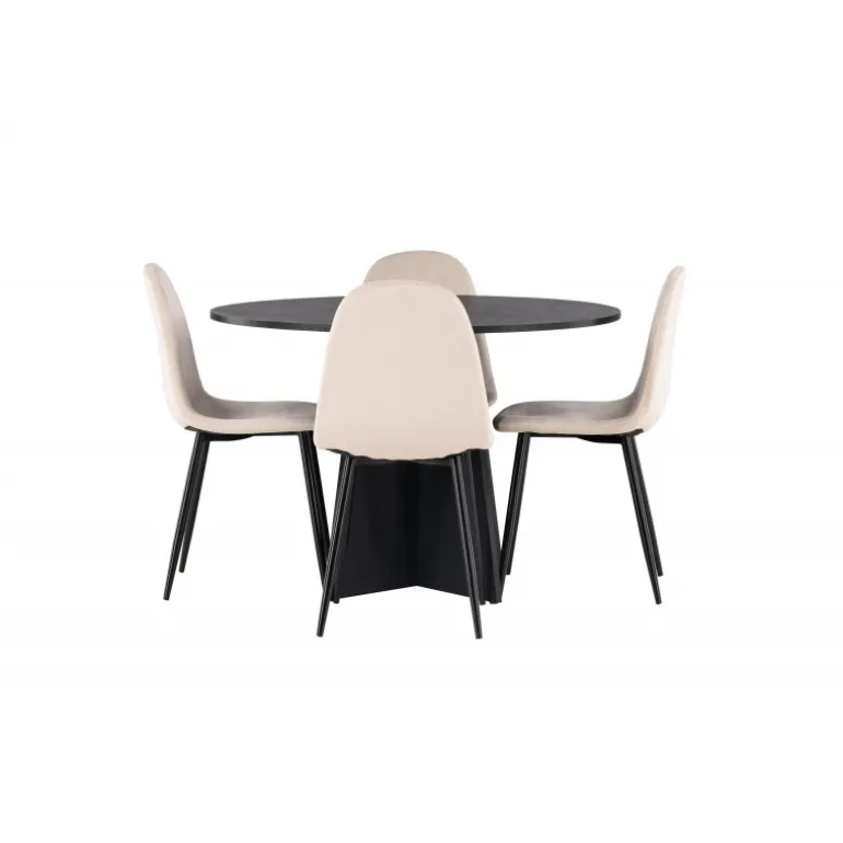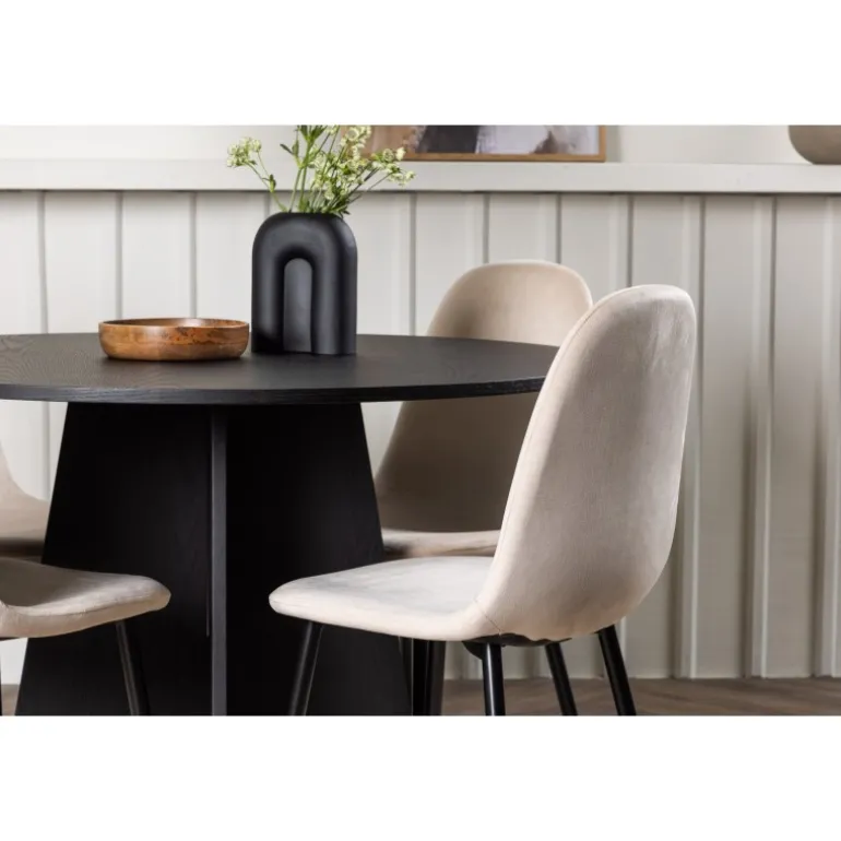 Det handler om detaljerne! Det runde spisebord Bootcut i en konsekvent sort farve har en bordplade i MDF med finer og en designrig ramme, der giver et dejligt indtryk af det samlede billede. Her sammen med vores vidunderlige spisestole Polar. Denne spisestol i et fuldt polstret design med en let afrundet ryg og sæde i beige velourstof og ben i sort pulverlakeret metal er lige så komfortabel, som den er iøjnefaldende. Den varme, beige farve er prikken over i’et! Bordets dimensioner: 110 cm.