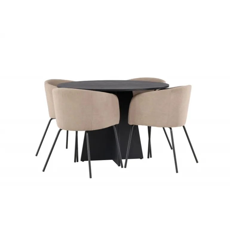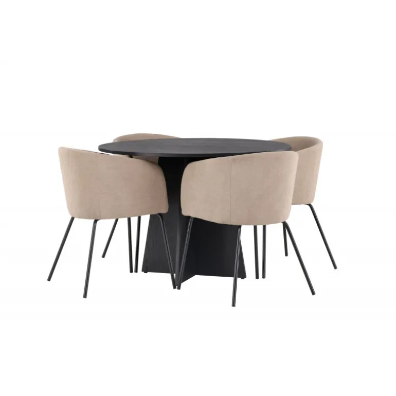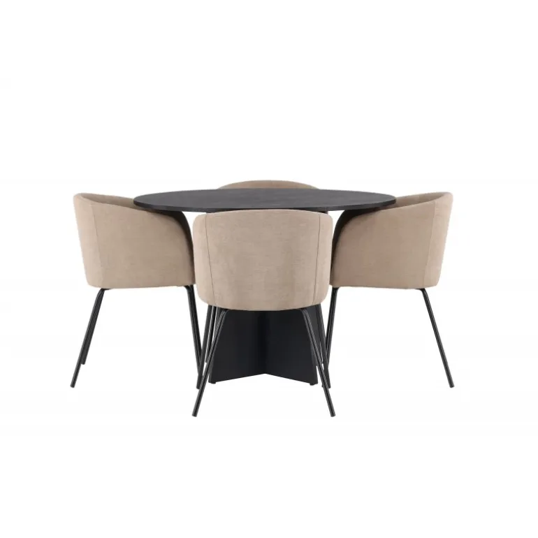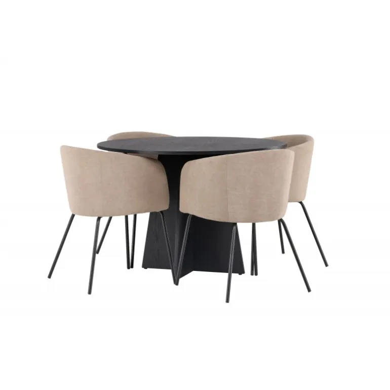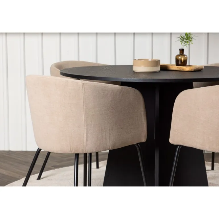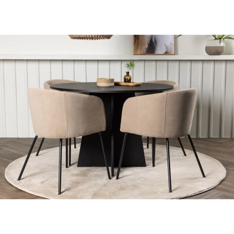 En smagfuld kombination af bekvemmelighed og charmerende former! Det runde spisebord Bootcut i en konsekvent sort farve har en bordplade i MDF med finer og et designrigt stel, der giver et dejligt indtryk til det samlede billede. Her sammen med vores komfortable spisebordsstole Berit. Stolen har et fuldt polstret design med en let rundet ryg og sæde i velourstof og polyesterlinned samt smalle ben i sort jern. Lad tiden her være nydelig for hele familien! Bordets dimensioner: 110 cm.