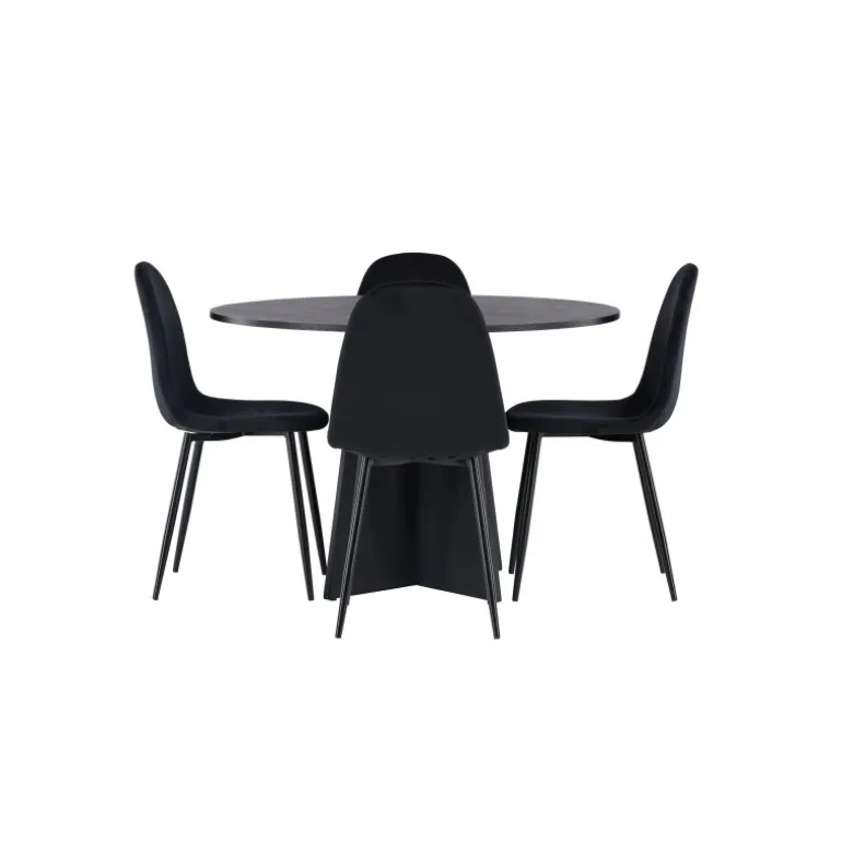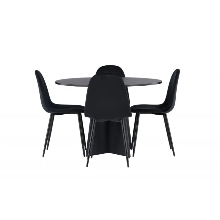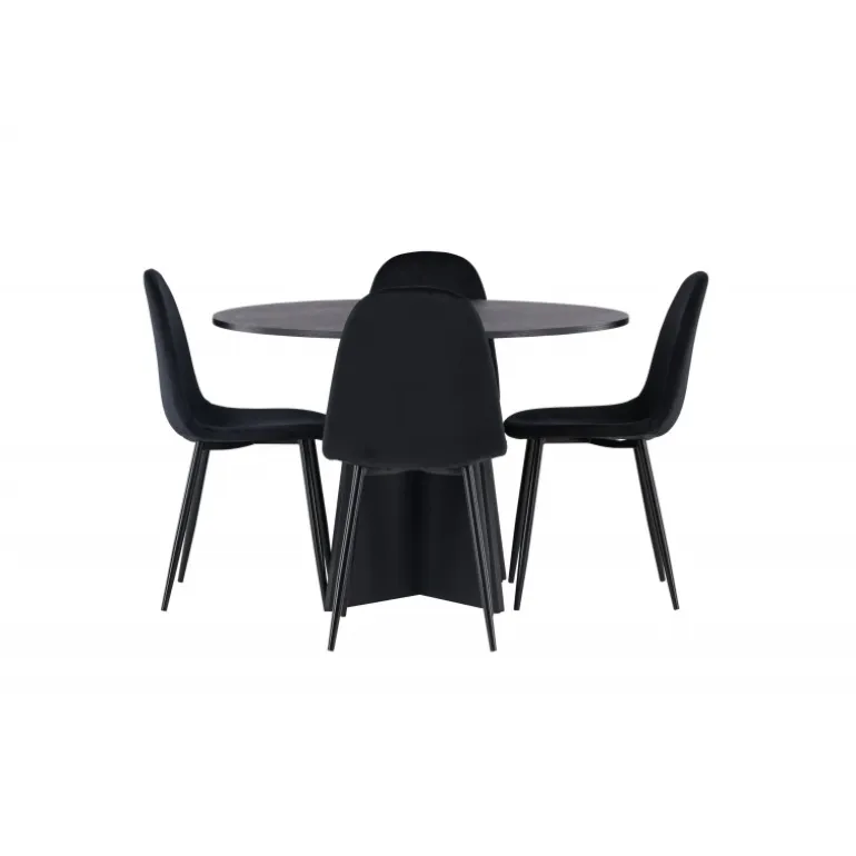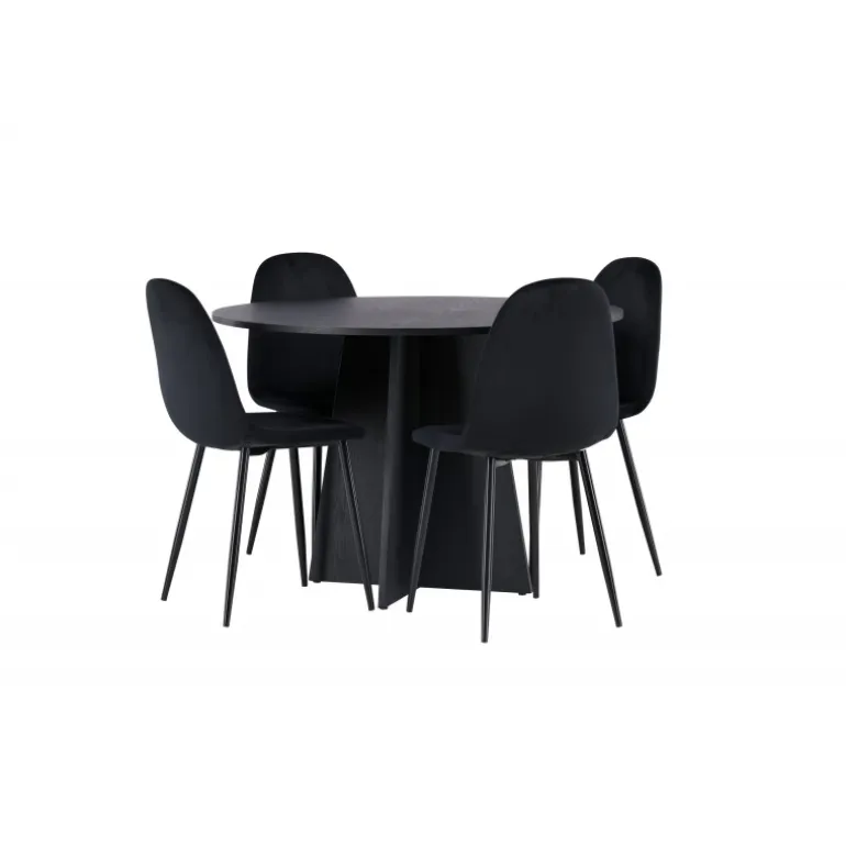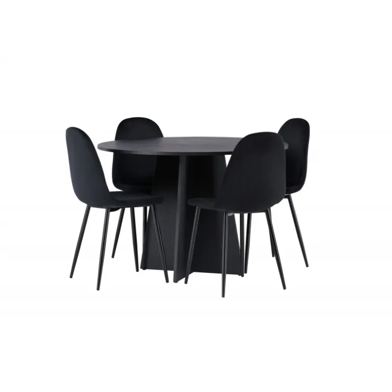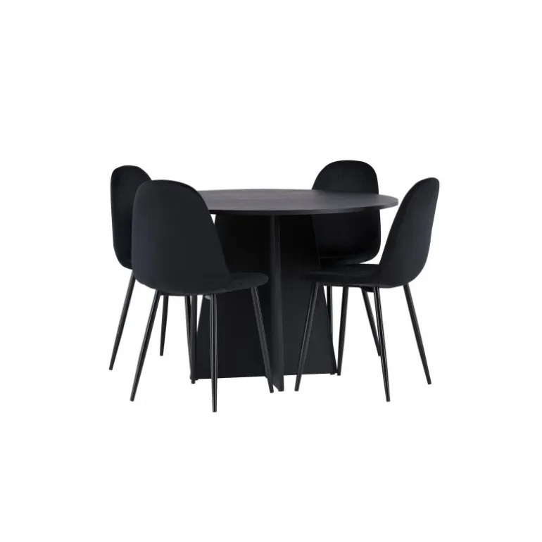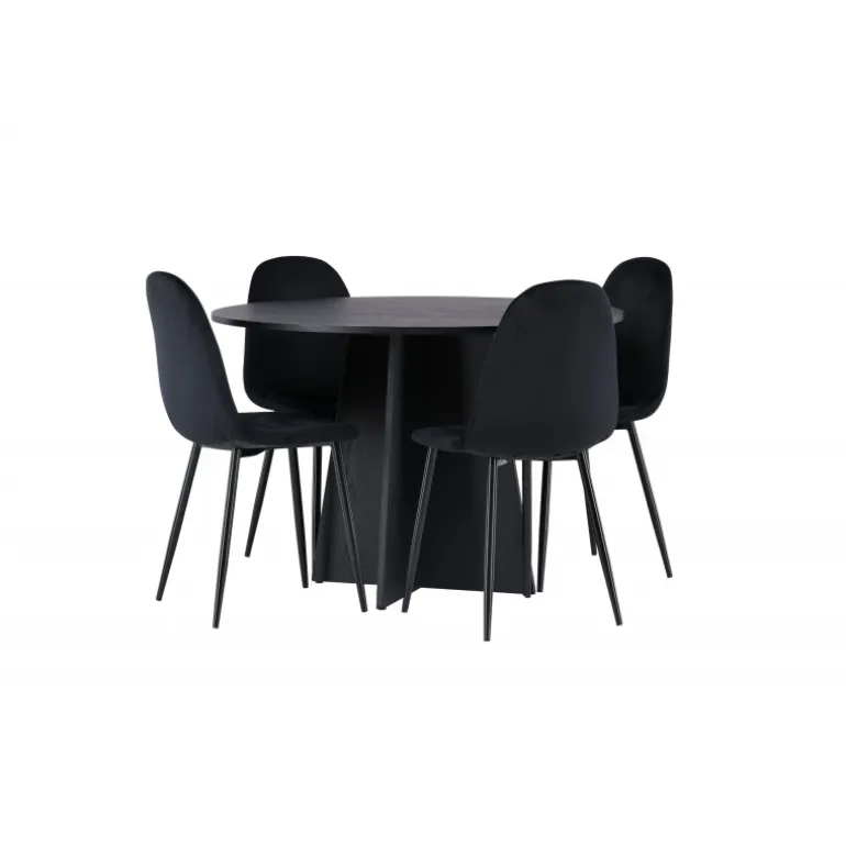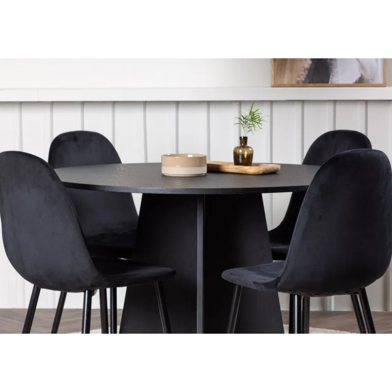 Et helt sort Spisebordssæt går aldrig af mode! Det runde spisebord Bootcut i gennemgående sort farve har en bordplade i MDF med finer og en designrig ramme, der giver et smukt indtryk til det samlede billede. Her i en stilfuld kombination med sorte spisebordsstole fra Polar-serien. Stolen har et fuldpolstret design, ben i sort pulverlakeret metal og rundet ryg og sæde i sort velourstof med blød polstring. Indret smart og komfortabelt! Bordmål: 110 cm.