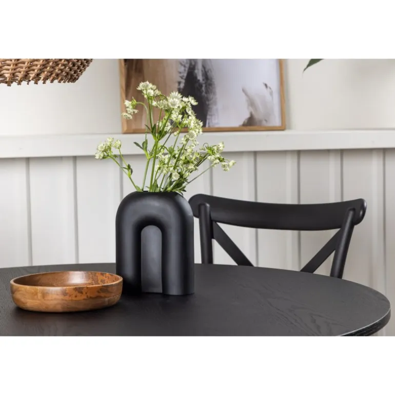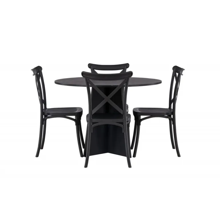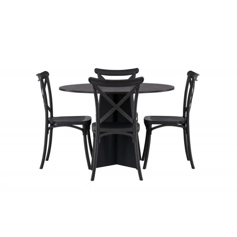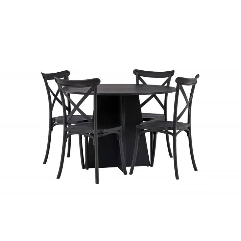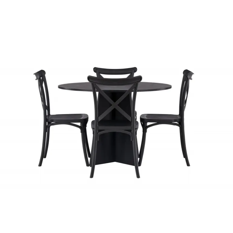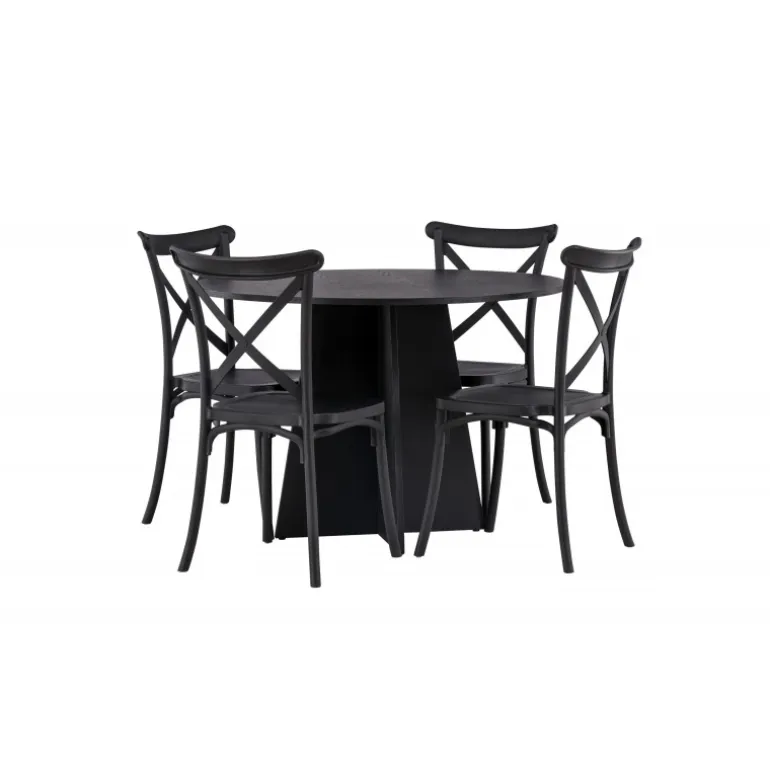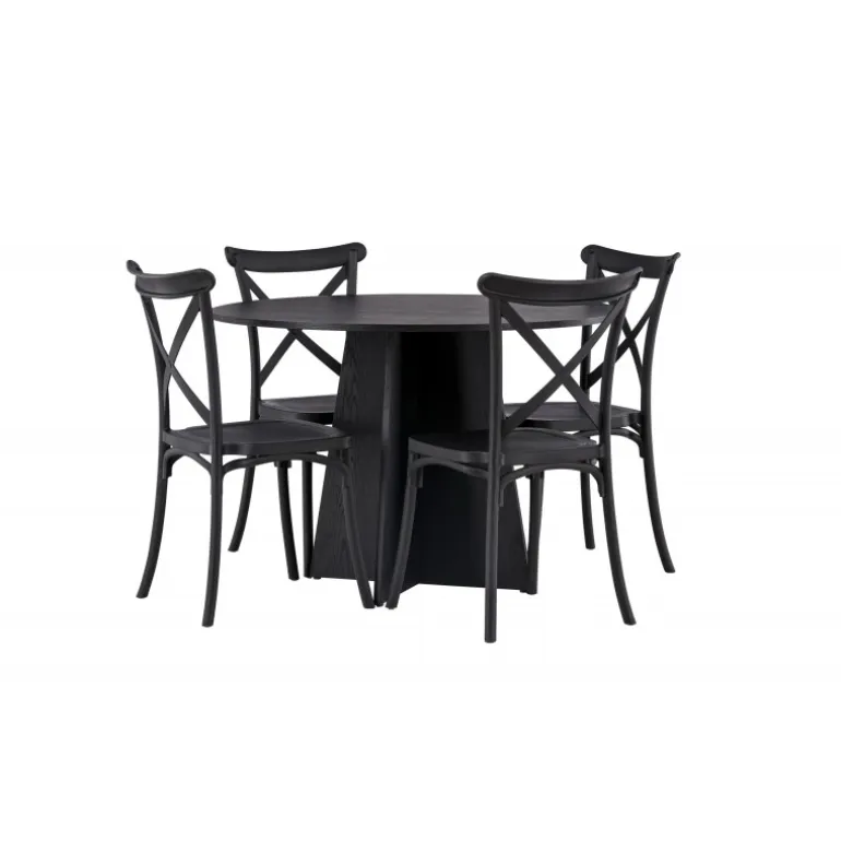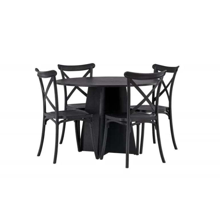 En storslået Spisebordssæt! Den runde spisebord Bootcut i konsekvent sort farve har en bordplade i MDF med finer og et designrigt stel, der giver et dejligt indtryk til det samlede billede. Her sammen med sorte spisestole fra Crosett-serien. Stolen er konsekvent lavet af det praktiske materiale plastik og har en mat sort farve, der står tidens prøve. En rund Spisebordssæt er også perfekt til at skabe en social og indbydende atmosfære i rummet! Bordets dimensioner: 110 cm.