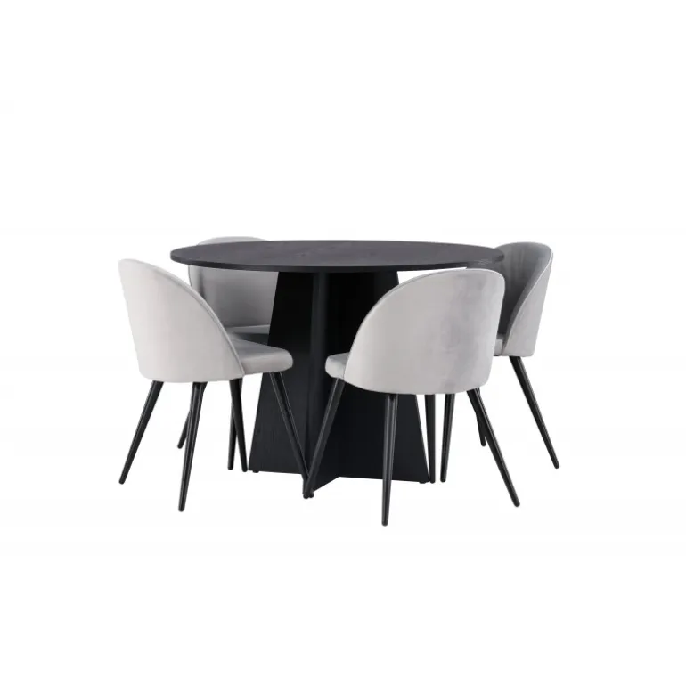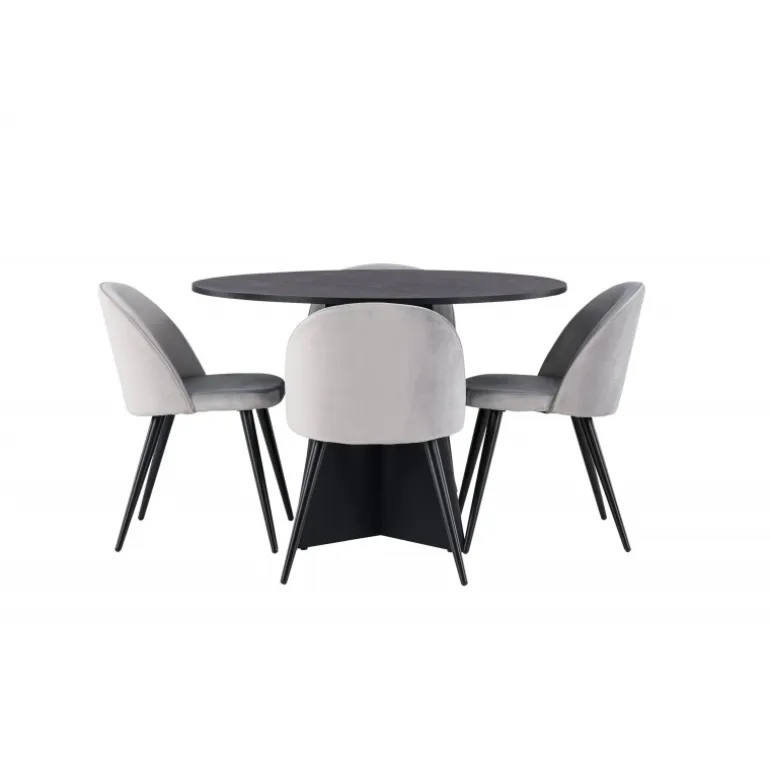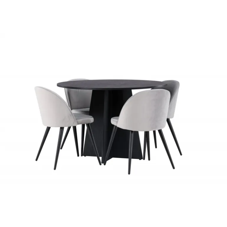 En behagelig spisestuegruppe i smagfuldt, skandinavisk design! Det runde spisebord Bootcut i gennemgående sort farve har en bordplade i MDF med finer og en designrig ramme, der giver et dejligt indtryk til det overordnede billede. Her i perfekt kombination med vores grå spisebordsstole fra Velvet-serien. Stolen har et fuldt polstret design, ben i sort pulverlakeret metal og rundet ryg og sæde i gråt velourstof med blød polstring. Lige så stilfuld som den er komfortabel! Bordets diameter: 110 cm.
