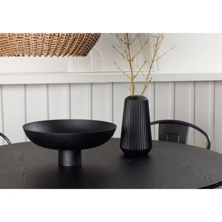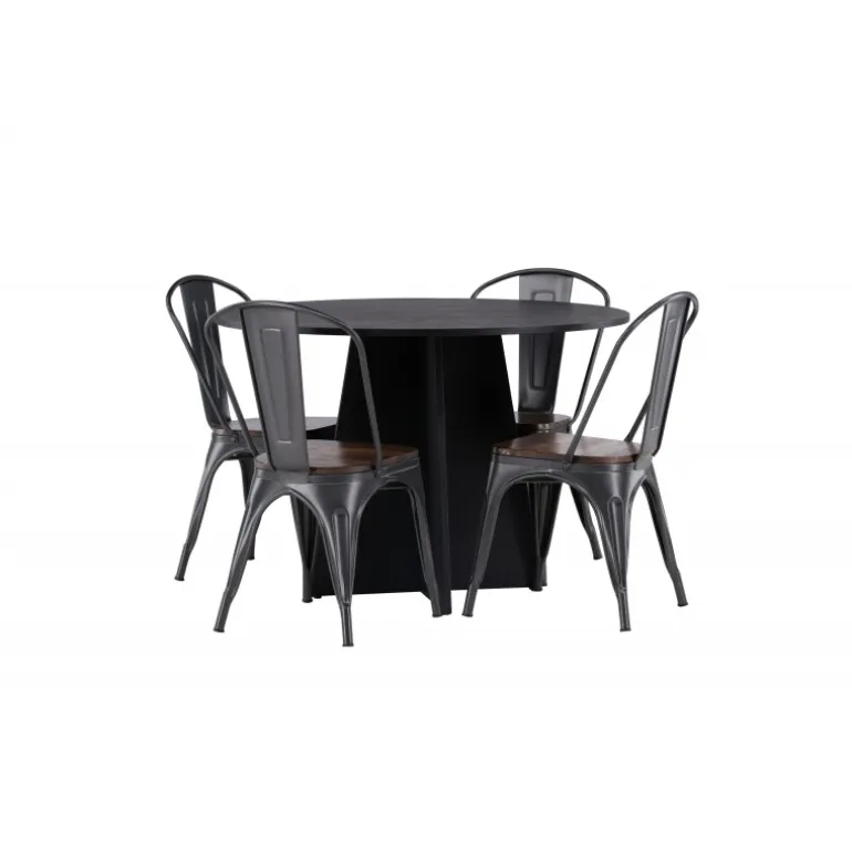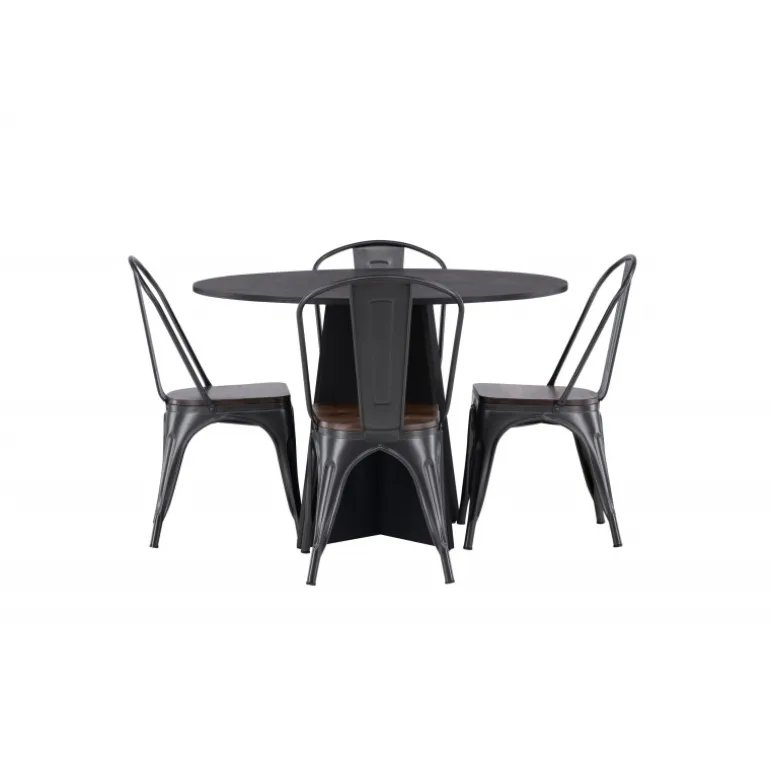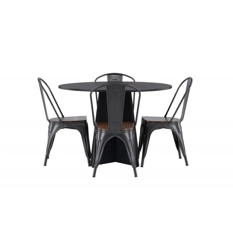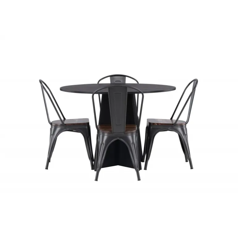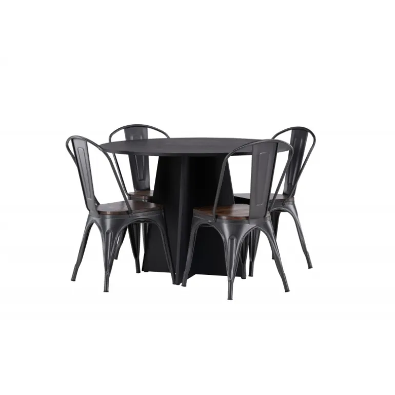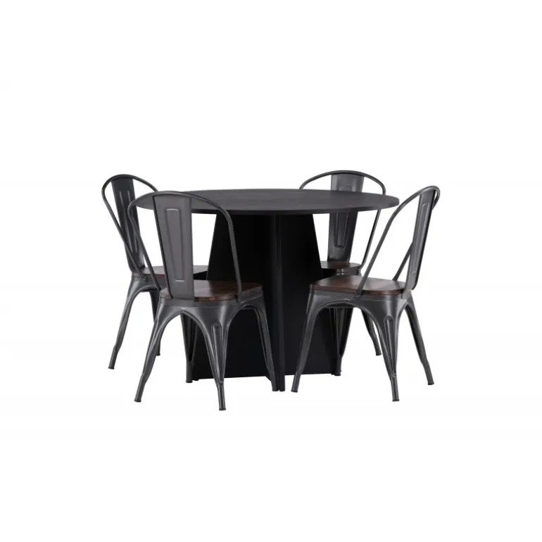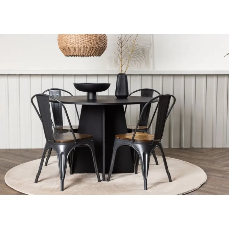 Inviter til hygge med et rundt Spisebordssæt! Det runde spisebord Bootcut i gennemgående sort farve har en bordplade i MDF med finer og en designrig ramme, der giver et dejligt indtryk til helhedsindtrykket. Her i trendy kombination med spiseborde fra Tempe-serien. Stolen har et klassisk design af en rustik stol med let udfladede ben i mørkegråt stål og et sæde i mørkt træ. Det er stilfuldt og luksuriøst! Bordets dimensioner: 110 cm.