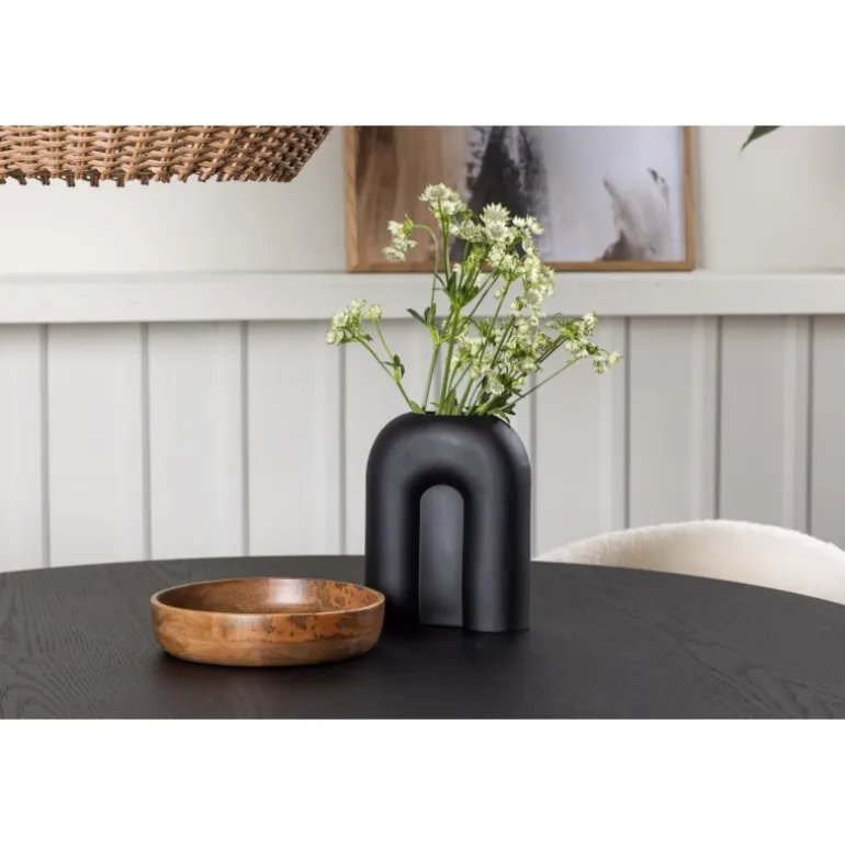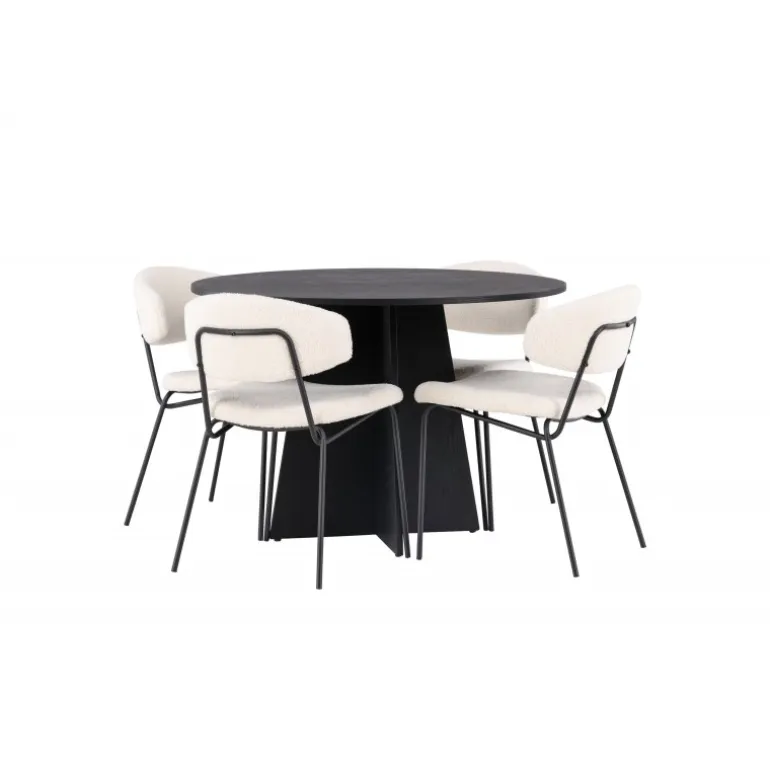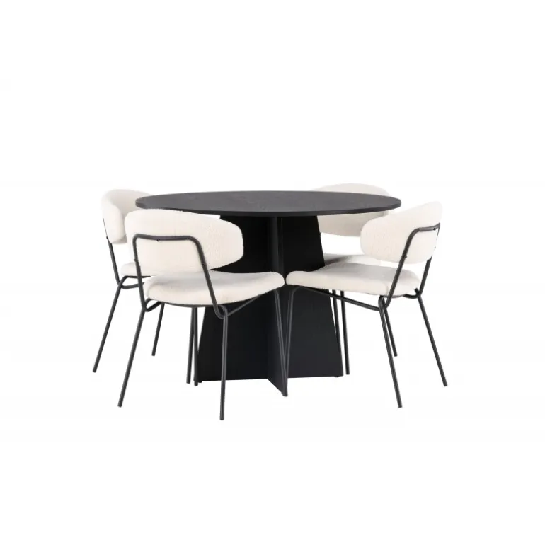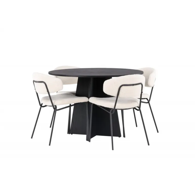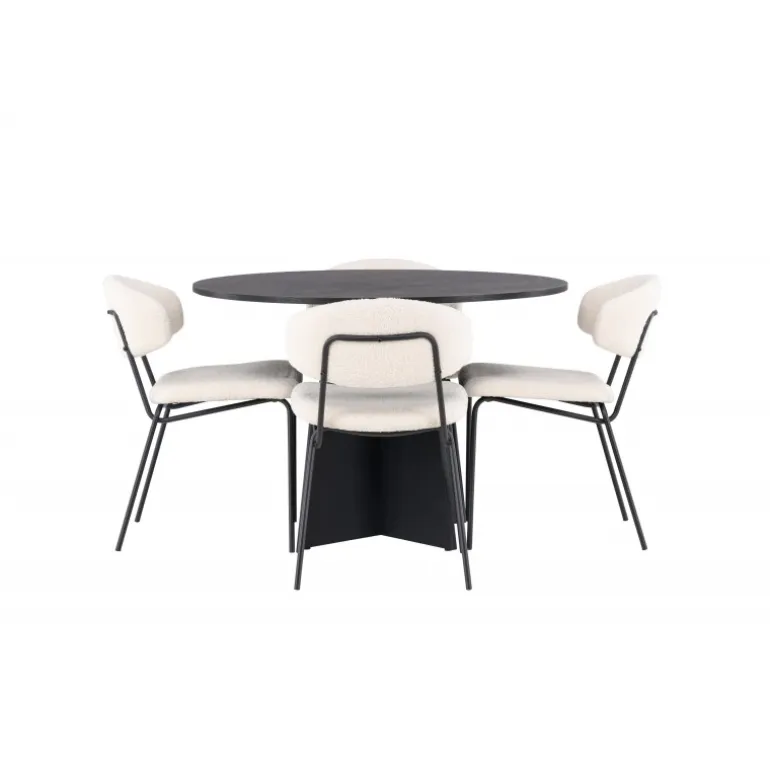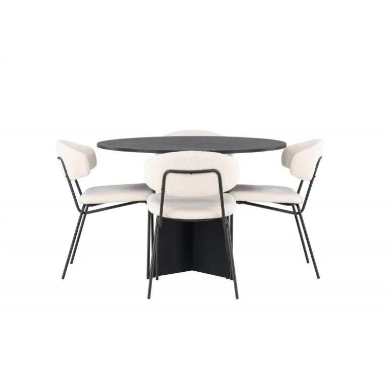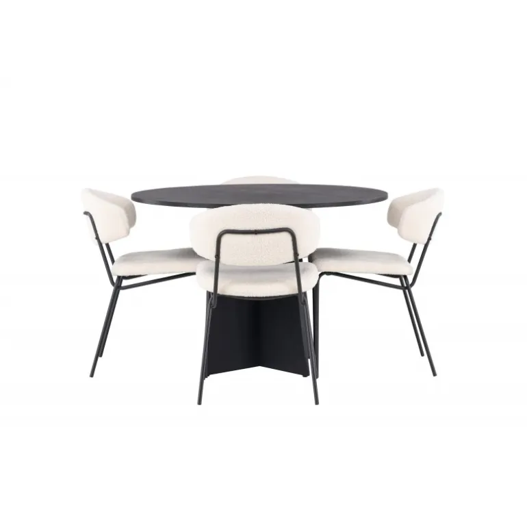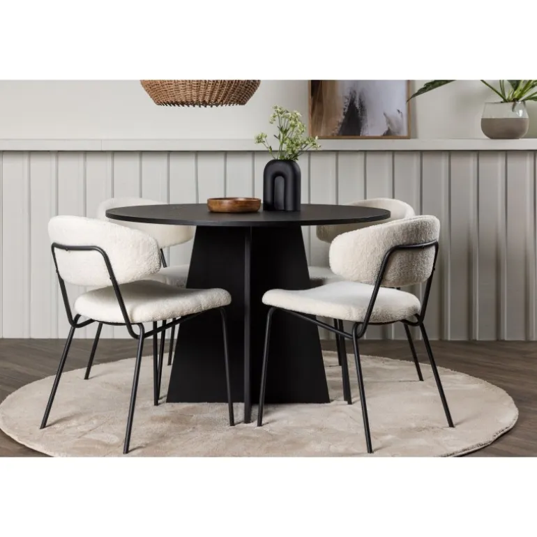 Kendte og trendy på samme tid! Det runde spisebord Bootcut i gennemgående sort farve har en bordplade i MDF med finer og et designrigt stel, der giver et dejligt indtryk i det samlede billede. Her i stilfuld kombination med vores hvide spisebordsstole fra Chico-serien. Stolen er i hvid bouclé-stof med polstret sæde og ryglæn for ekstra komfort. Benene er smalle i sort stål, som giver stolen en luftig følelse. Her ender ingen på kanten! Bordets dimensioner: 110 cm.