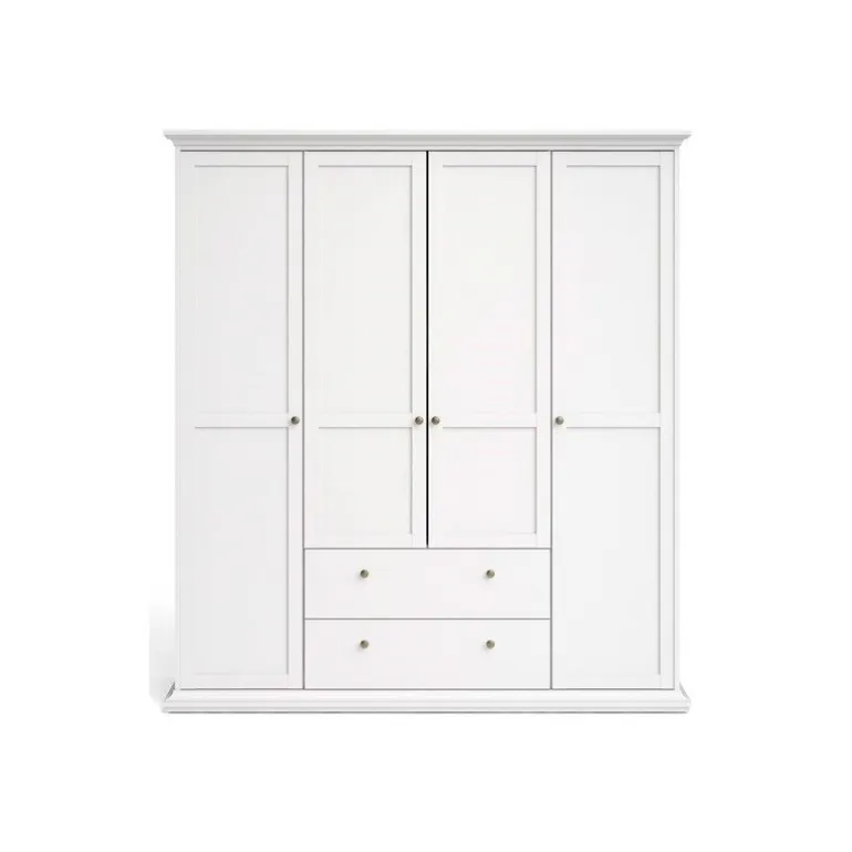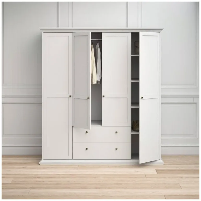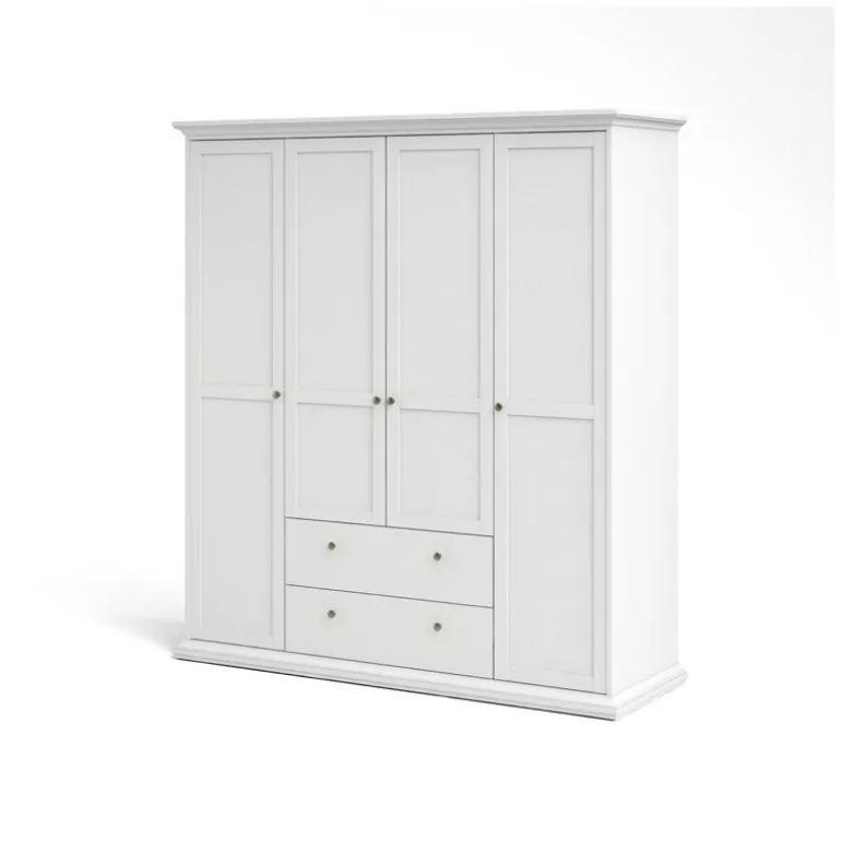 Bordeaux klædeskab i hvid med 4 låger og 2 skuffer. Inde i skabet er der både bøjlestang og 8 hylder med god plads til opbevaring.