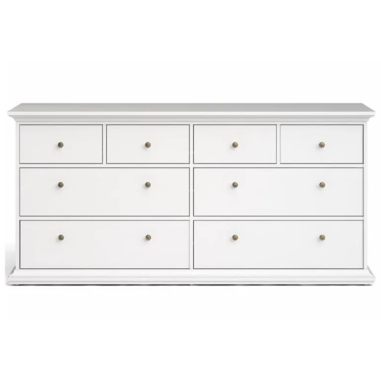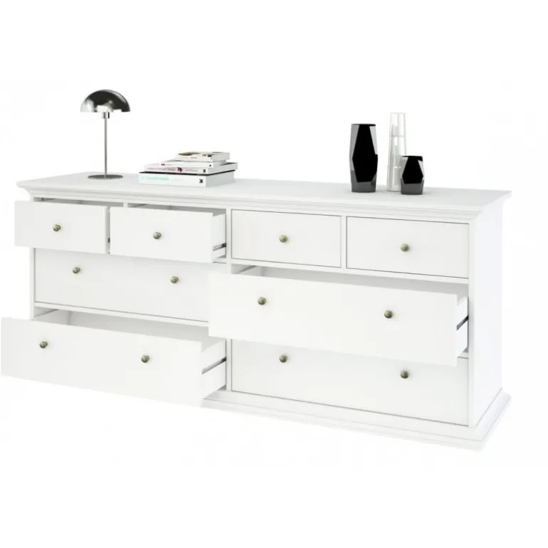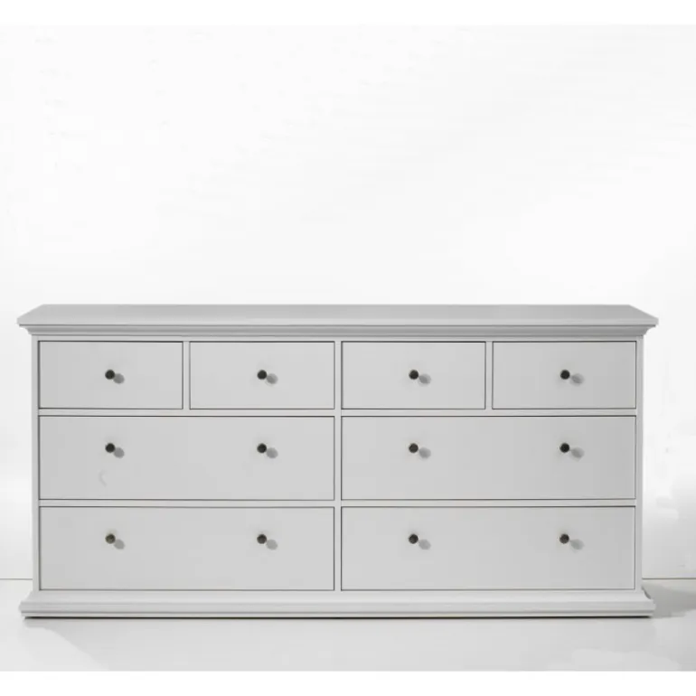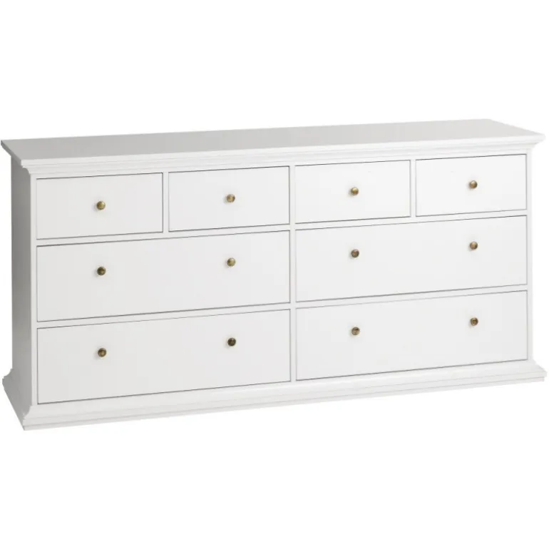 Bordeaux kommode med 8 skuffer i hvid og med metaludtræk.