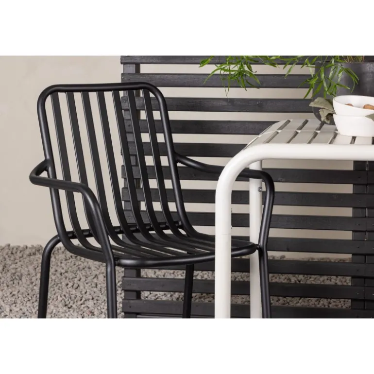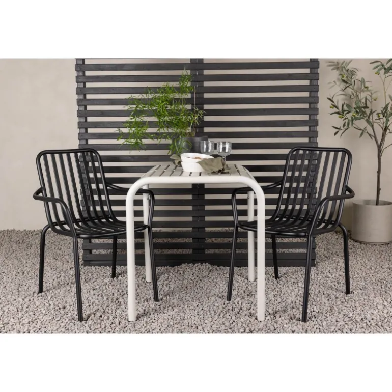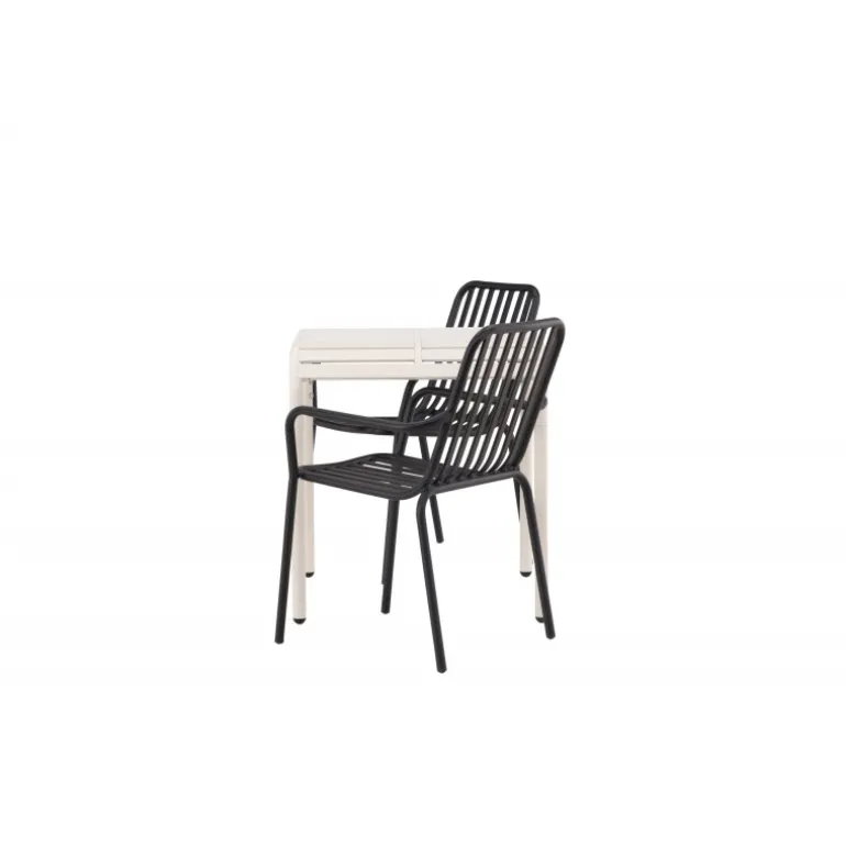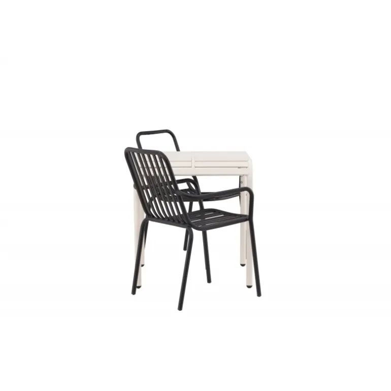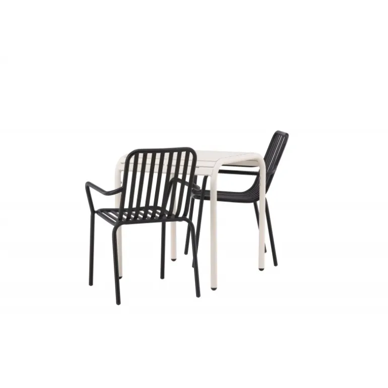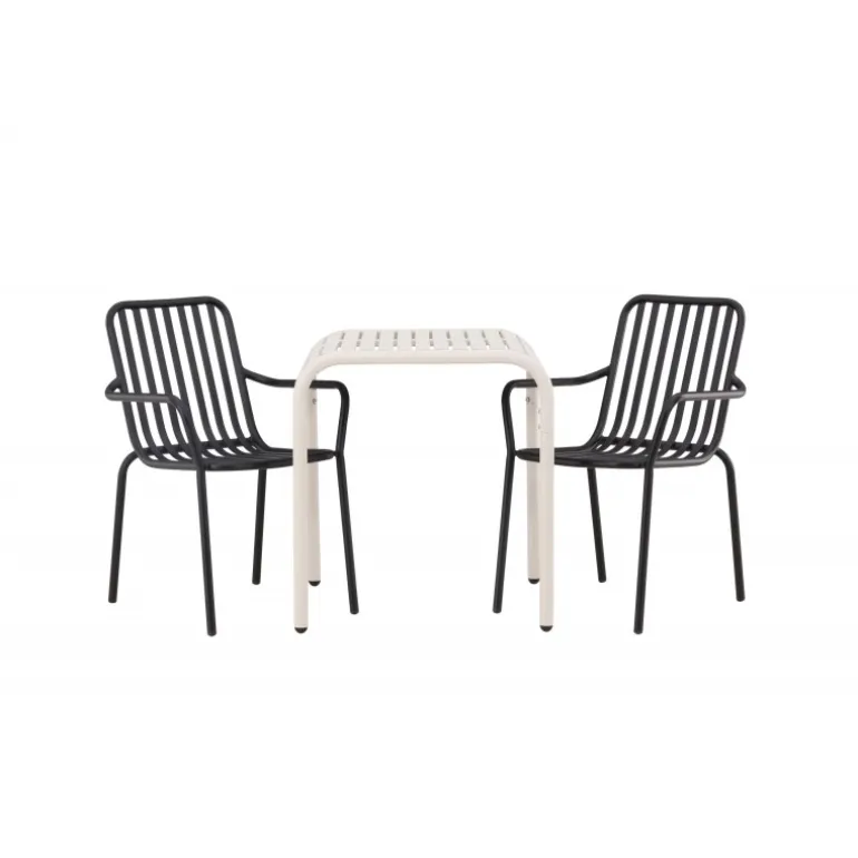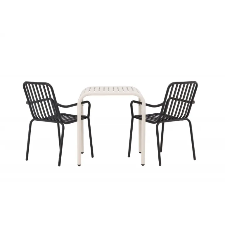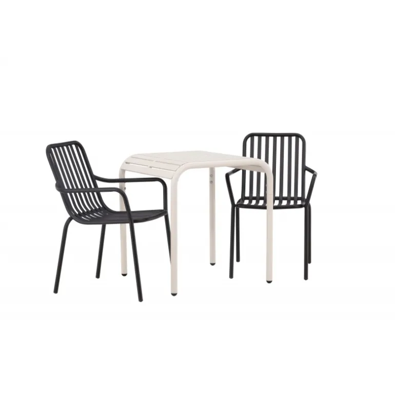 Et moderne og indbydende café-sæt, der udstråler charme! Bordet fra Borneo-serien har et tidløst skandinavisk design. Bordpladen er ribbet og bølger ned langs kanterne ved benene. Alt sammen lavet af beige aluminium, hvilket giver dig et holdbart bord, der er let at flytte rundt. Her i stilfuld kombination med 2 spisebordsstole fra Beijing-serien. Den ribbede design i aluminium og sodsorte farve gør stolen både moderne og tidløs. Nyd din frokostpause udenfor denne sommer! Bordmål: 70×70 cm.