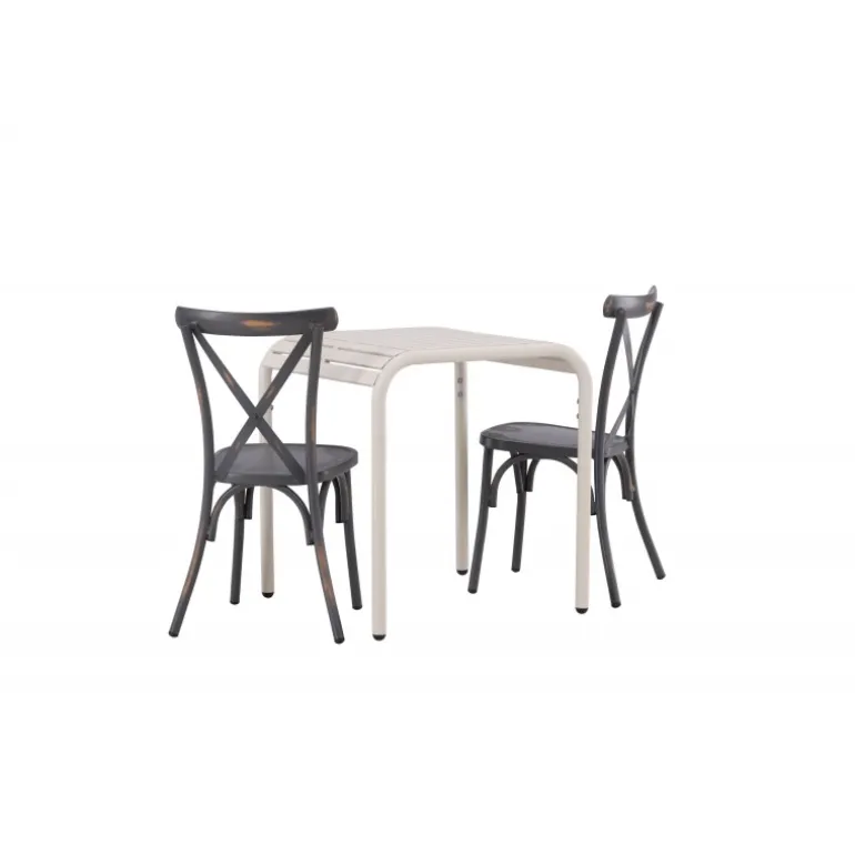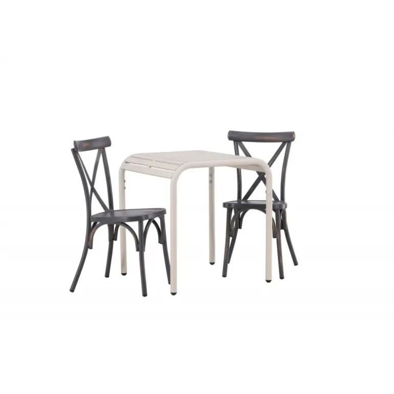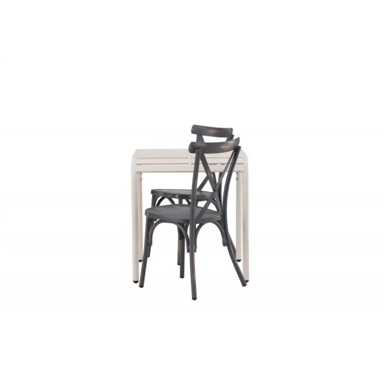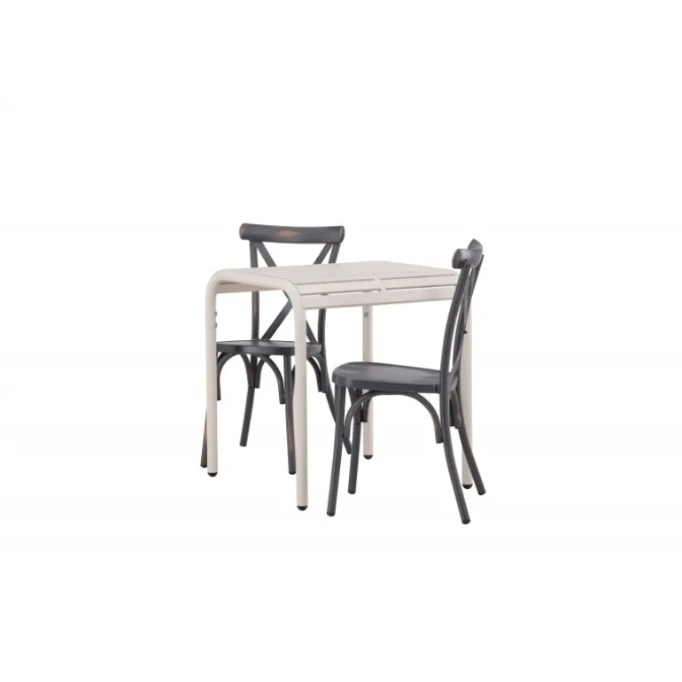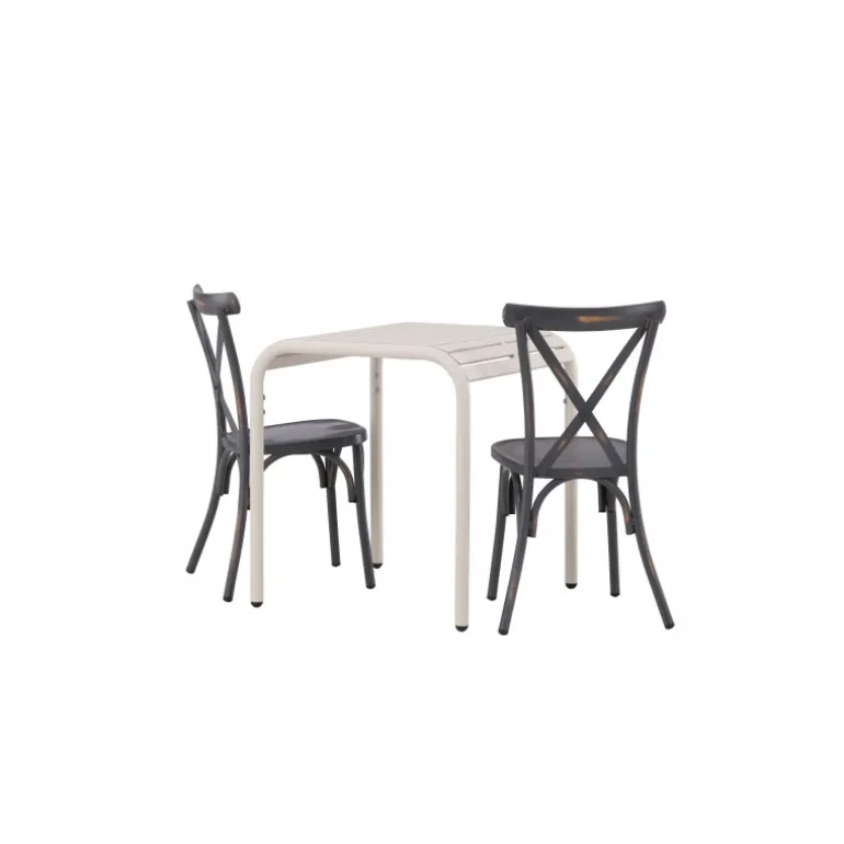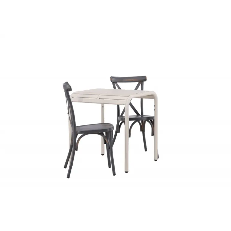 Den perfekte kaffebordgruppe til din terrasse! Dette cafébord fra Borneo-serien har et tidløst skandinavisk design. Bordpladen er ribbet og bølger ned langs kanterne ved benene. Alt sammen lavet af beige aluminium, hvilket giver dig et holdbart bord, der er let at flytte rundt. Her sammen med 2 spisestole fra Tablas-serien. Stolen har et krydset ryglæn og let udfladede ben for et stabilt indtryk. Alt i alt lavet af aluminium i en sodsort farve. Tag din kaffepause udenfor denne sommer og nyd frie øjeblikke sammen! Bordmål: 70×70 cm.