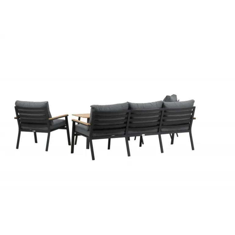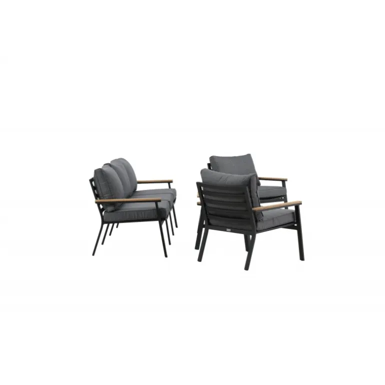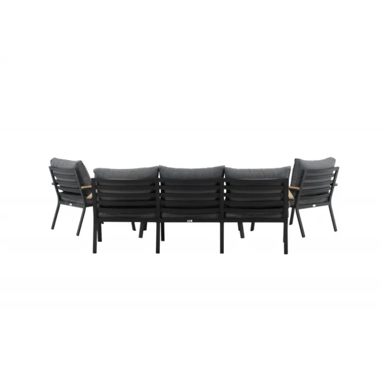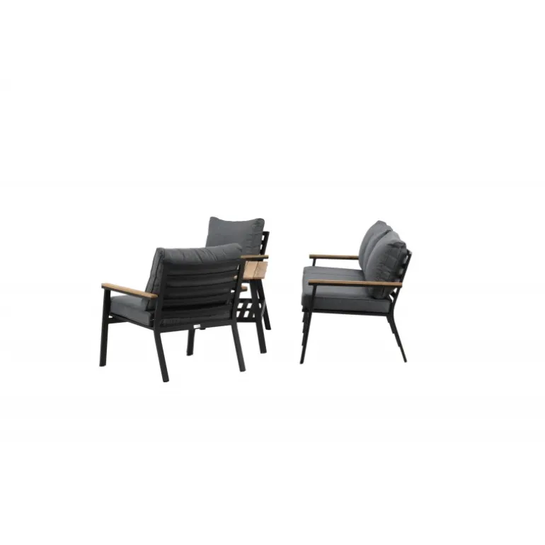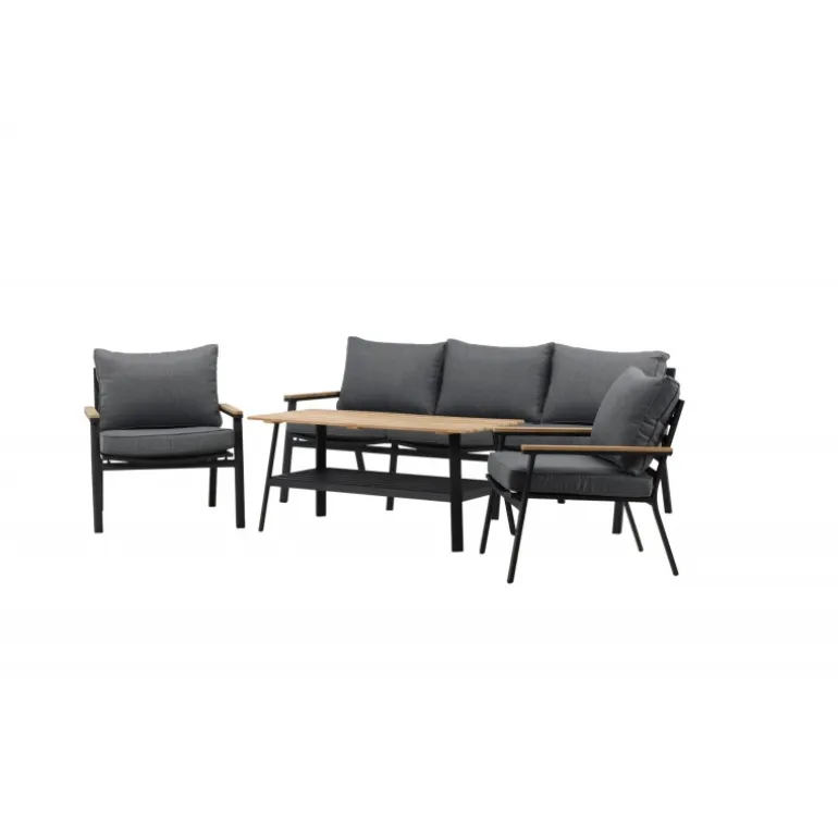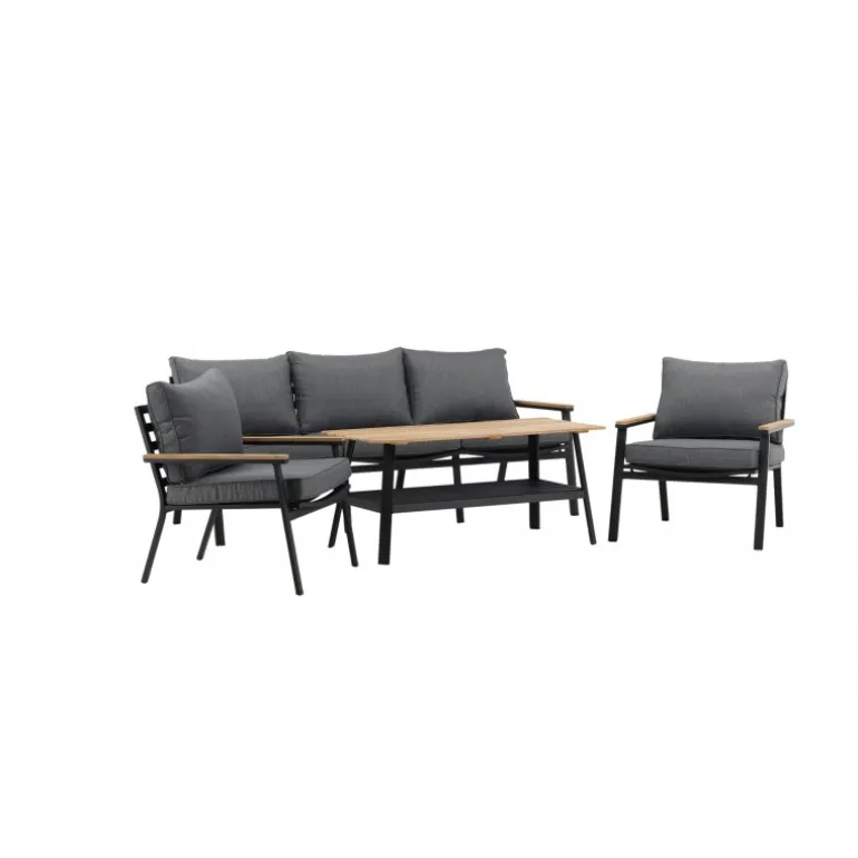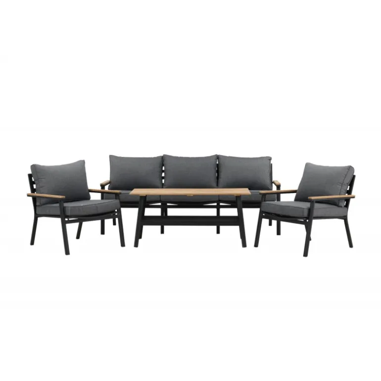 Oplev ultimativ komfort og stil med vores Brasilia Sofa Sæt. Dette moderne og stilfulde sæt inkluderer en tre-personers sofa, to ramme lænestole og et sofabord, komplet med grå puder. Sofaen og lænestolene har en ramme lavet af sort pulverlakeret metal med integrerede armlæn med teakdetaljer. Sofabordet har en ramme af sort pulverlakeret metal med en teakbordplade. Lettere samling kræves. Perfekt til enhver udendørs samtaleområde.