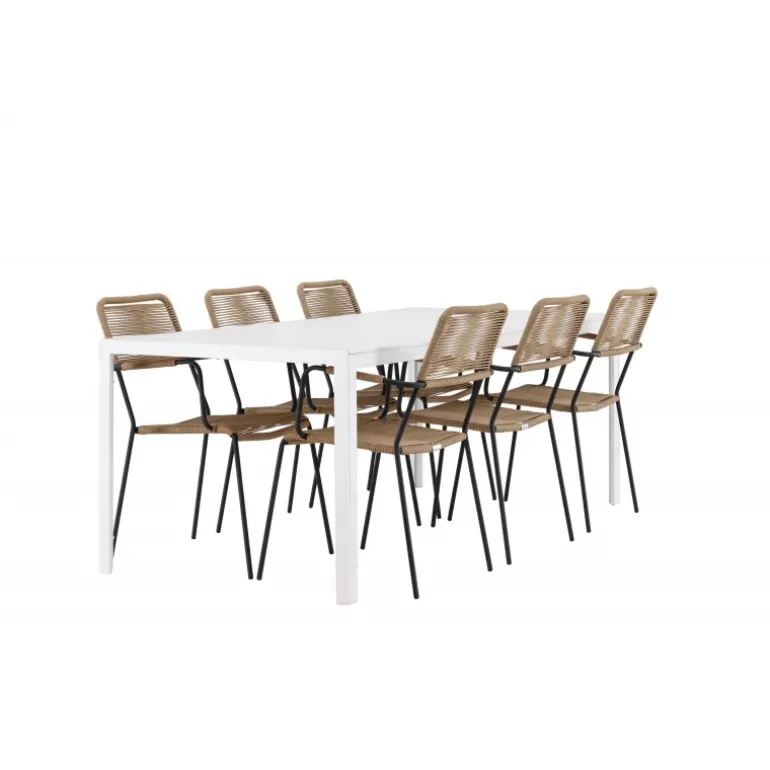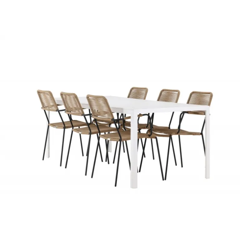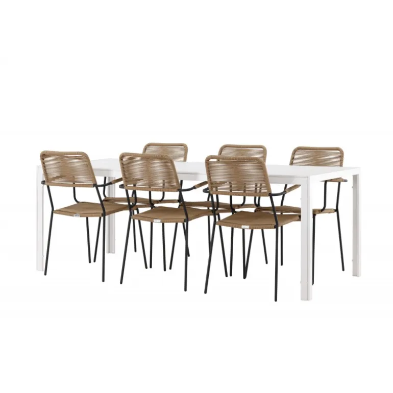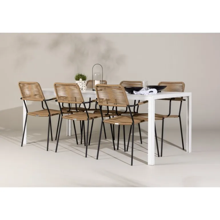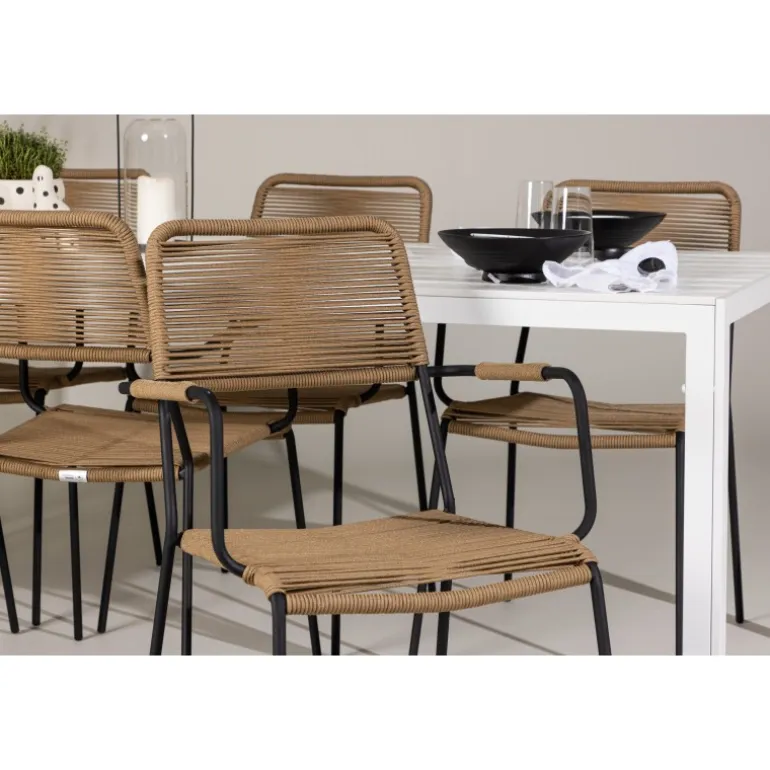 Oplev den perfekte kombination af rustik charme og trend-sættende design med vores eksklusive Loungesæt – Havemøbelsæt, komplet med seks elegante Lindos stole og det slanke Break bord. Dette ensemble er skabt til at fremkalde en varm følelse og skabe en indbydende atmosfære til sammenkomster med venner og familie. Lindos stolene, med deres brune reb sæder og sorte stålrammer, tilbyder både komfort og holdbarhed. Deres naturlige udseende tilføjer et rustikt touch til din udendørs plads. Break bordet fungerer som det perfekte midtpunkt for din udendørs spiseoplevelse, med en hvid aintwood bordplade og en aluminiumsbase, der udstråler moderne elegance. Med generøse dimensioner på 205×75 cm, er det komfortabelt til at rumme seks personer til hyggelige udendørs sammenkomster. Dette Loungesæt – Havemøbelsæt er mere end blot et funktionelt udendørs møbel; det er et symbol på fællesskab og sammenhold. Skab minder og nyd hvert øjeblik med vores varme og trend-sættende Lindos og Break Loungesæt – Havemøbelsæt.