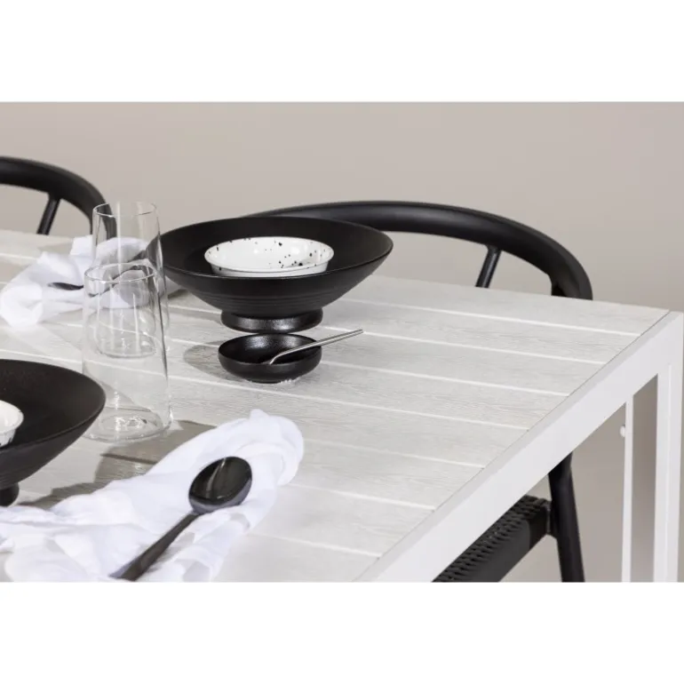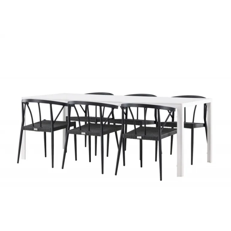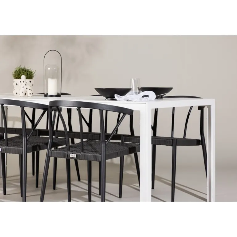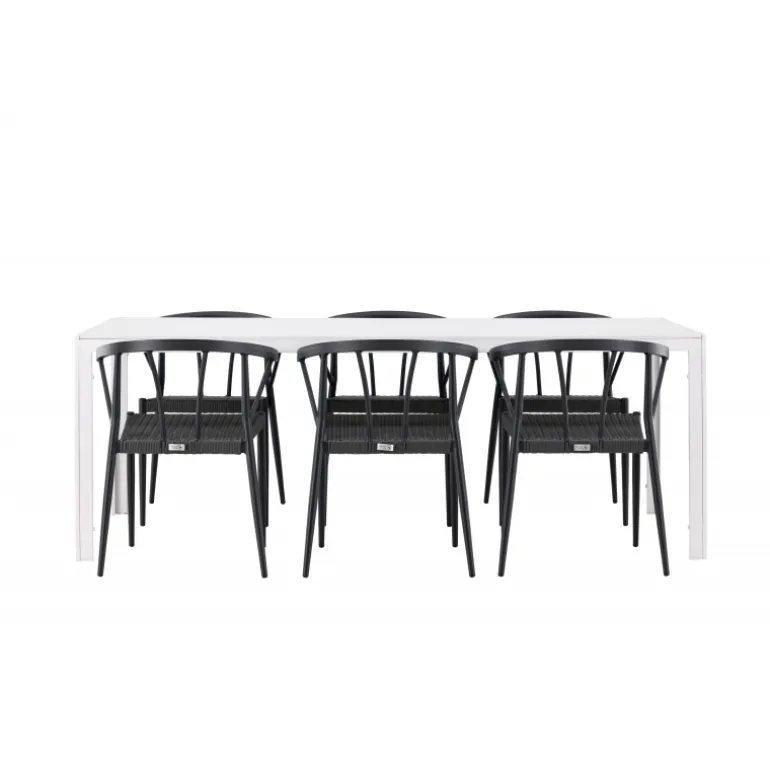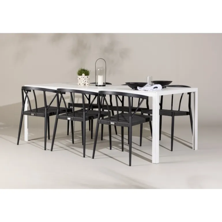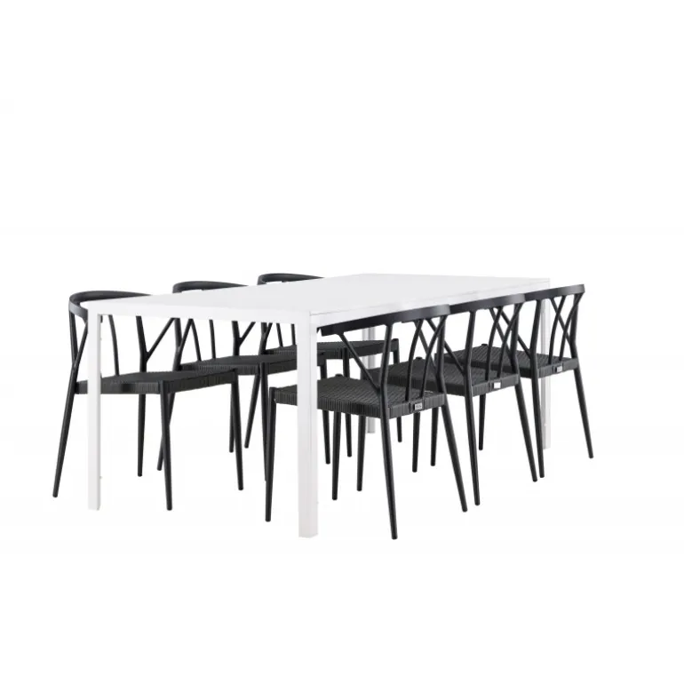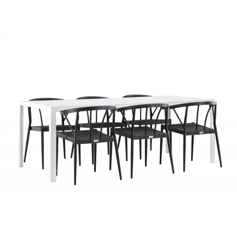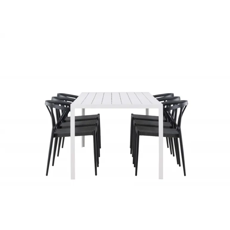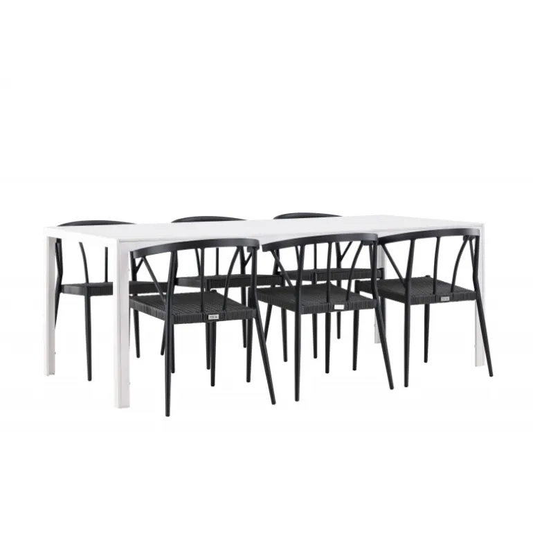 Oplev det perfekte samlingssted for fællesskab og stil med vores nye Loungesæt – Havemøbelsæt – Stina og Break. Med et imponerende design og en neutral følelse vil dette ensemble løfte dine udendørsområder til et nyt niveau. Stina-stolene kombinerer elegance og komfort. Med en sort farve og sæder lavet af syntetisk rattanmateriale tilbyder de både stil og komfort. Stolens ramme er lavet af aluminium, hvilket giver stabilitet og et moderne touch til det overordnede design. Break-bordet er midtpunktet i dette Loungesæt – Havemøbelsæt. Med en hvid bordplade lavet af aintwood-materiale og en aluminiumsramme skaber det et imponerende og slankt udseende. Med målene 205×75 cm tilbyder det masser af plads til seks personer, perfekt til at samle dine kære til måltider og samtaler udendørs. Dette Loungesæt – Havemøbelsæt er ideelt til udendørs brug og fungerer som en stilfuld erklæring og indretningsdetalje med sin imponerende tilstedeværelse. Med seks inkluderede stole er dette sæt komplet til at skabe mindeværdige øjeblikke og løfte dit udendørsområde til et nyt niveau af stil og komfort.
