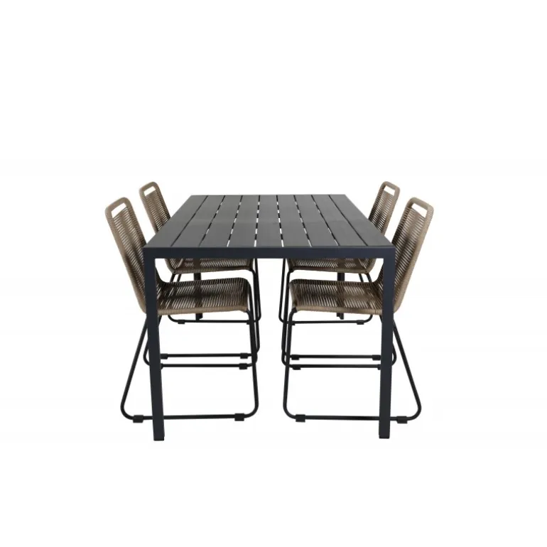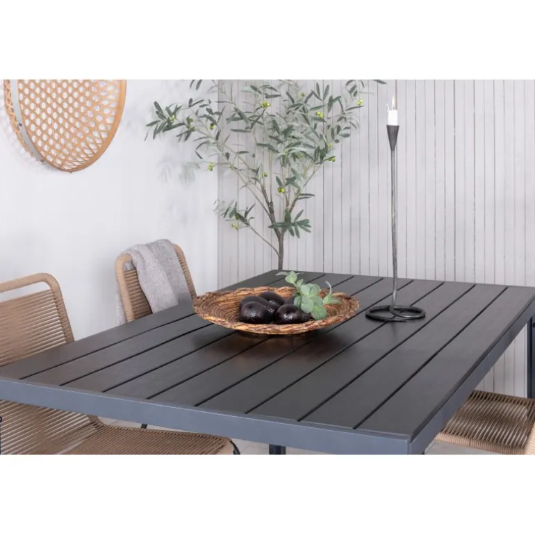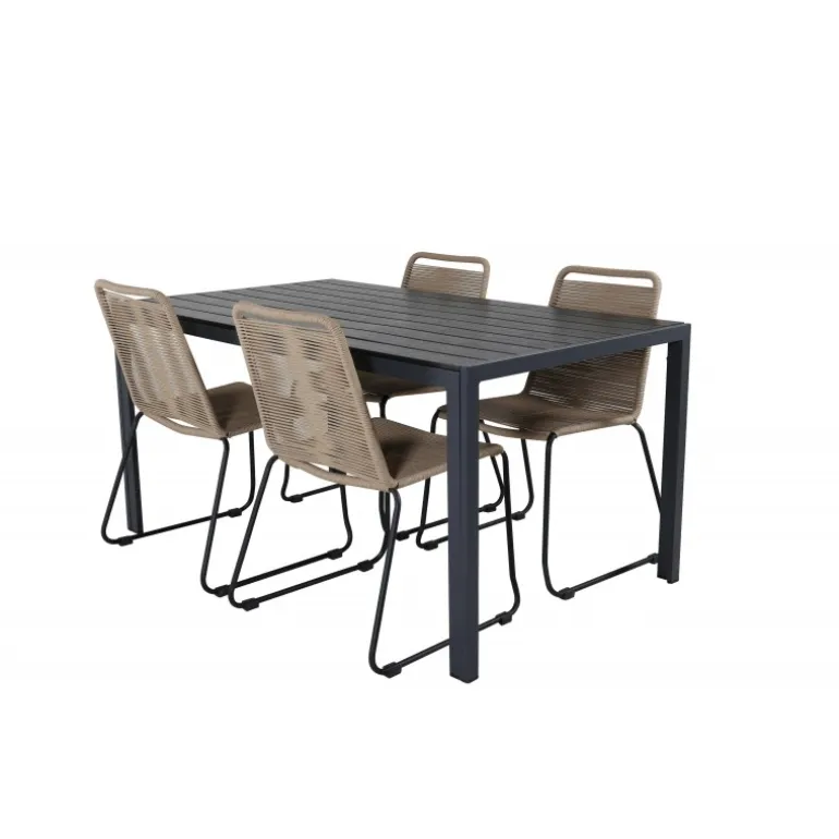 Vores rektangulære Loungesæt – Havemøbelsæt Break har et klassisk design med lige nordiske former. Bordpladen er i sort krydsfinér og aluminiumsstel. Sammen med de trend-sikre spisebordsstole fra Lindos-serien i jordnære farver. Stolene er stabelbare for praktisk opbevaring og lavet i en slank, sort aluminiumskonstruktion med en beige sæde i flettet reb. Inviter til mange sociale øjeblikke fremover!