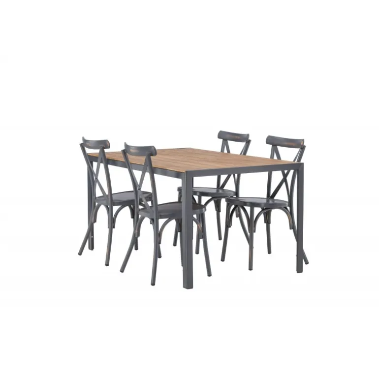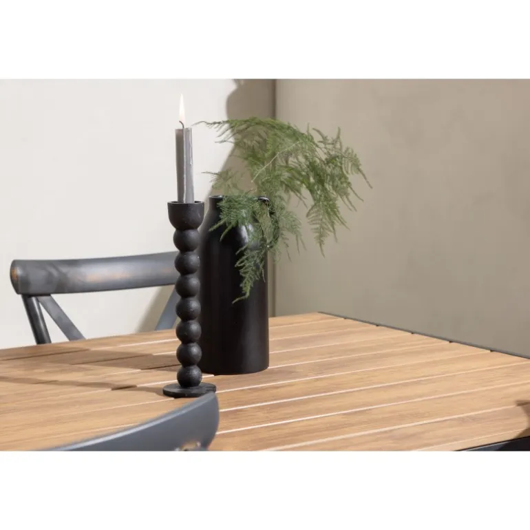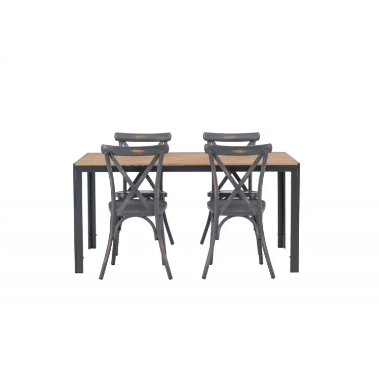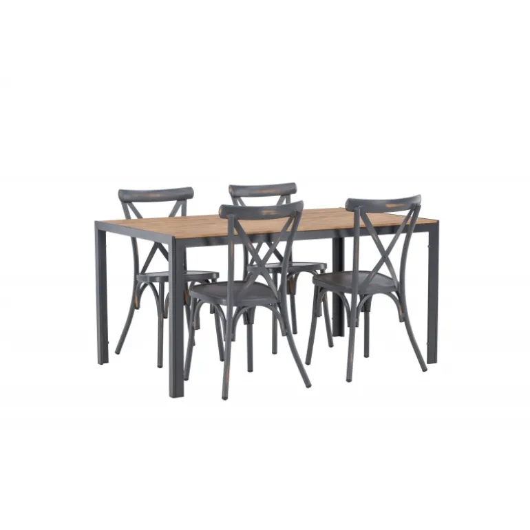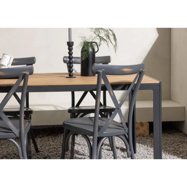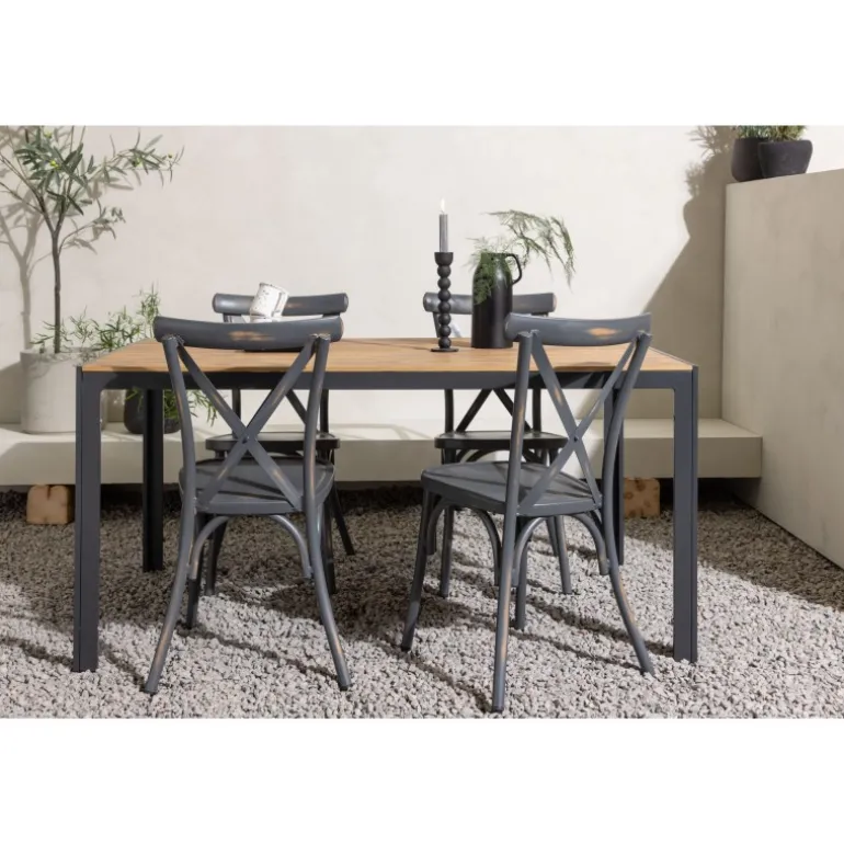 En Loungesæt – Havemøbelsæt med en fantastisk skandinavisk design! Vores rektangulære spisebord Break har lige former i klassisk nordisk design med en bordplade i aintwood og bordben i sort aluminium. Her i stilfuld kombination med 4 spisestole fra serien Tablas. Stolen har en industriel stil og er lavet af holdbart aluminium i en sodet sort farve. Indret i udestuen eller på terrassen for at nyde fremtidige måltider udendørs! Bordmål: 150×90.