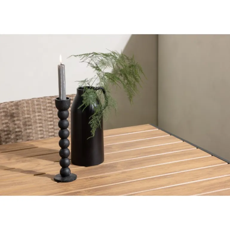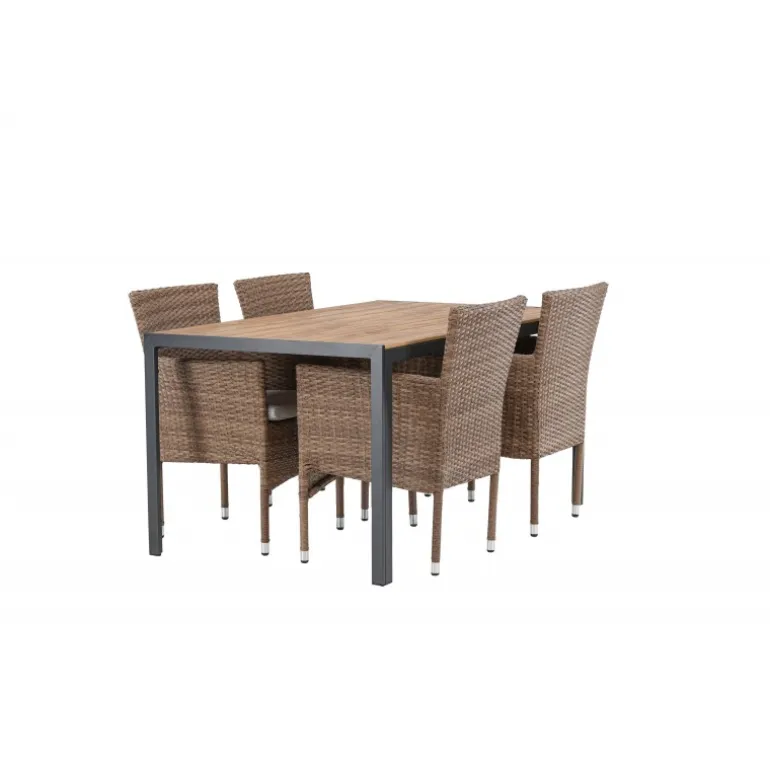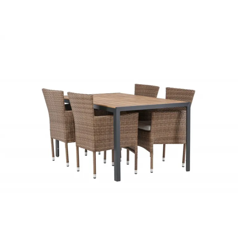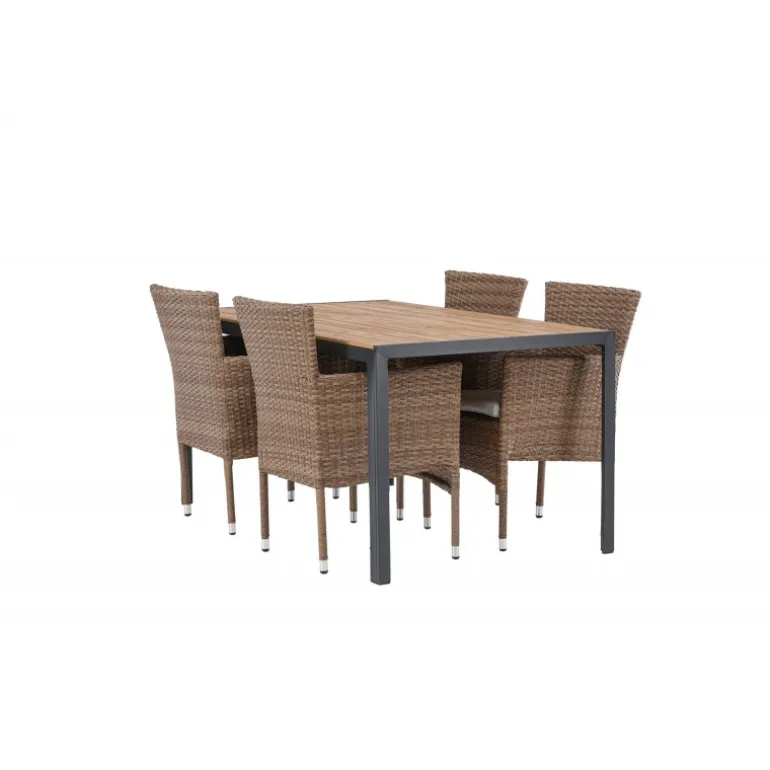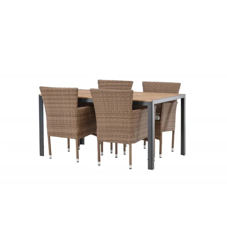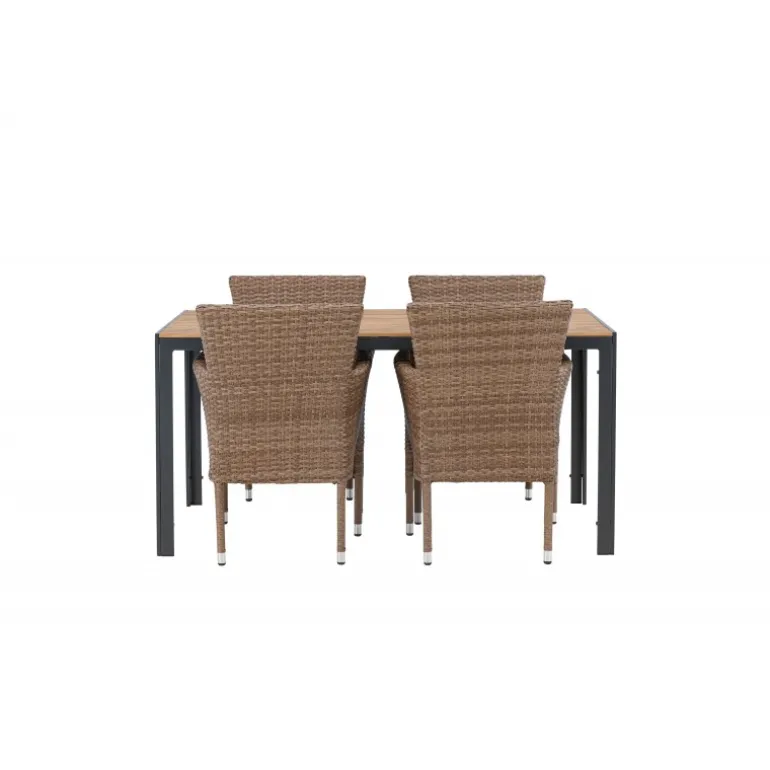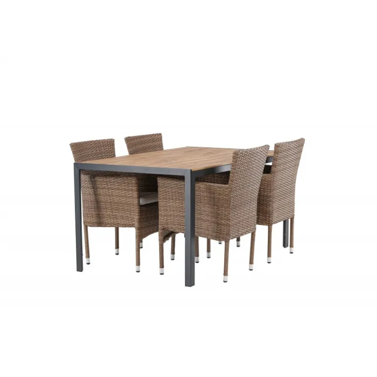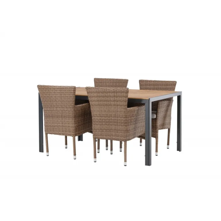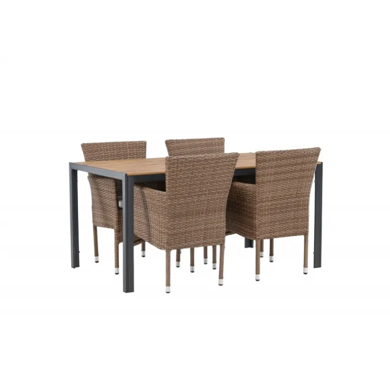 Dette Loungesæt – Havemøbelsæt imponerer med sit trend-sikre design og høje komfort! Vores rektangulære spisebord Break har lige linjer i klassisk nordisk design med en bordplade i aintwood og bordben i sort aluminium. Spisebordsstolene tilhører Malina-serien og er garanteret at stå tidens prøve. Stolen har en ramme i aluminium og er polstret i fletflettet, beige kunstig rattan. Inviter til mange vidunderlige måltider udendørs i fremtiden! Bordmål: 150×90.